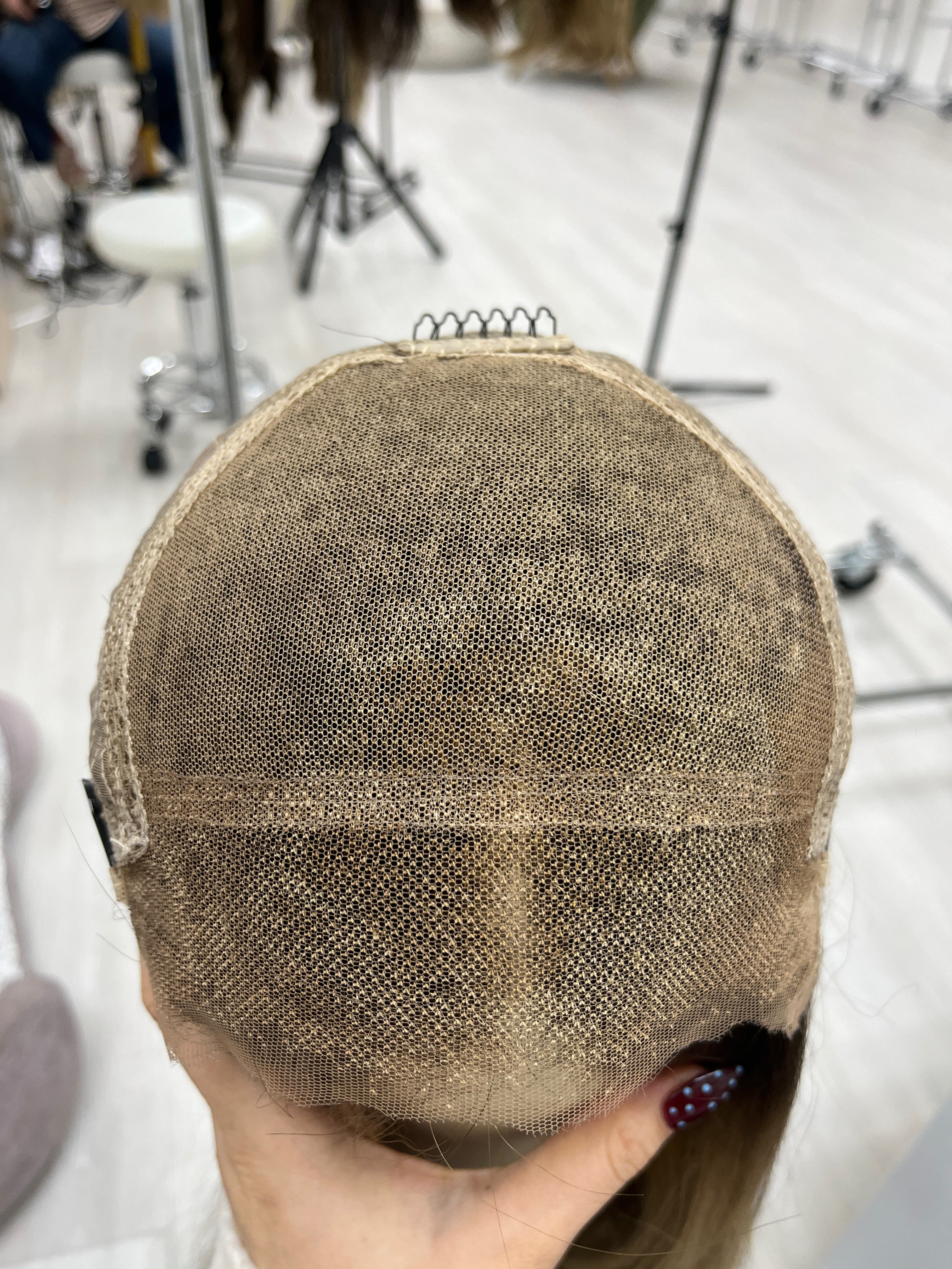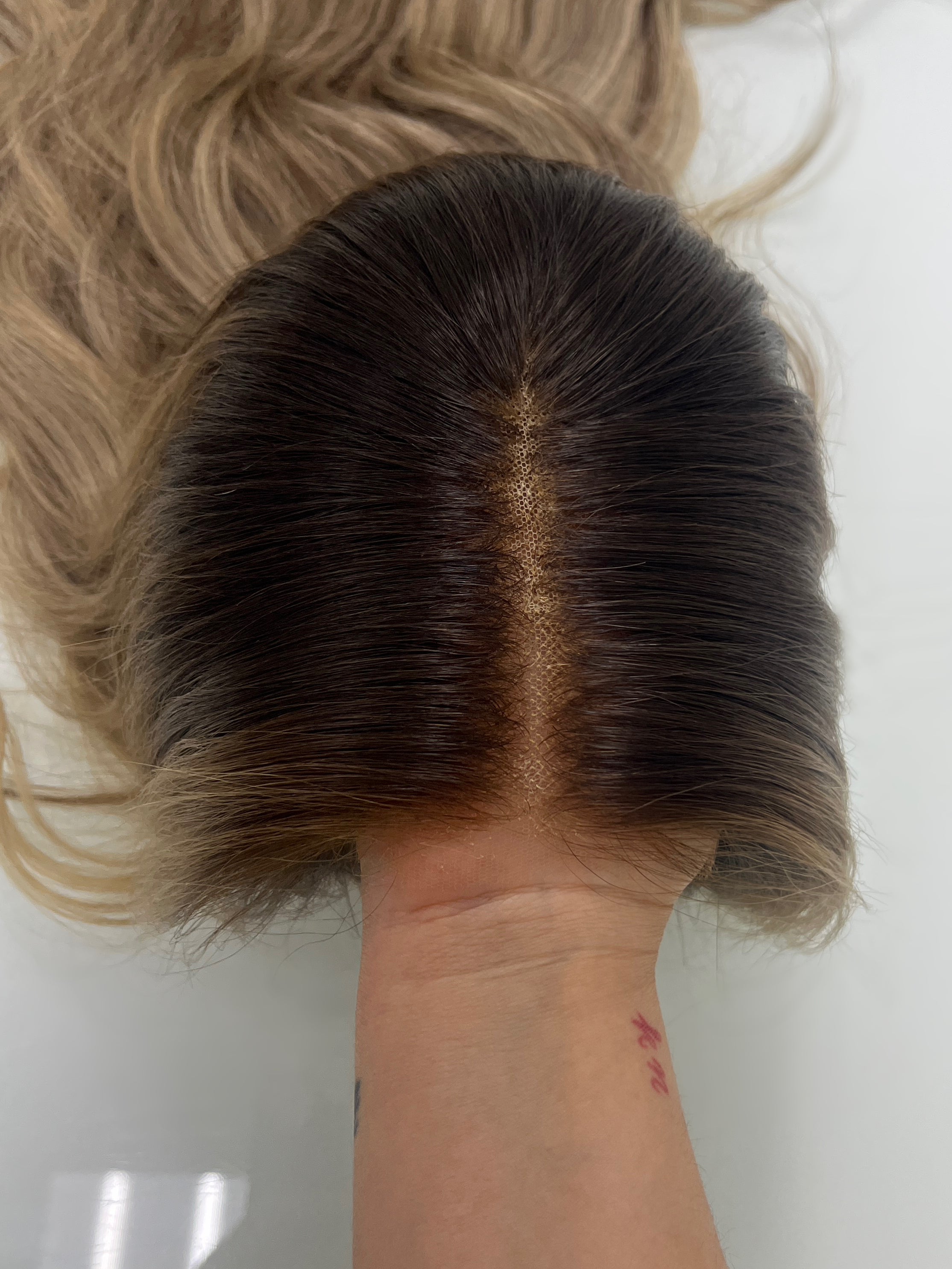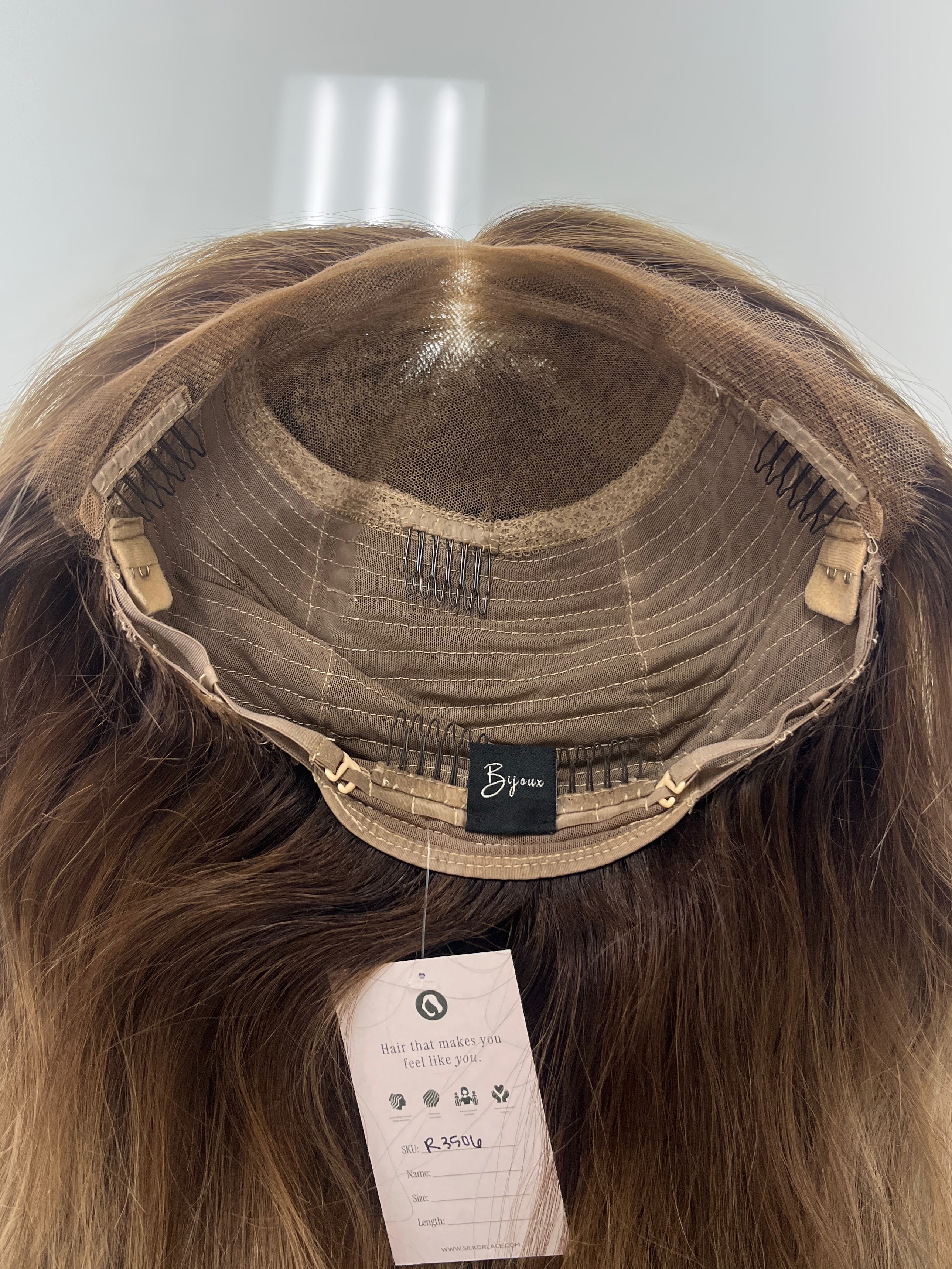 This is a stunning mermaid length dimensional blonde lace top wig from Bijoux Wigs in a RARE size large find! With Bijoux's coloring technique - the knots are naturally a light almost white color and are protected as they are not touched during the process. In general, this technique is ideal for those with light to fair skin tones. The hair is silky soft and in great condition!