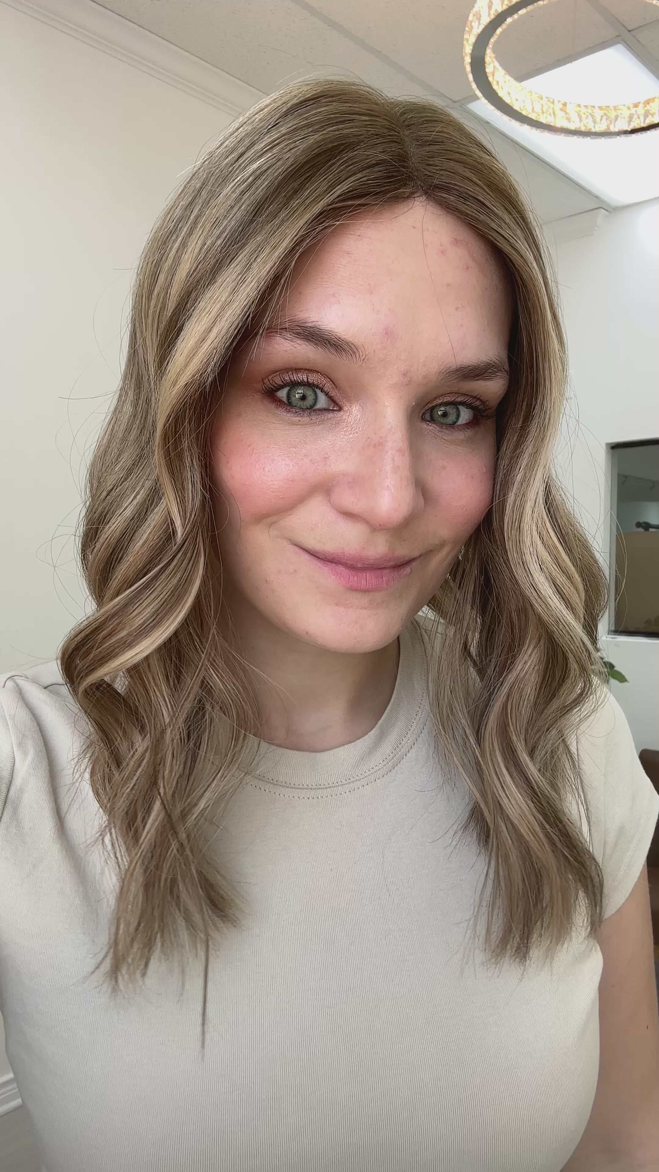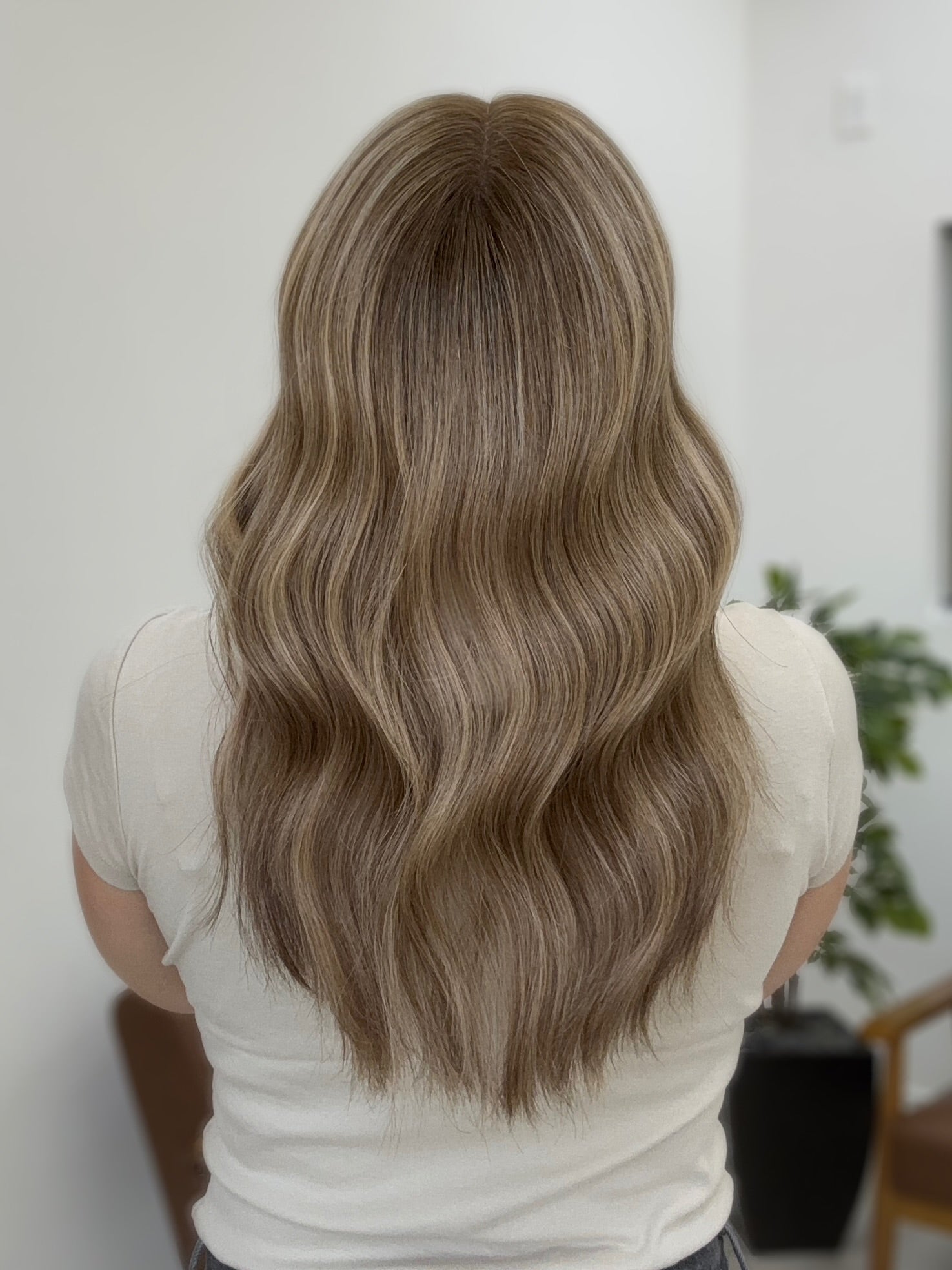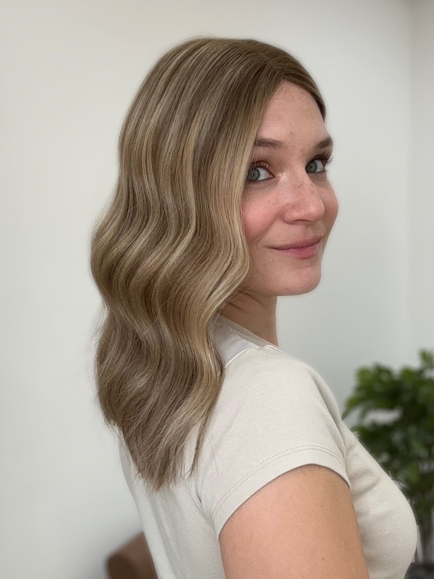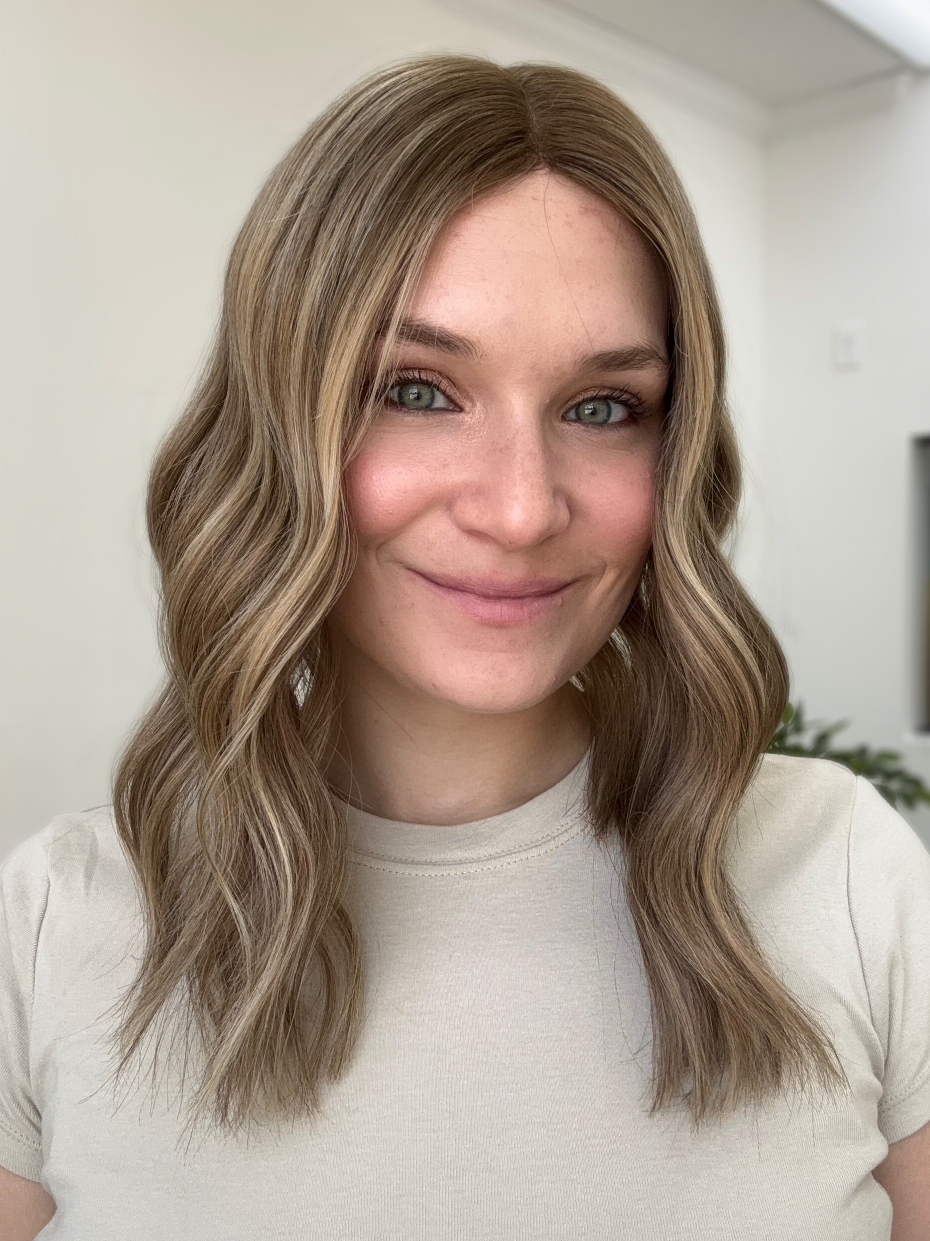 Janelle's favorite color is Calli, the blonde she wishes she could be without bleaching her hair! Janelle says, "I love the chunky dimensional highlights that give the piece a little bit of an edge and personality." The root is a little warmer than her cool toned brunette roots so we decided she could put a matching bright money piece in her own hair so she could still blend the topper together.