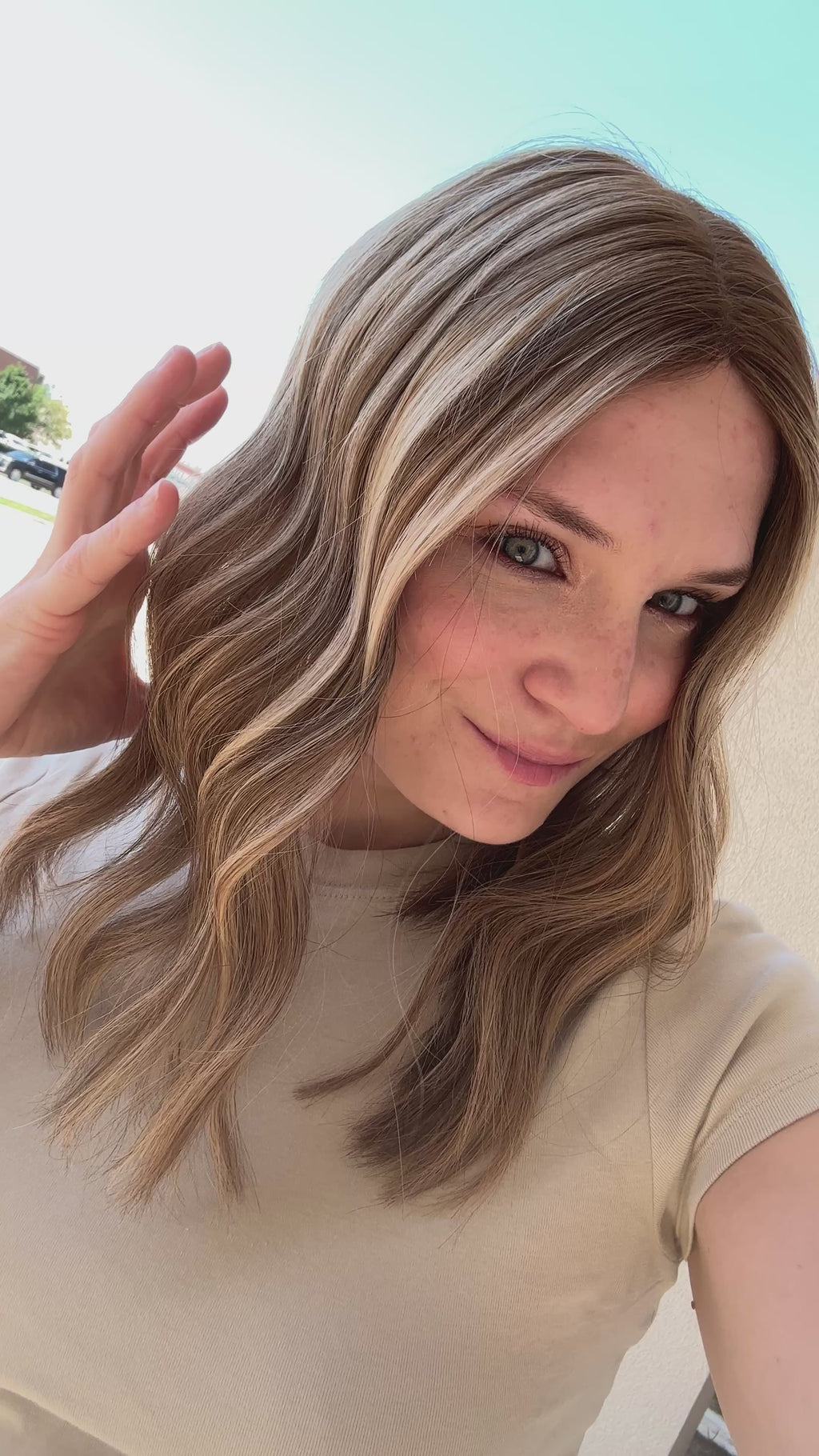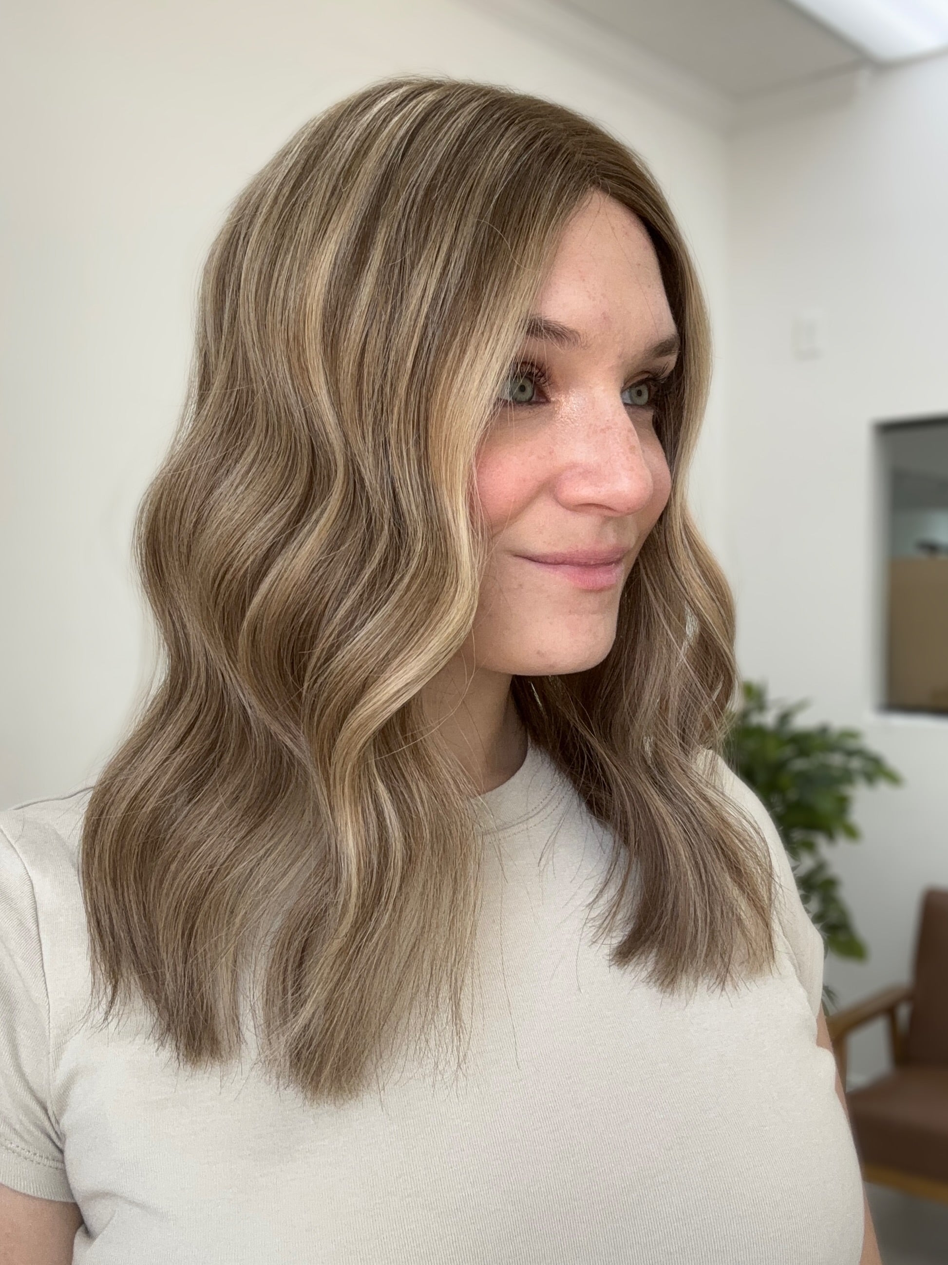 Color: Dimensional blonde highlights and lowlights, darkest base being closest to level 8