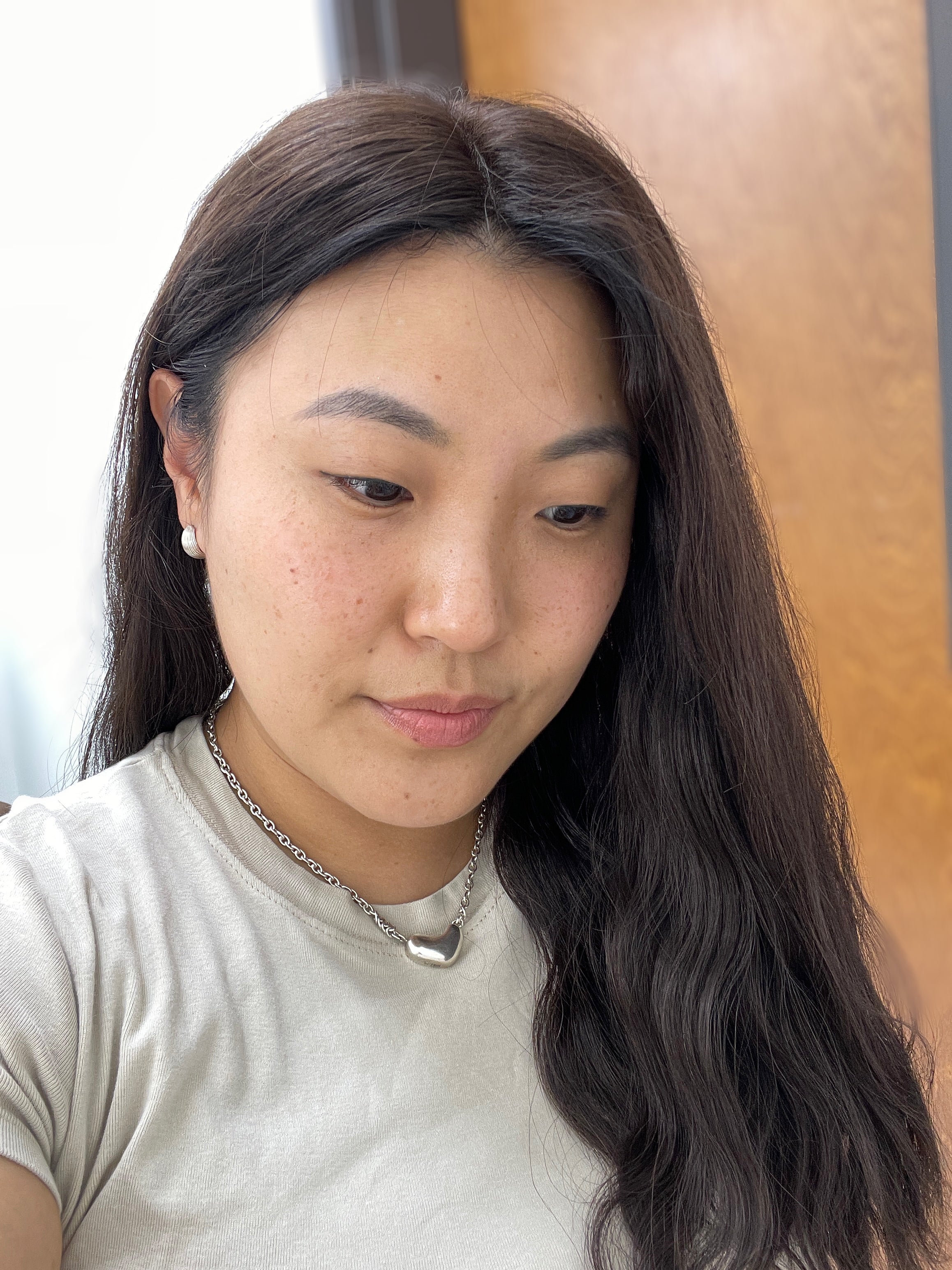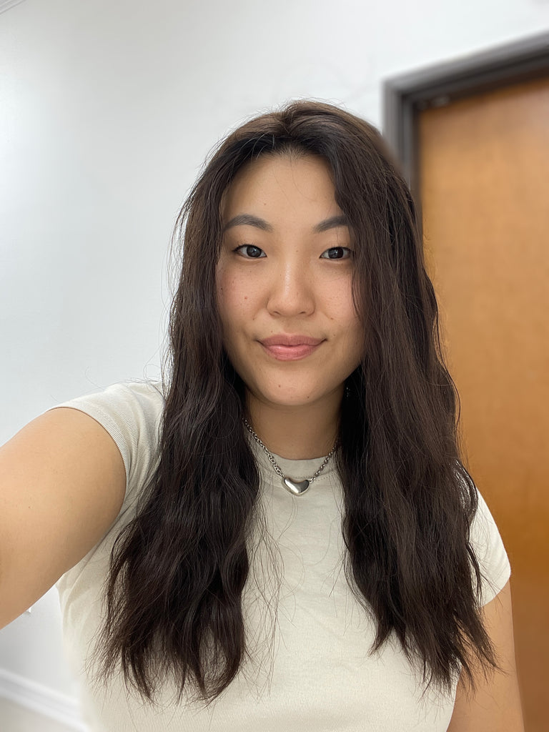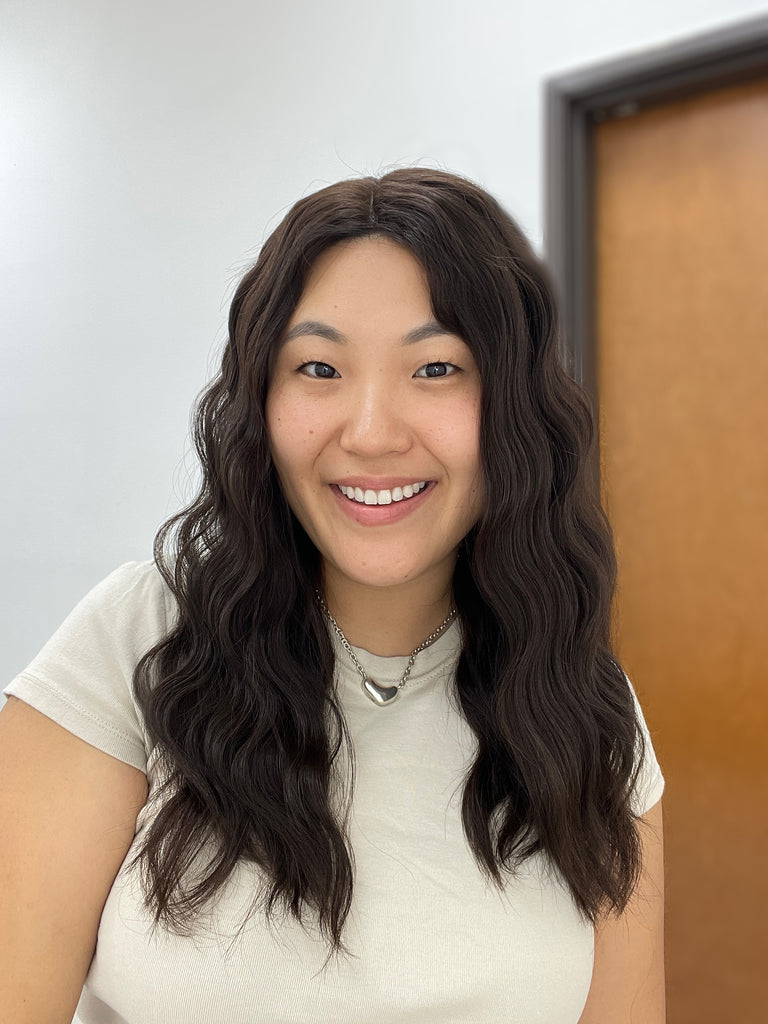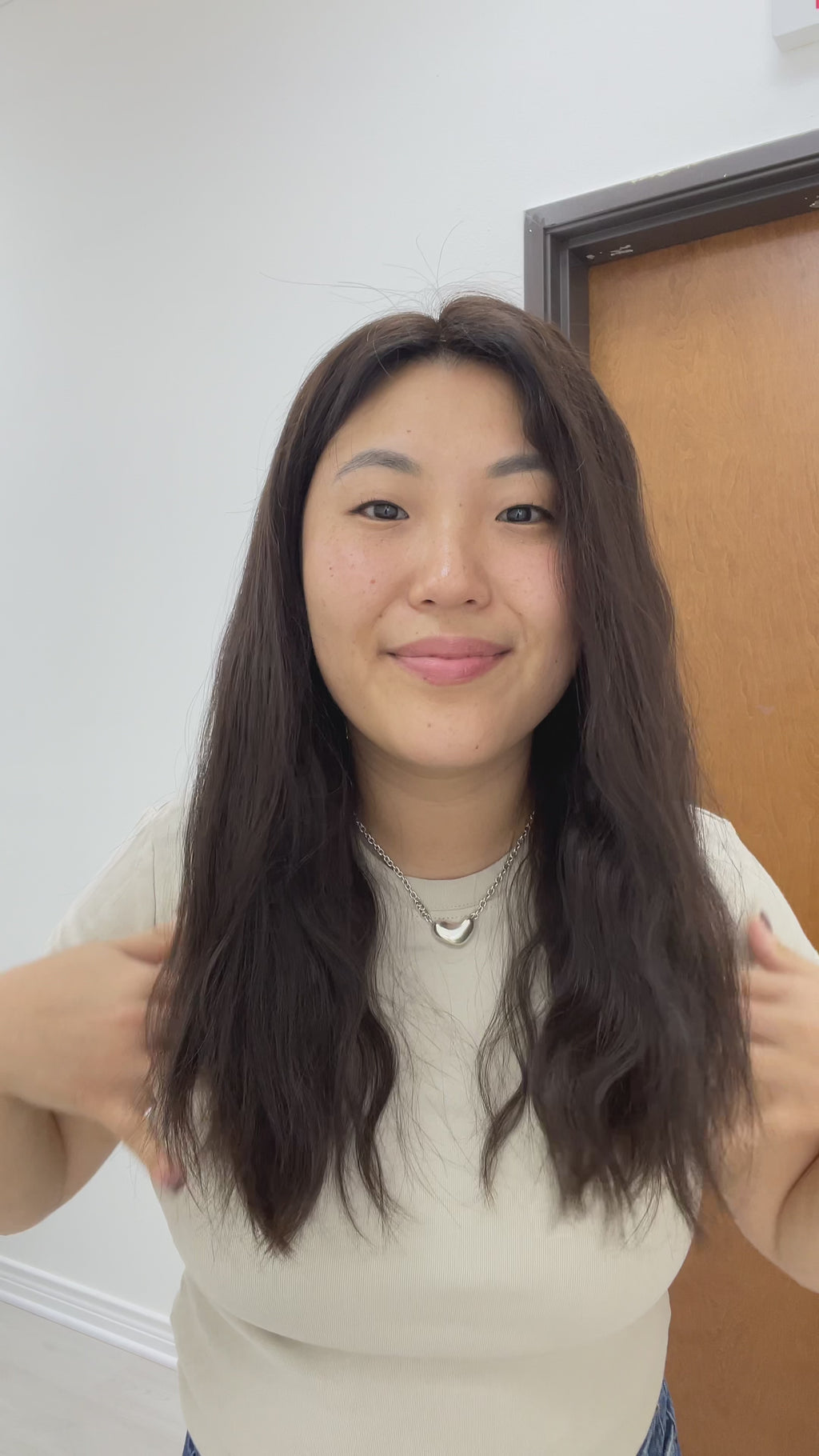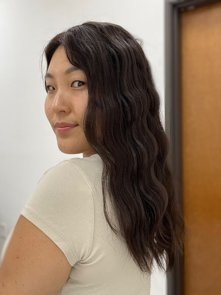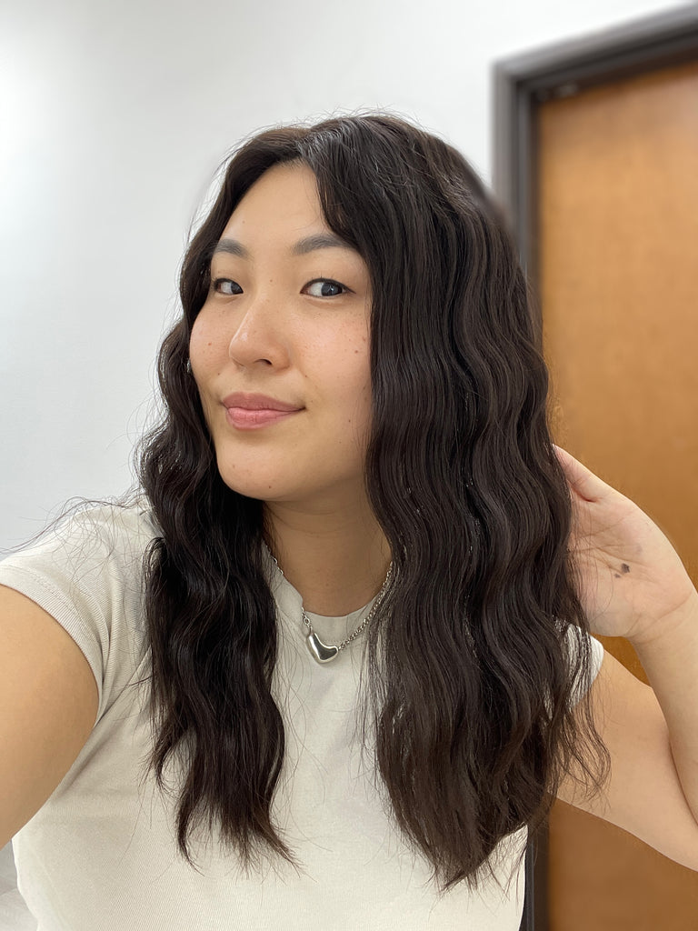 This Cho has been styled in two different ways, one with a crimper and the other with the "crimp" brushed out and slightly straightened. Both are the exact same piece that results in completely different vibes!