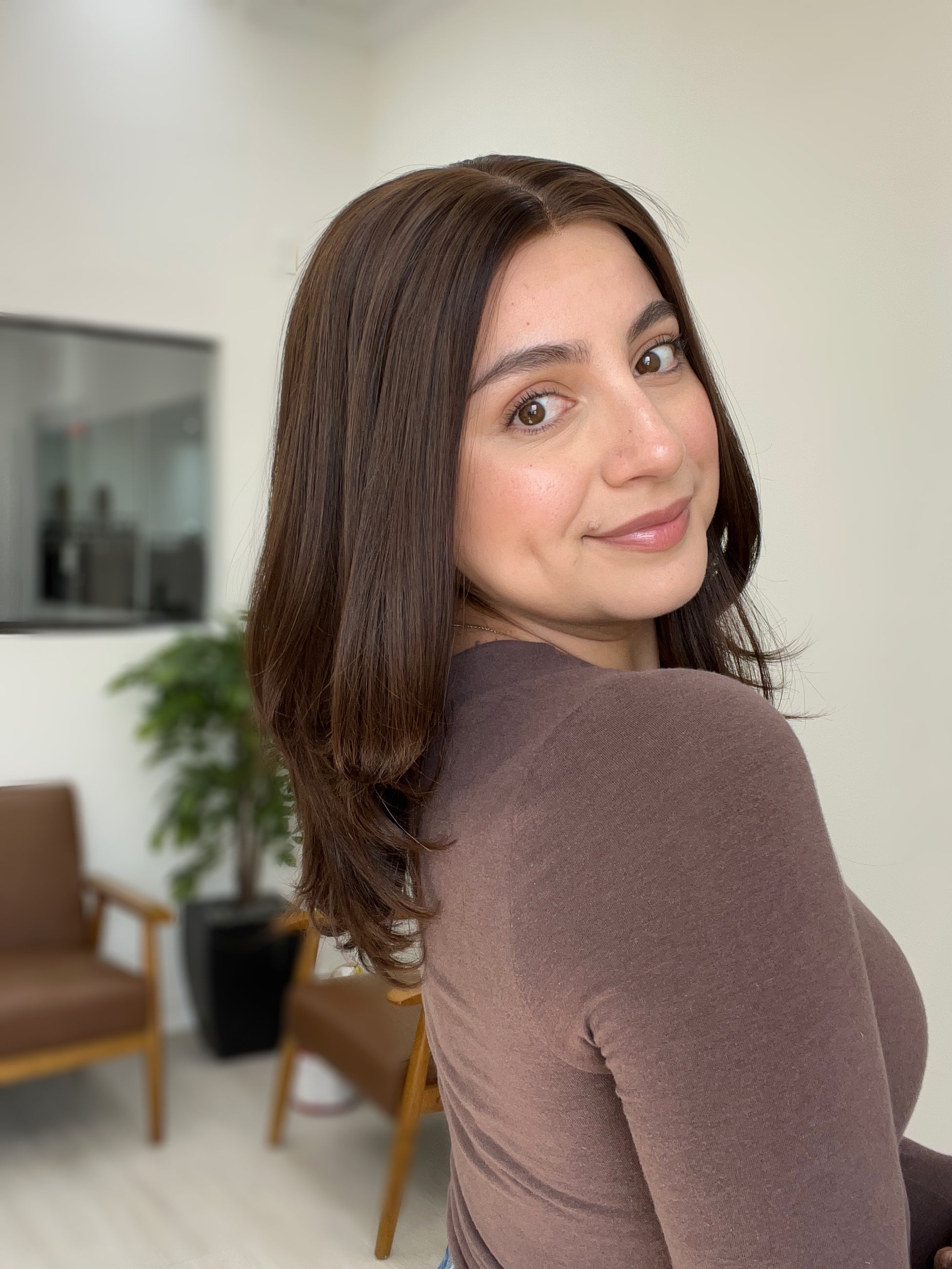 This is a great BRAND NEW find as Follea wigs usually range from $3000-$8000 depending on color, length and type! The lightweight density and fully hand-tied cap makes this piece feel very breathable and comfortable. Love the layers and mid length on this one.