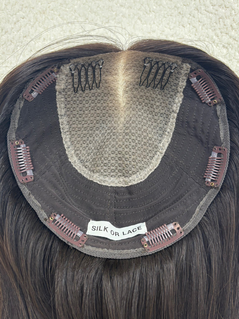 Silk or Lace Collection closed lace hair toppers function as your hair, but better! They are ultra low density, lightweight, and have a paper thin rim for an easy seamless, realistic blend for every day wear. Take note of our carefully designed details, such as our durable double lace, secure mini combs in front, and soft fine Brazilian hair!