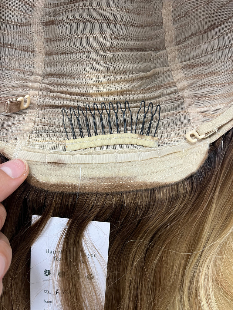 Other: Medium to medium high density (about 130-135%). Lace is cut very close to the hairline in a jagged method with a bit of fraying. Knots are bleached and plucked. There are some short hairs sticking out near the front of the hairline that are not noticeable when wearing. There is staining inside the cap that is not visible on the outside and does not affect the integrity of the piece. Light wear and tear on the nape comb.