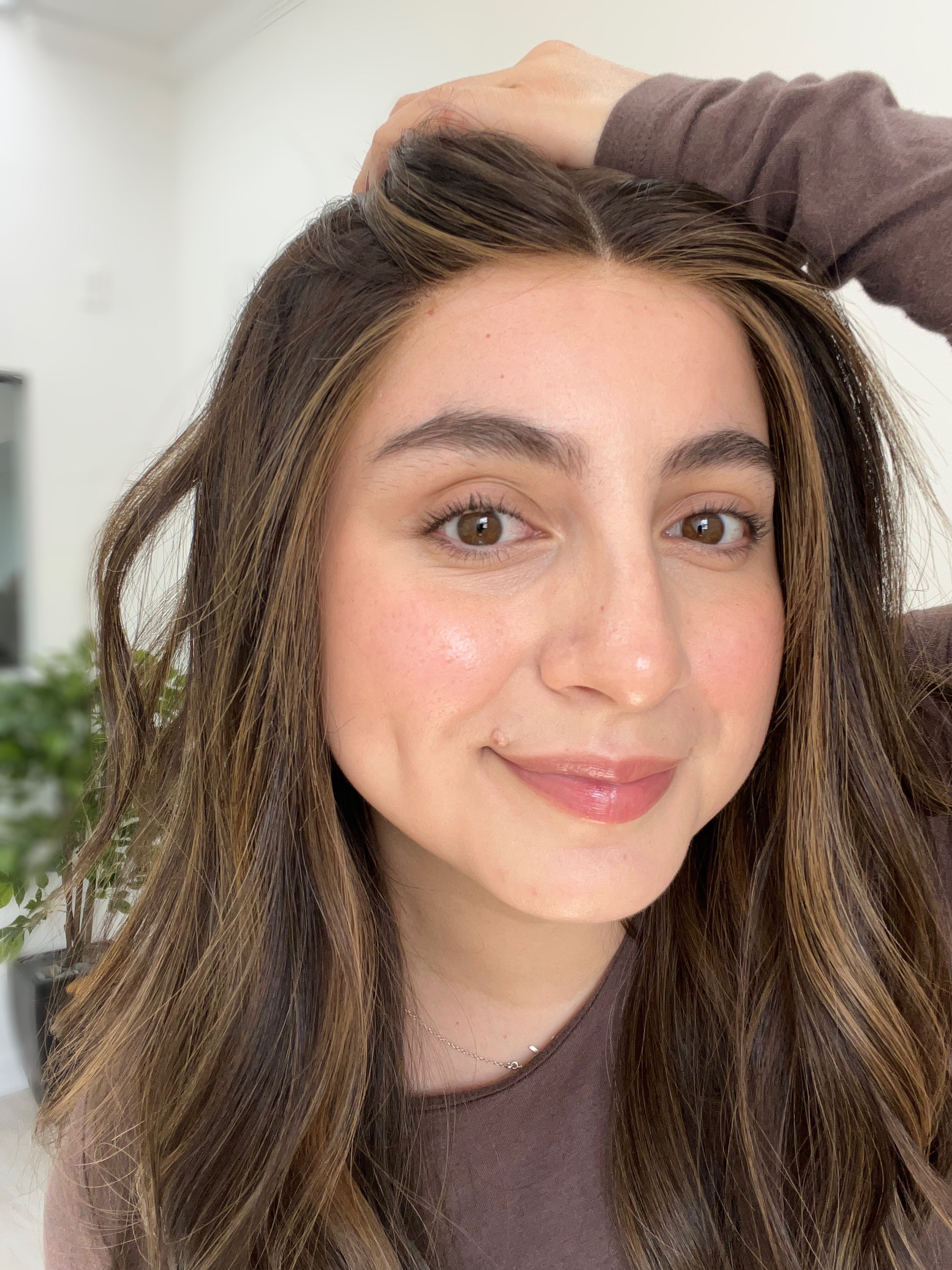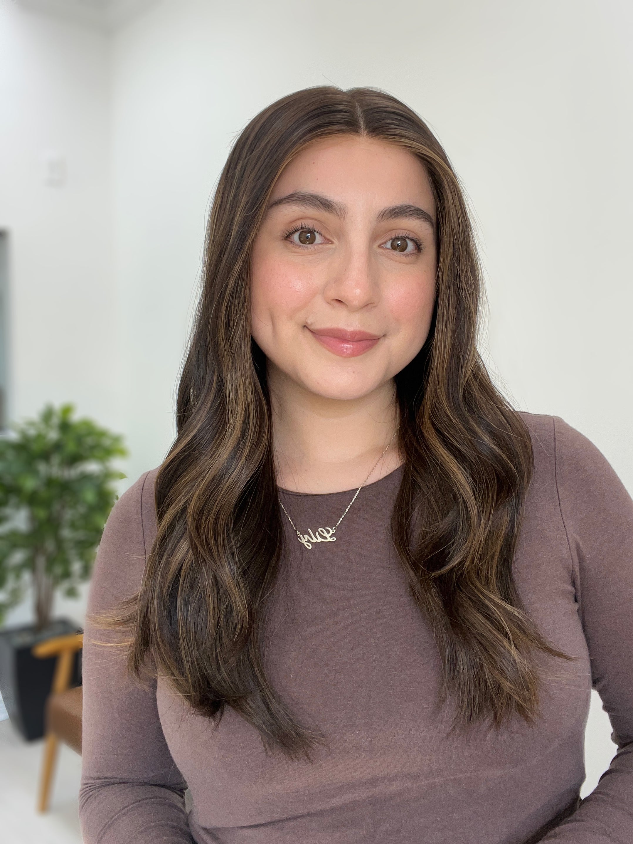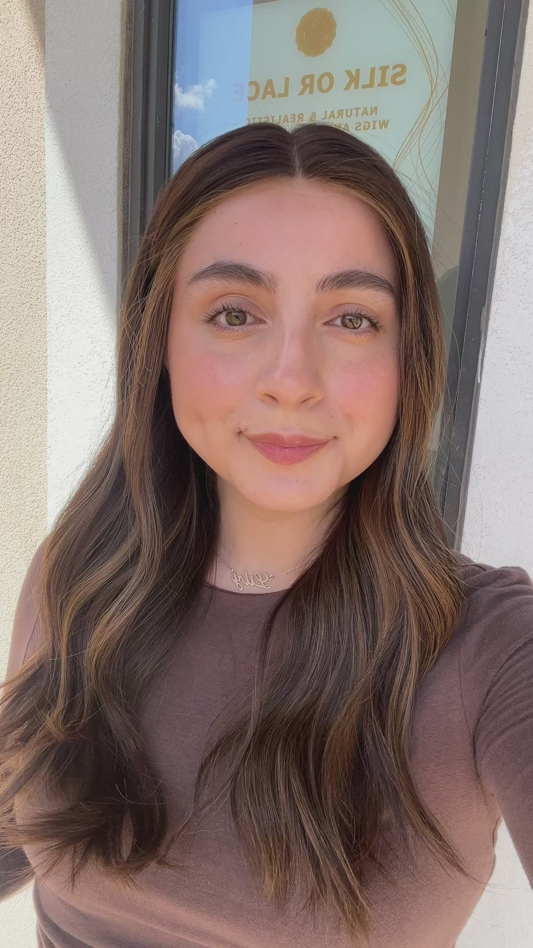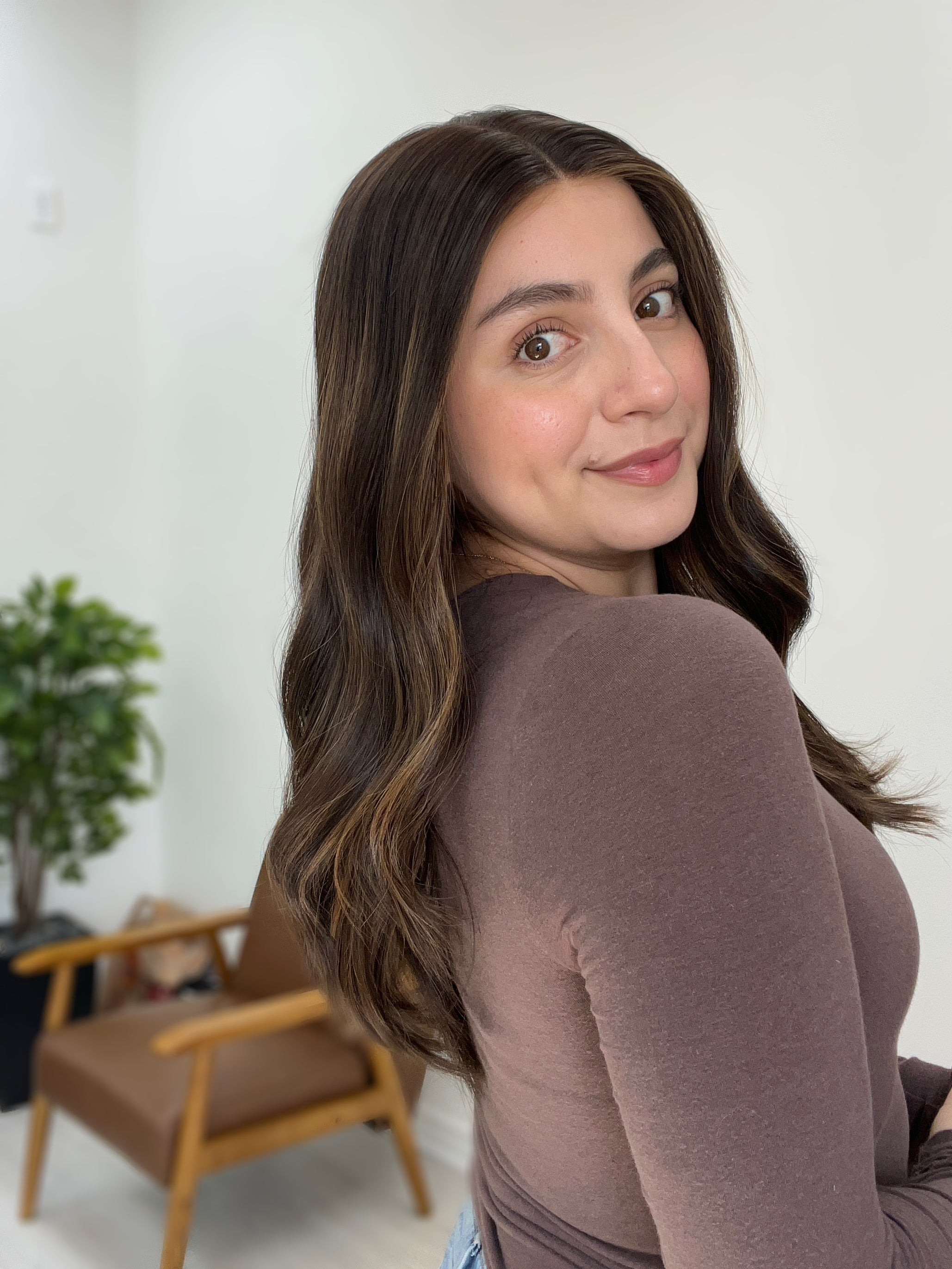 Color: Dark medium brown root and base with caramel balayage and face framing