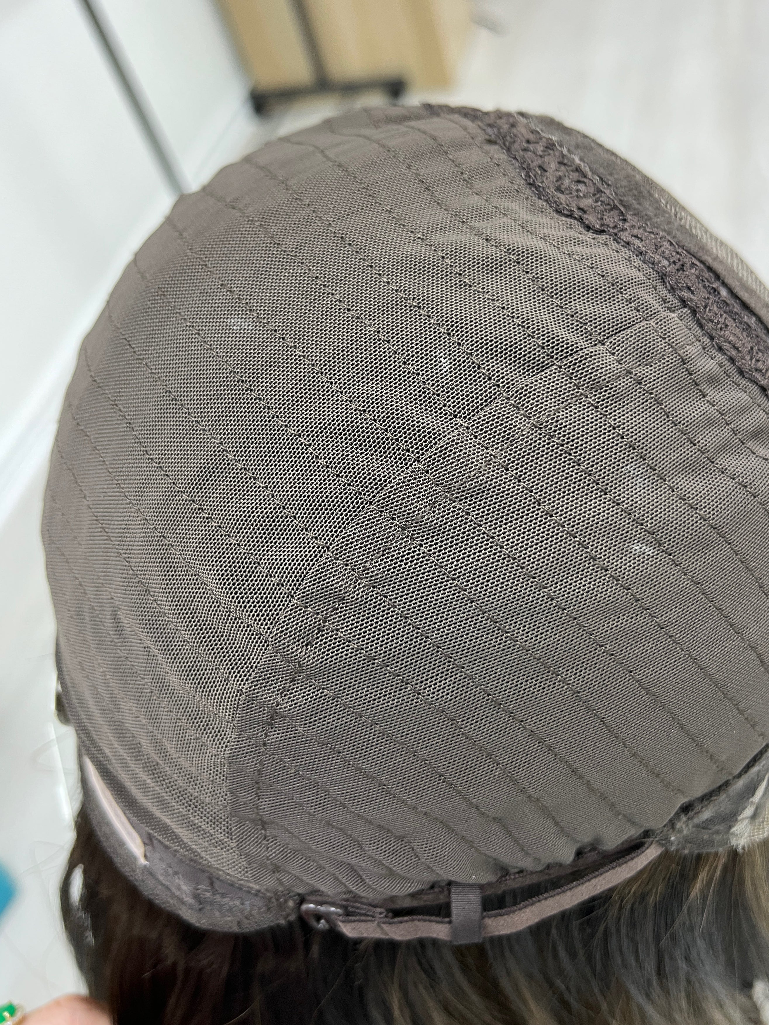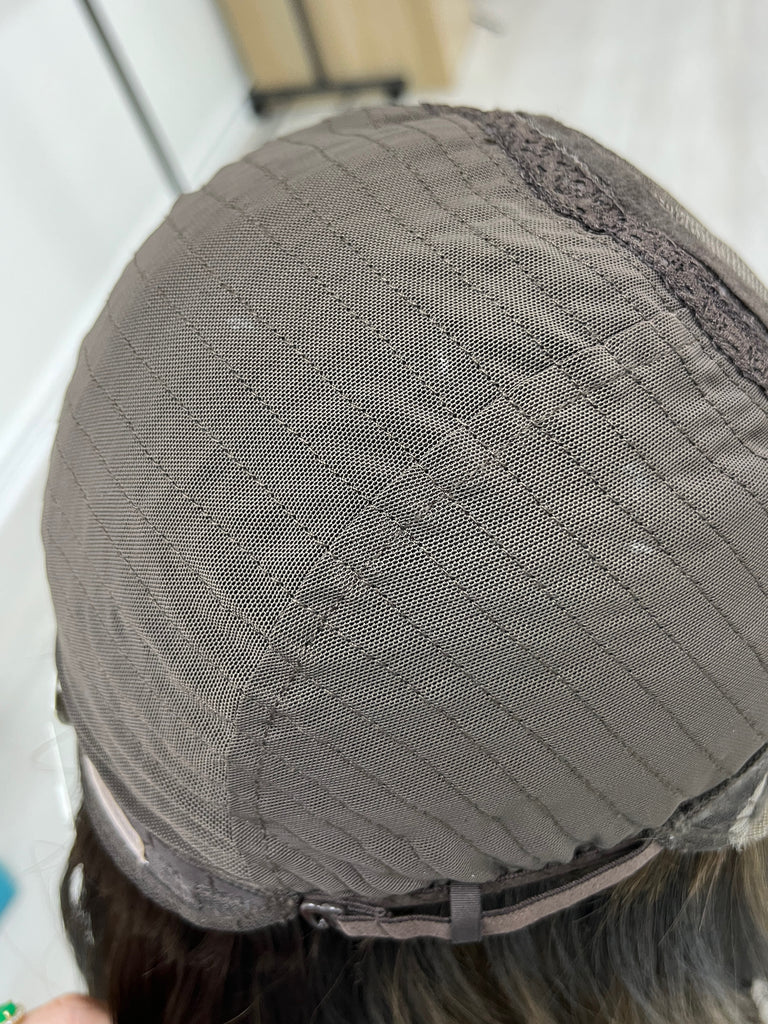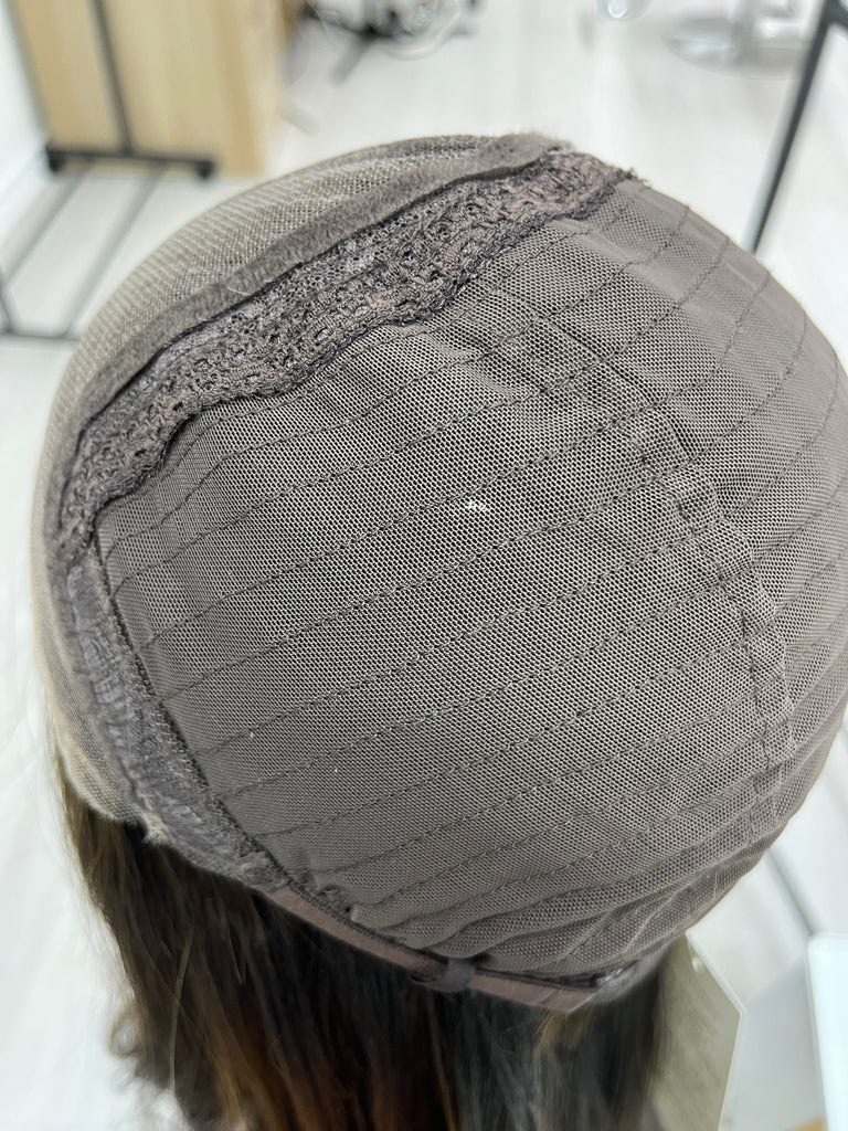 Other: Medium density (about 125-130%). Lace is cut fairly close to the hairline with a bit of room to further customize in a jagged method with a bit of fraying. Knots are naturally light about 1cm in the front of the hairline due to lighter face framing pieces. The rest of the knots are not bleached. There is light knot fallout on one side of the hairline (not visible when wearing). Light staining in some areas inside the cap that are not visible on the outside and do not affect the integrity of the piece.