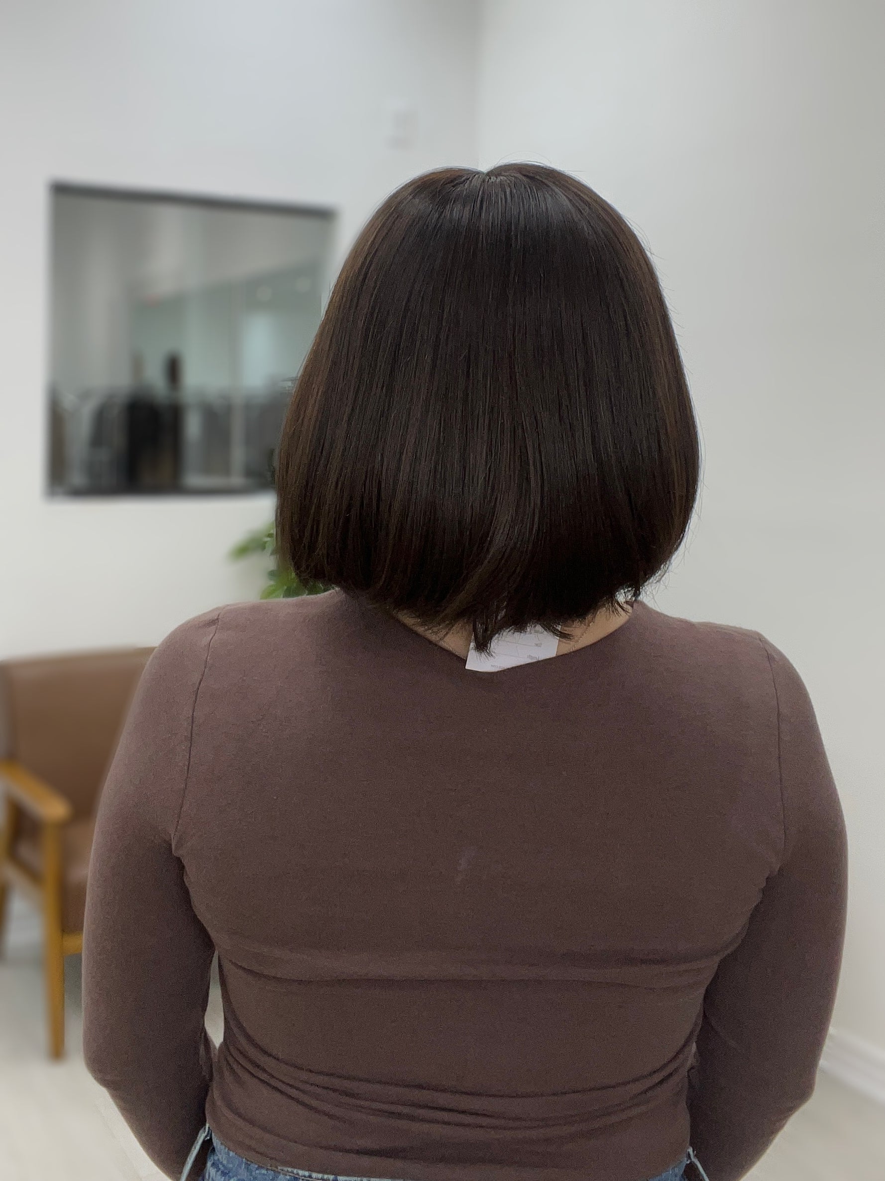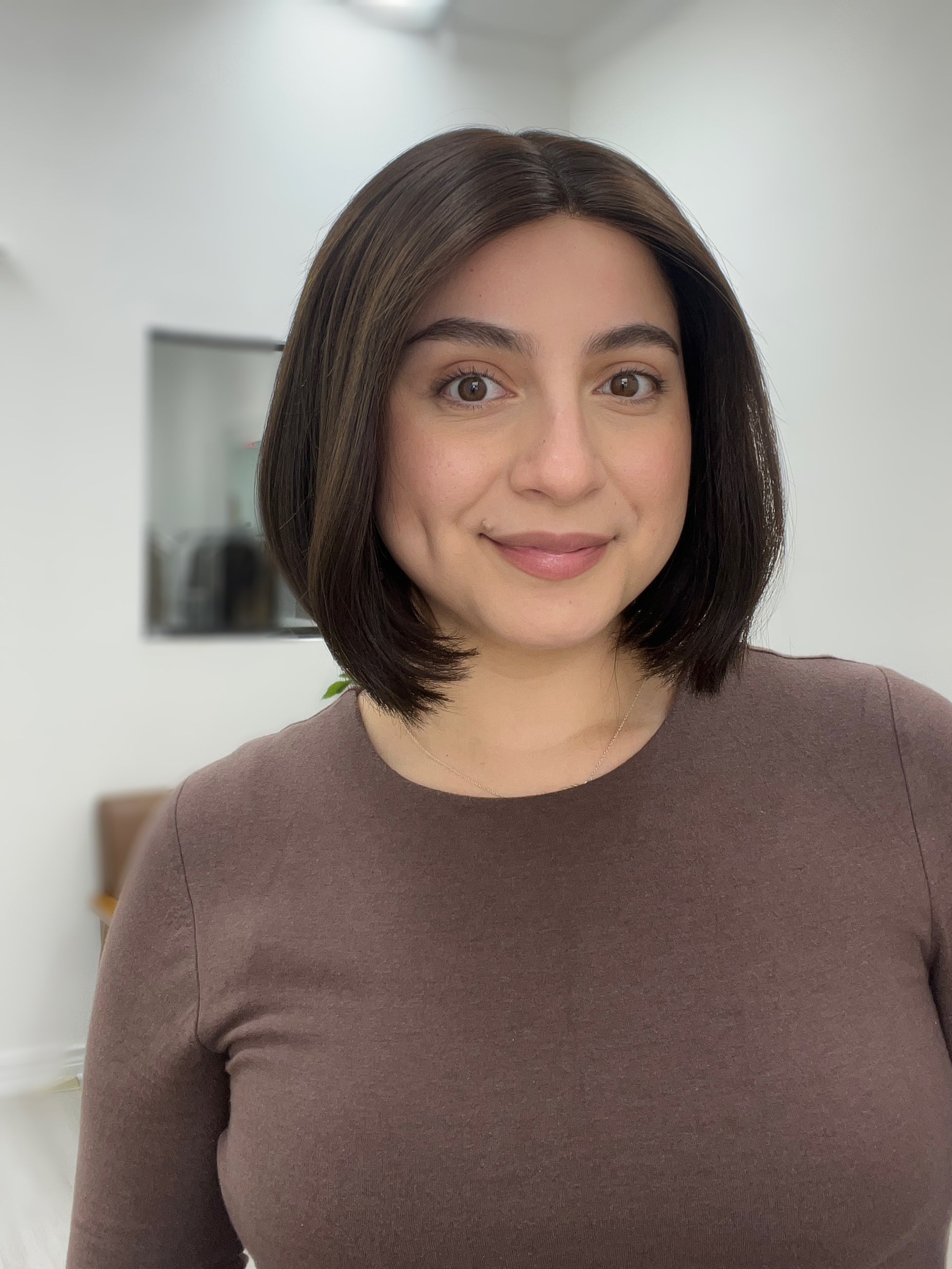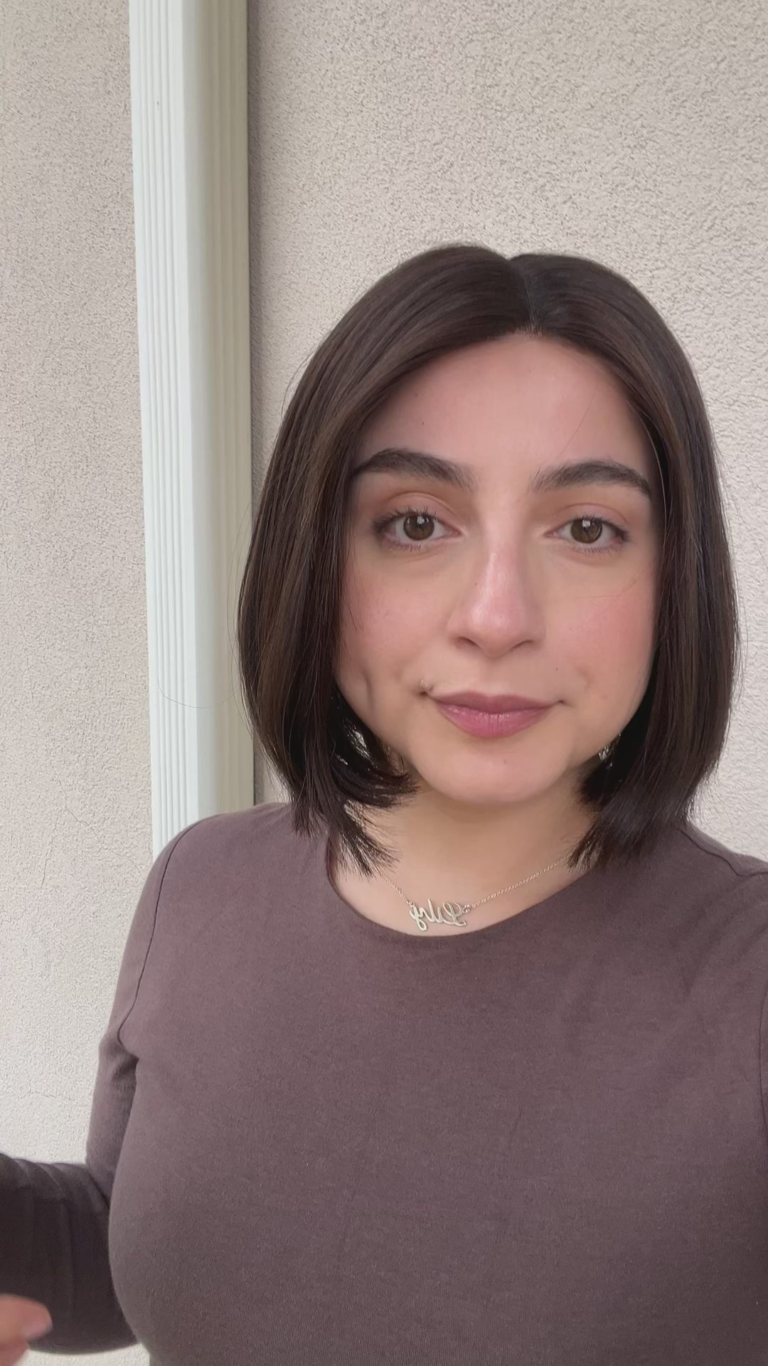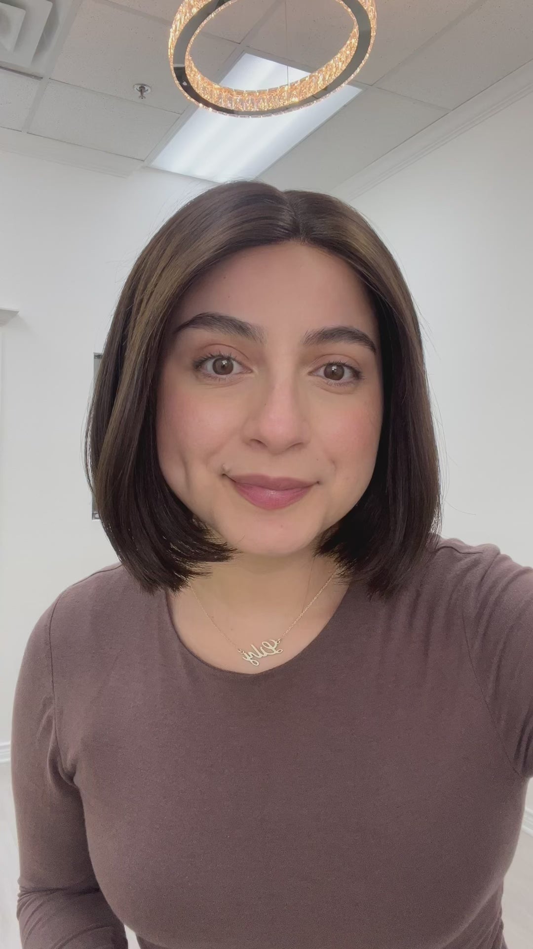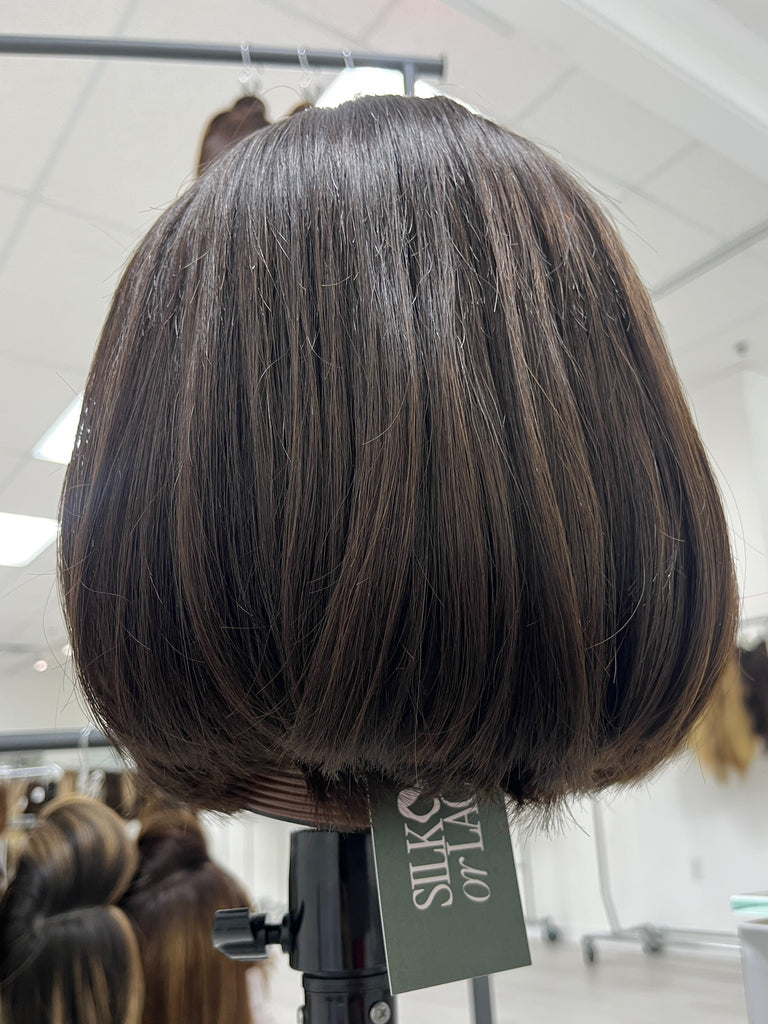 A super chic short bob in a classic brunette color! Beautiful condition overall, fits true to size and has an ultra light density.