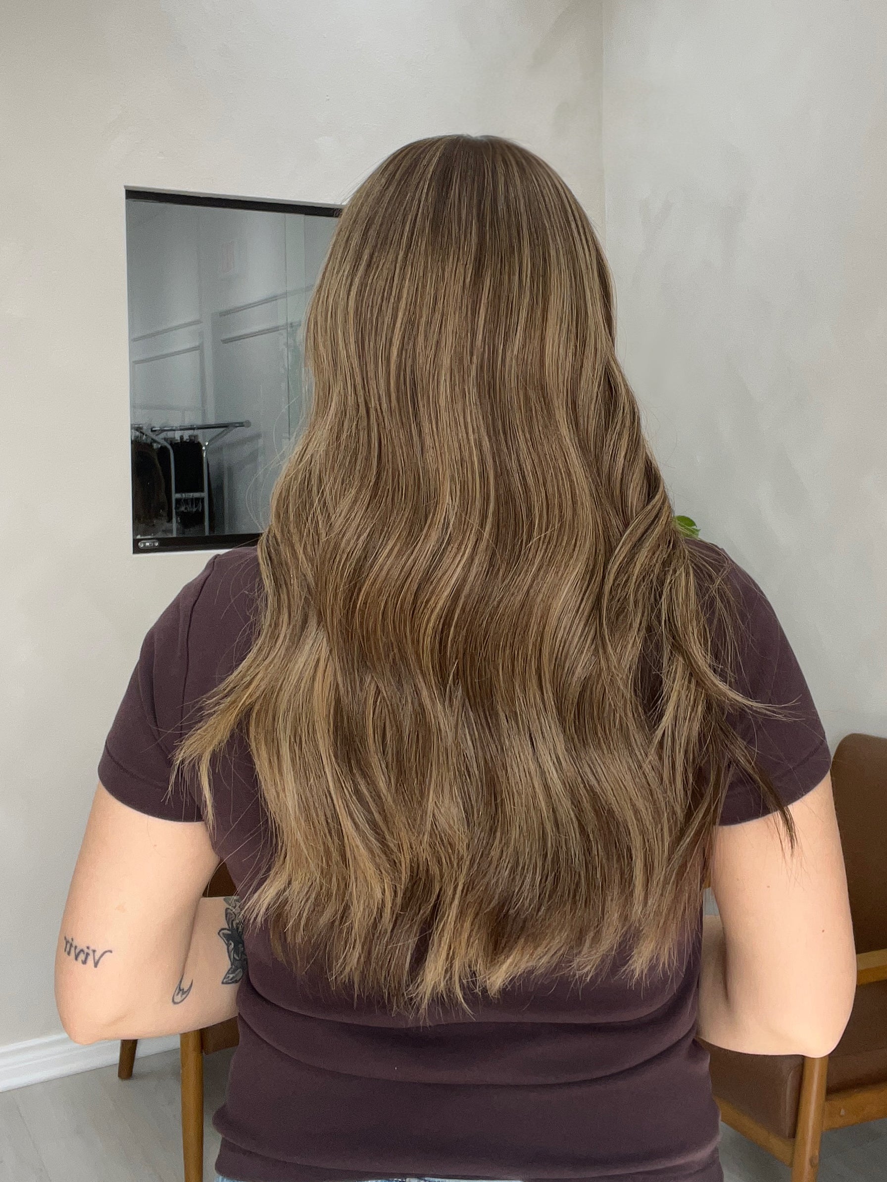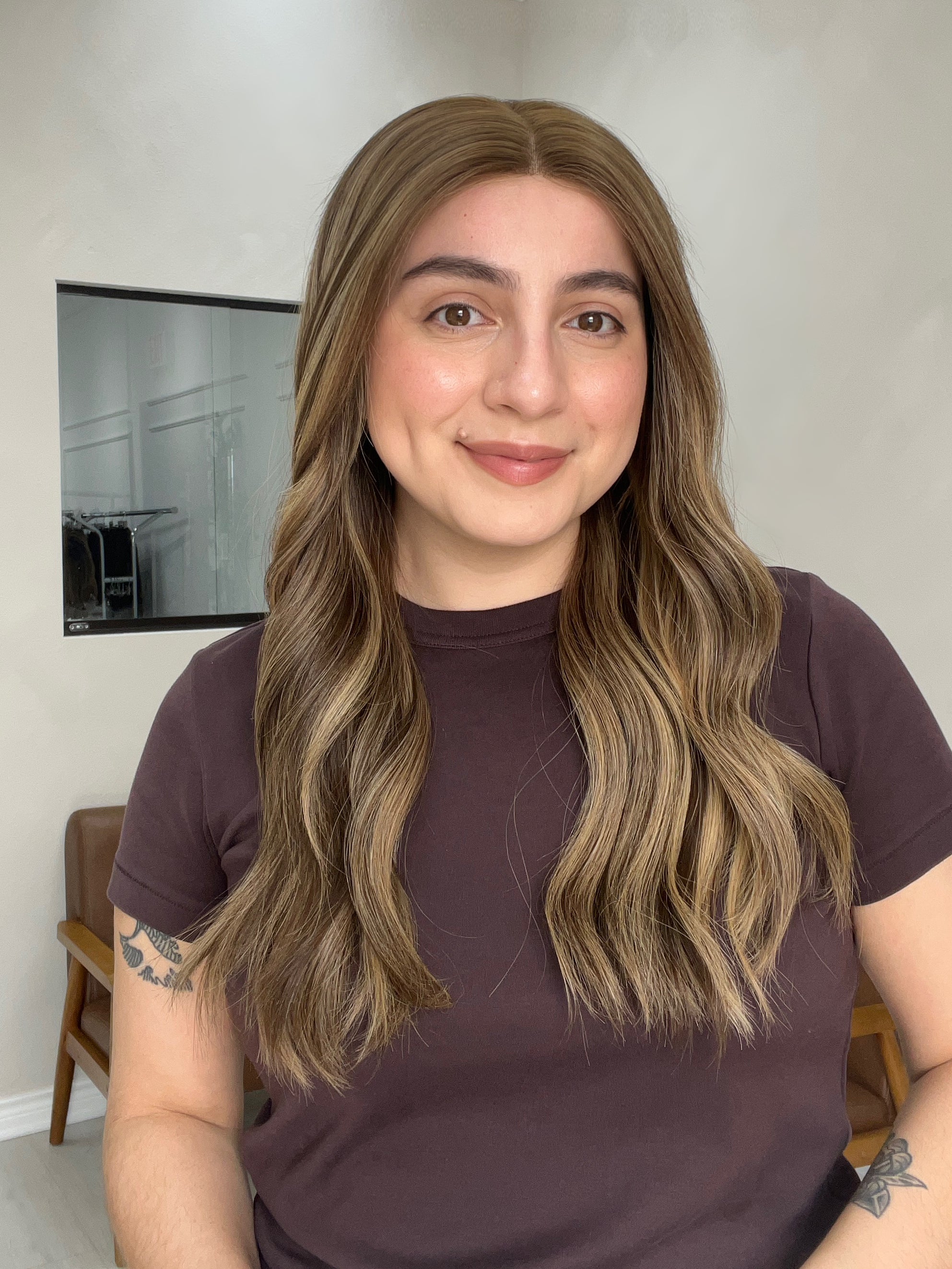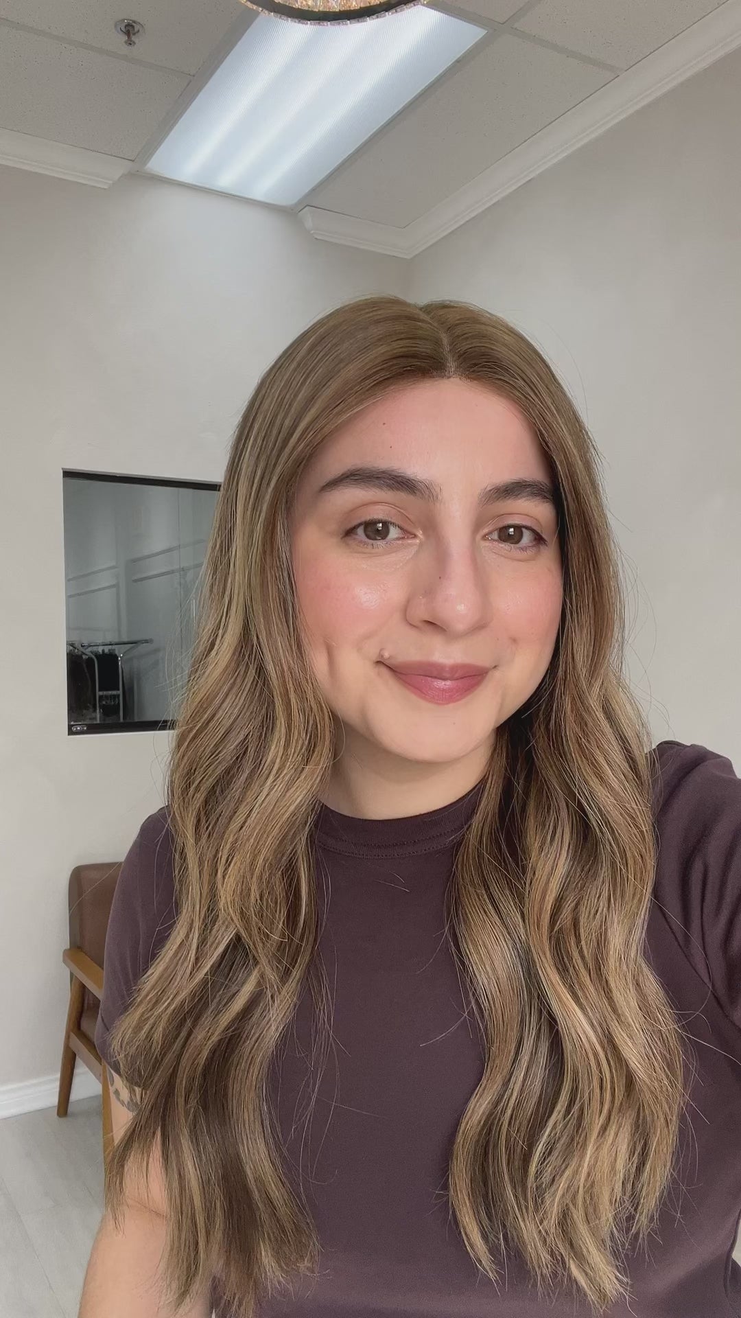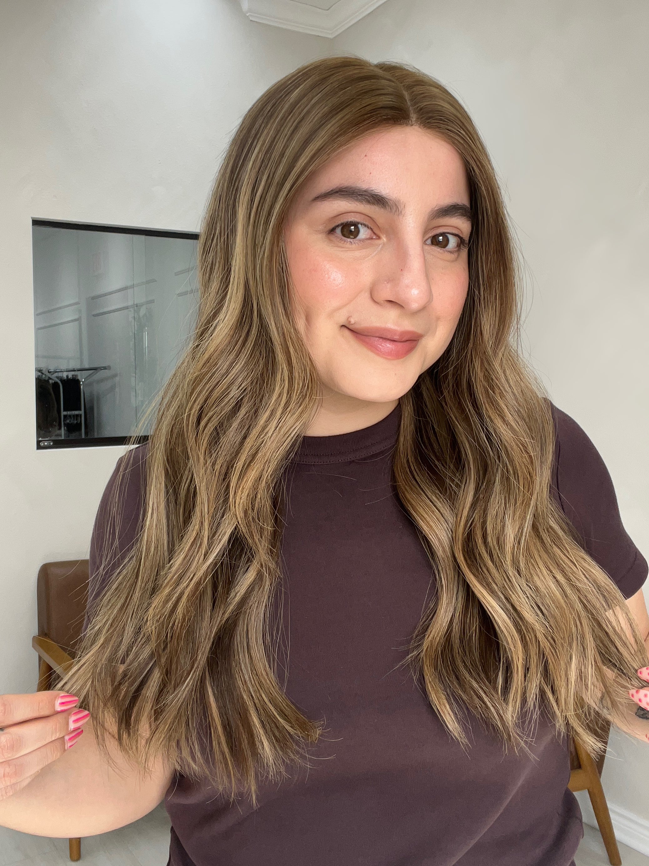 Color: Dark neutral brown root/base (about a level 5) with lighter medium blonde balayage and creamy blonde tones throughout