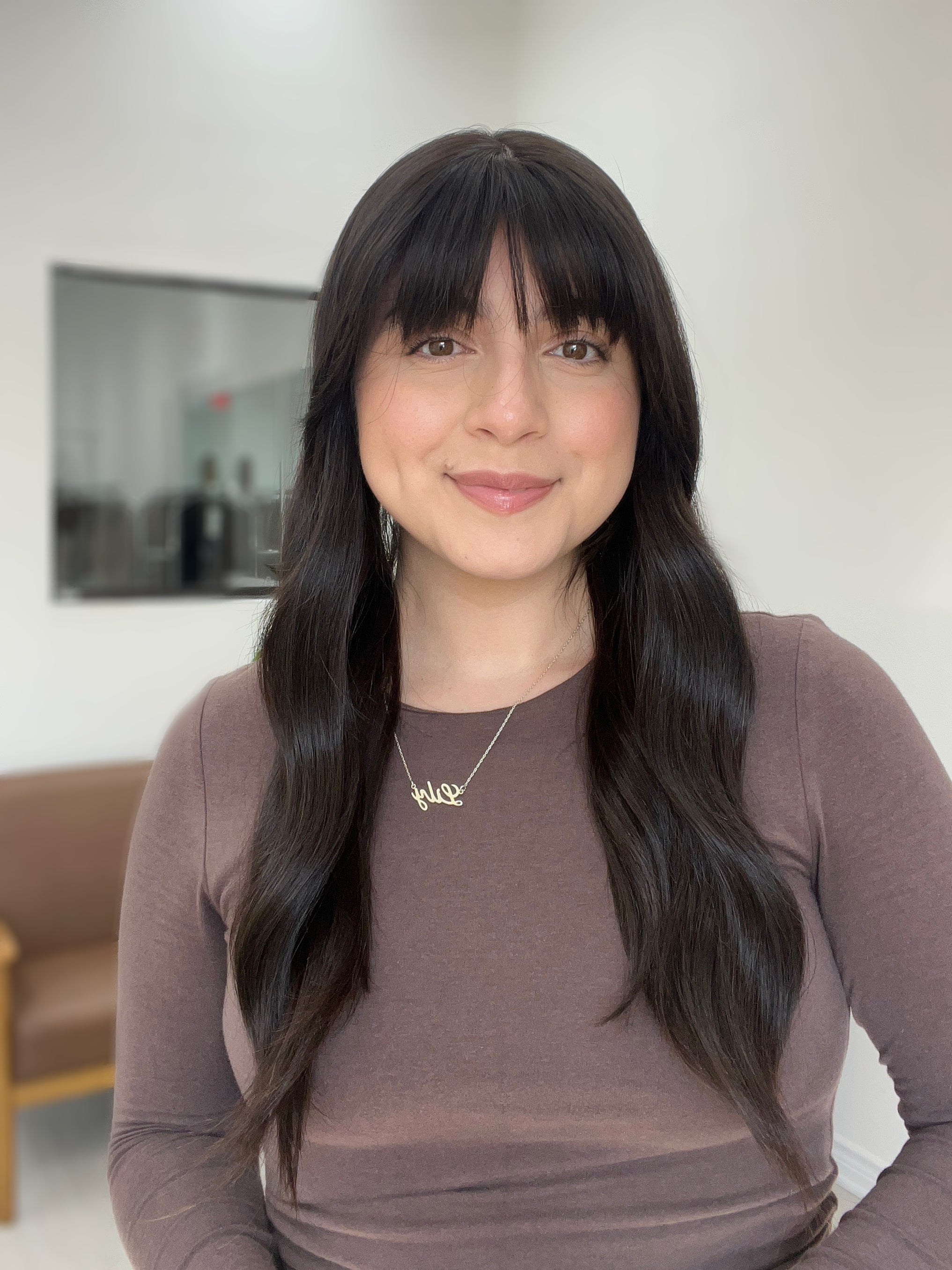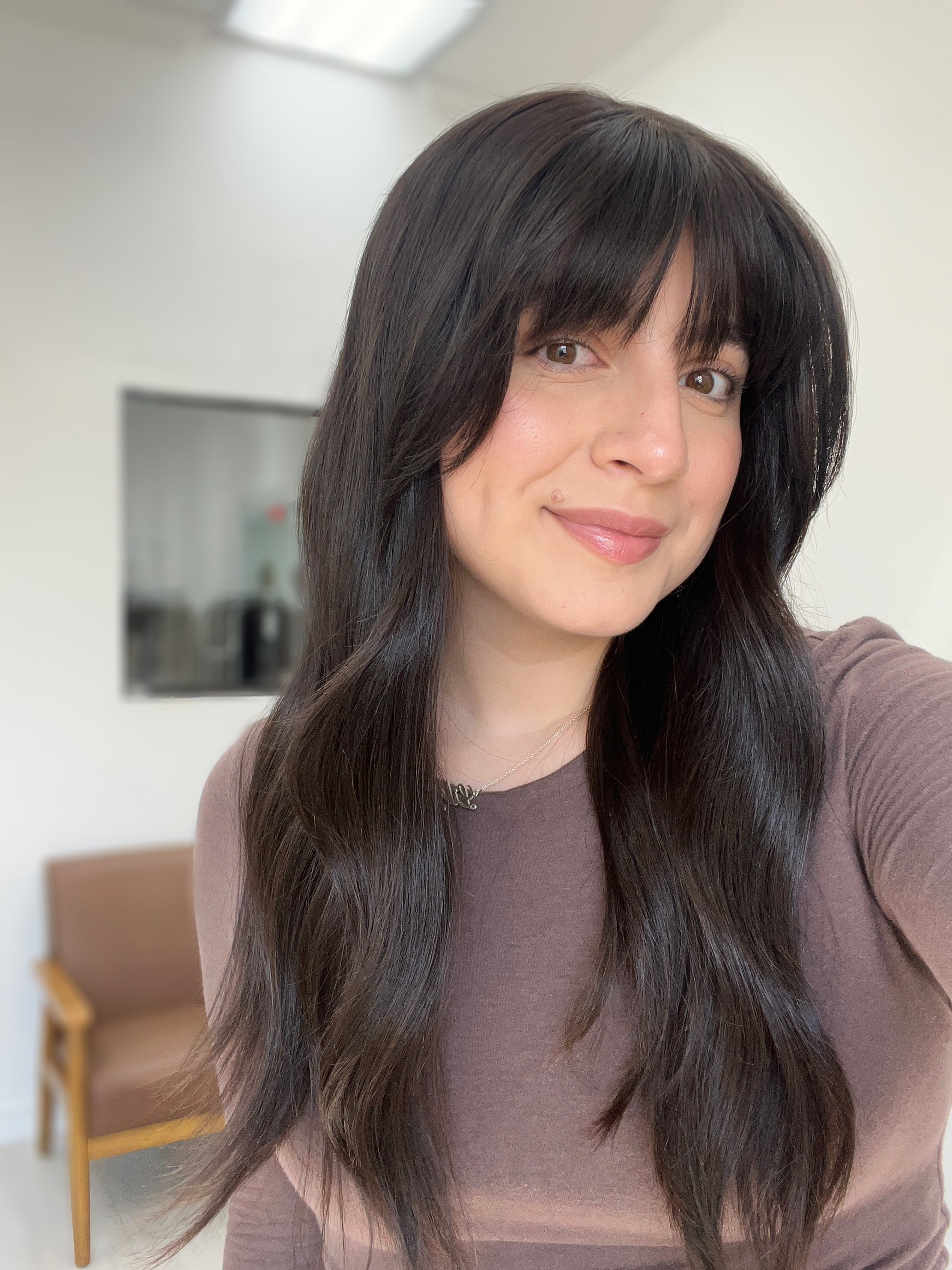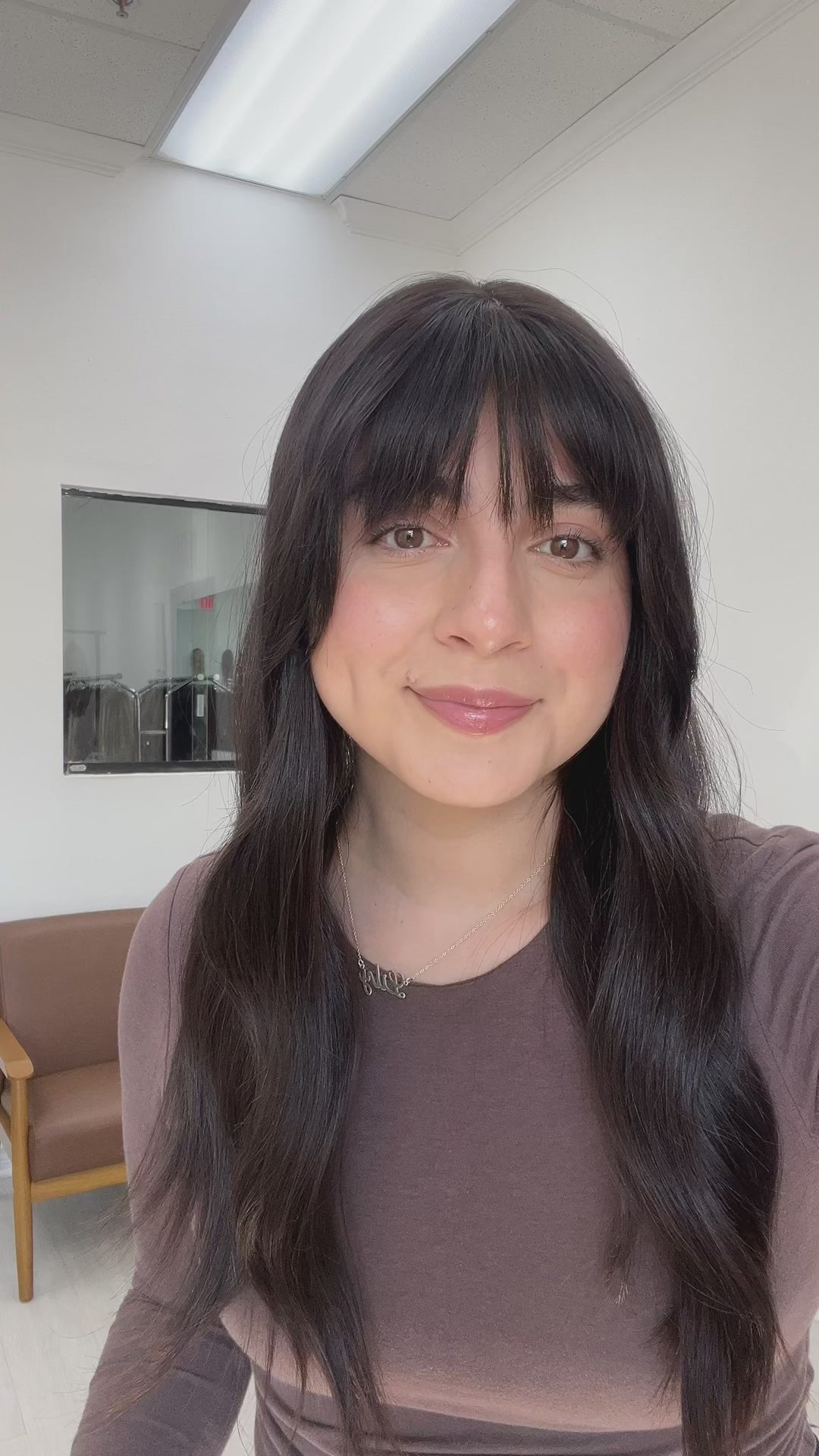 Length (measured 4" back from hairline down to the longest point of the ends): 19-21" layered with 13-14" face framing and 4-7" bangs
