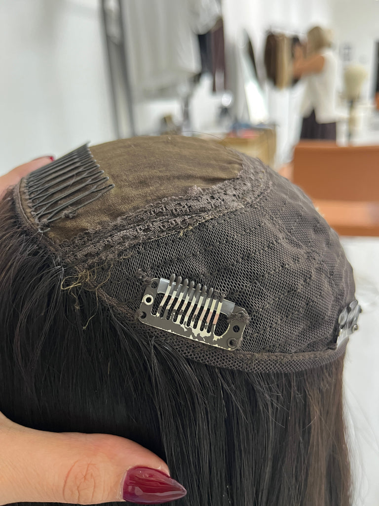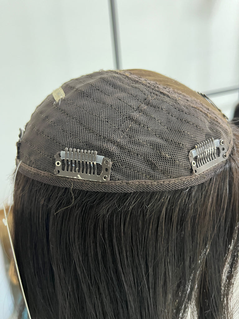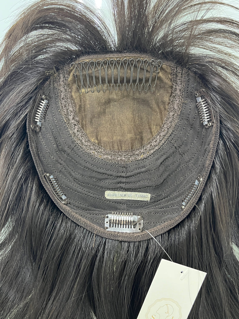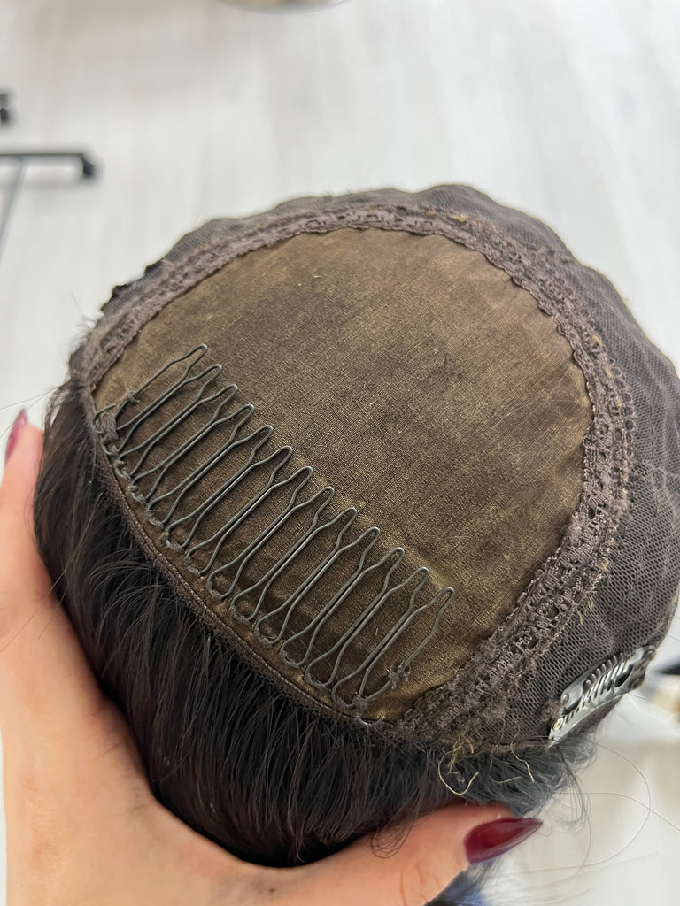 Other: Light medium density (about 115%-120%). There is some discoloration on the silk top that does not affect the integrity of the piece. Light wear and tear on the clips and comb. One clip is slightly loose and will need to be re-sewn over time. Seller added a haircut to this piece.