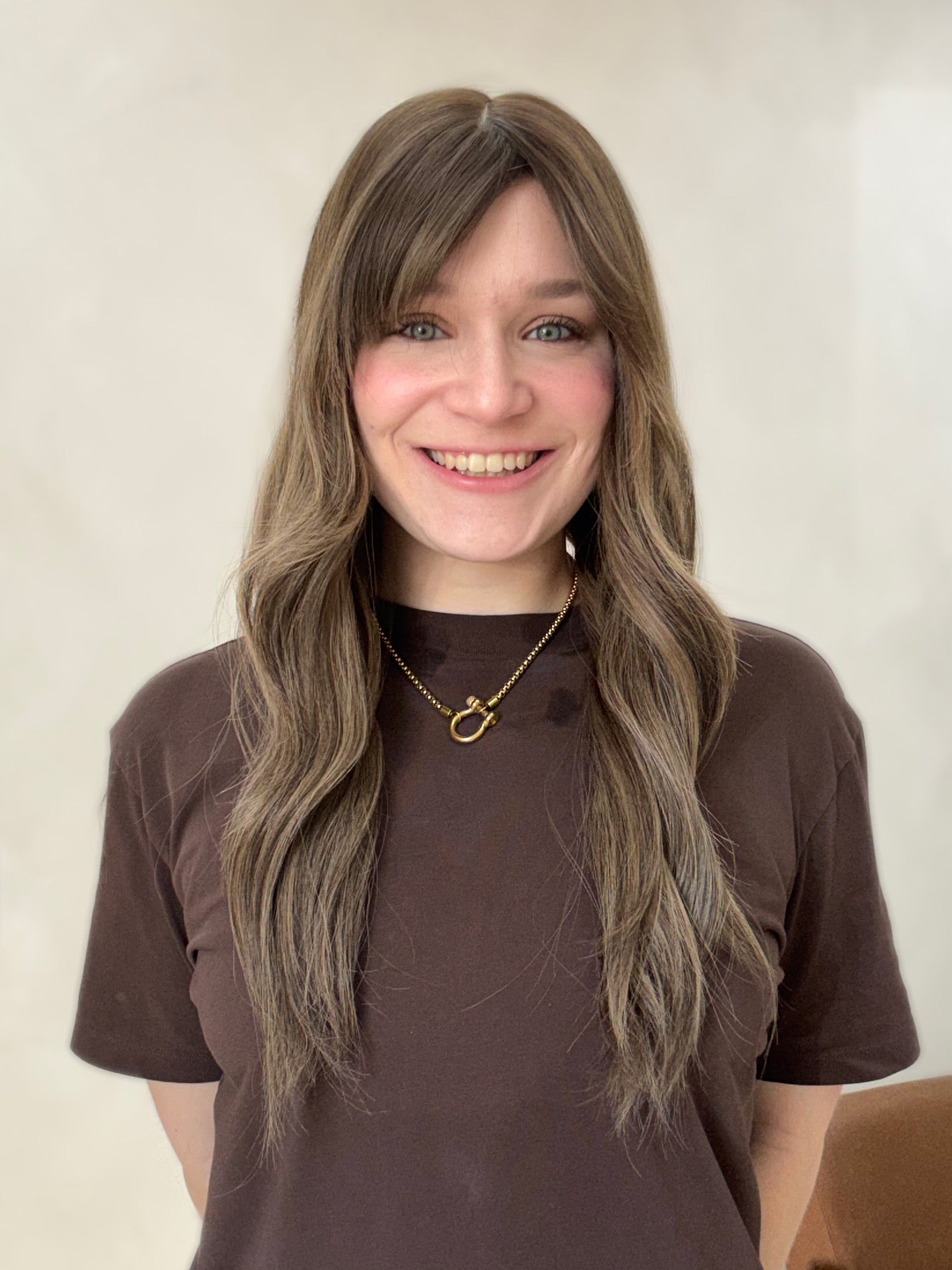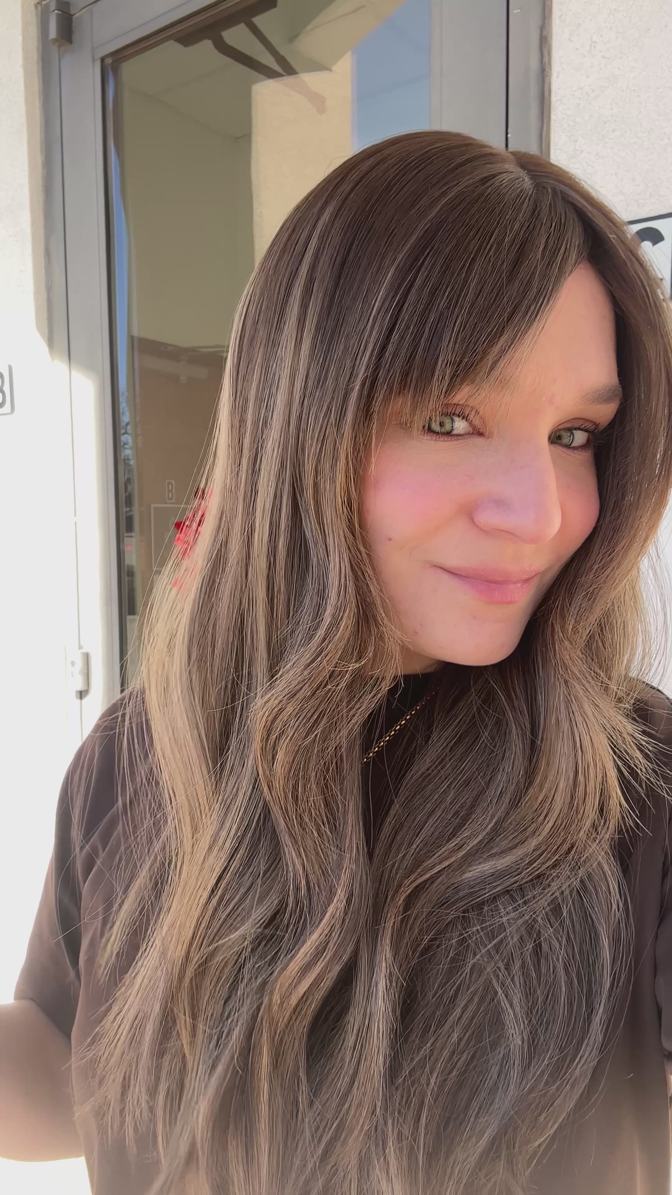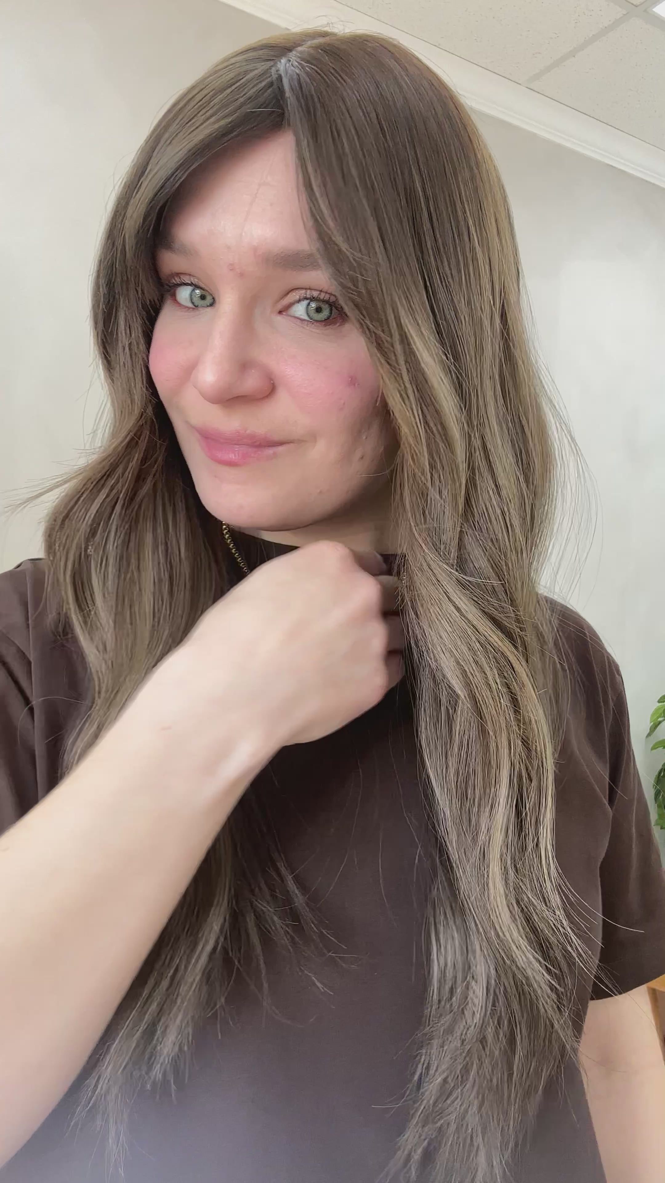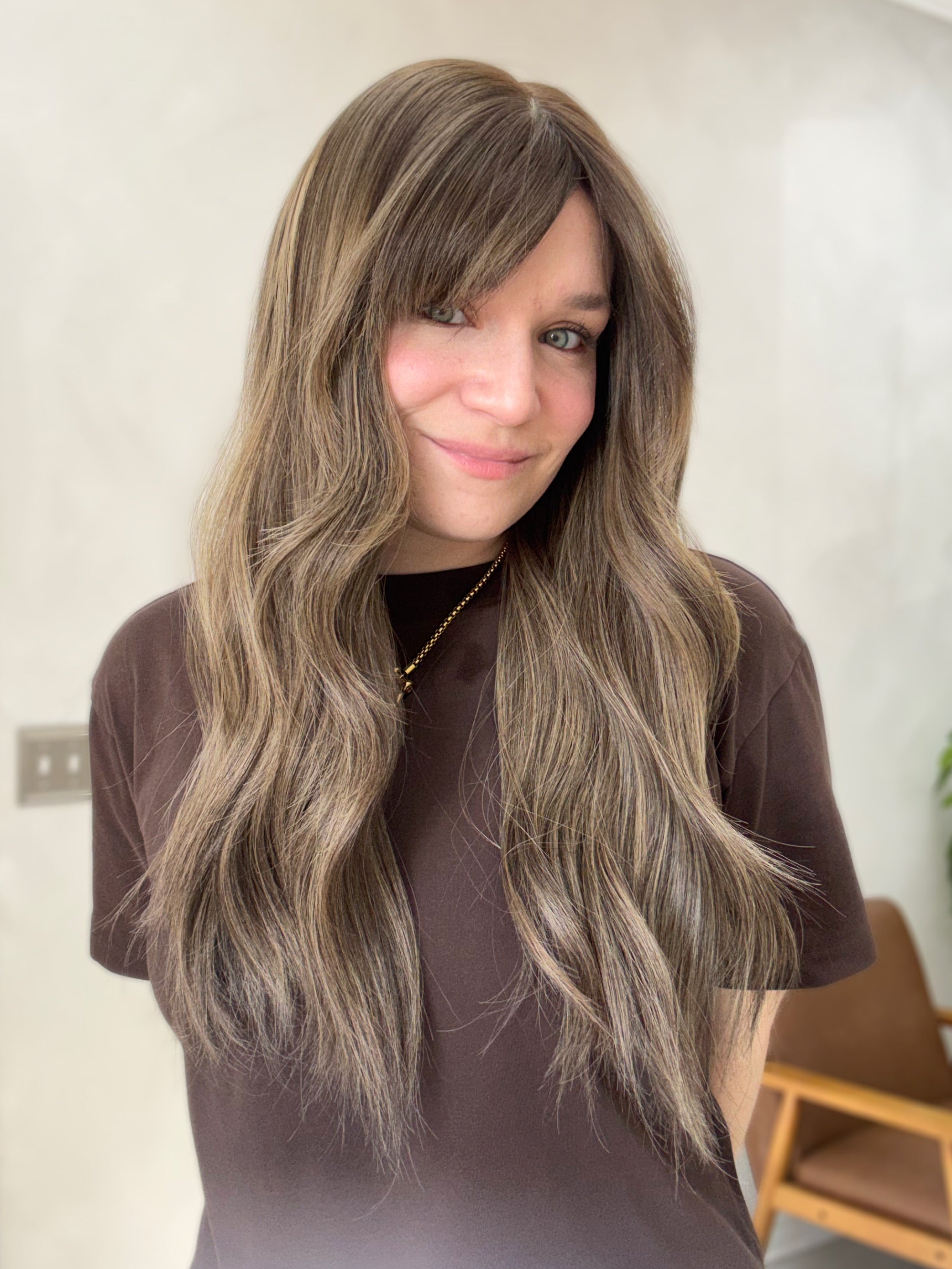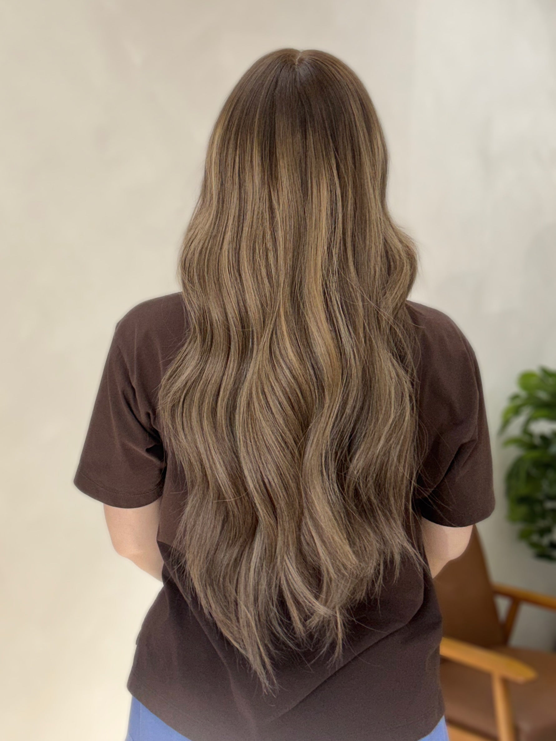 Color: Neutral brown base with level #4 root and blonde highlights throughout, subtle ashy to cool undertones
