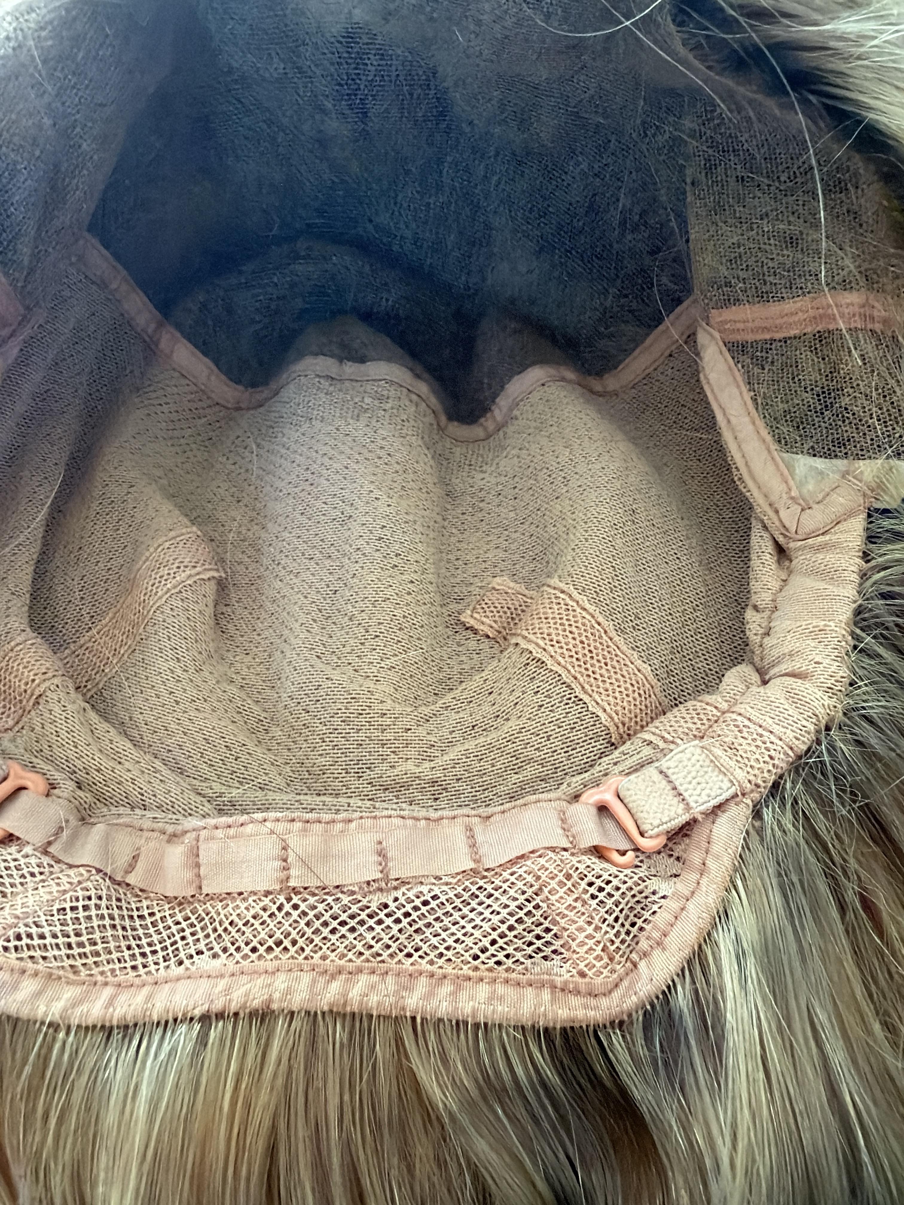 PHOENIX by Jon Renau 100% Chinese remy human hair 100% hand tied perfect for sensitive scalps. I have a 20.5" circumference and this piece fit a bit too big on me.