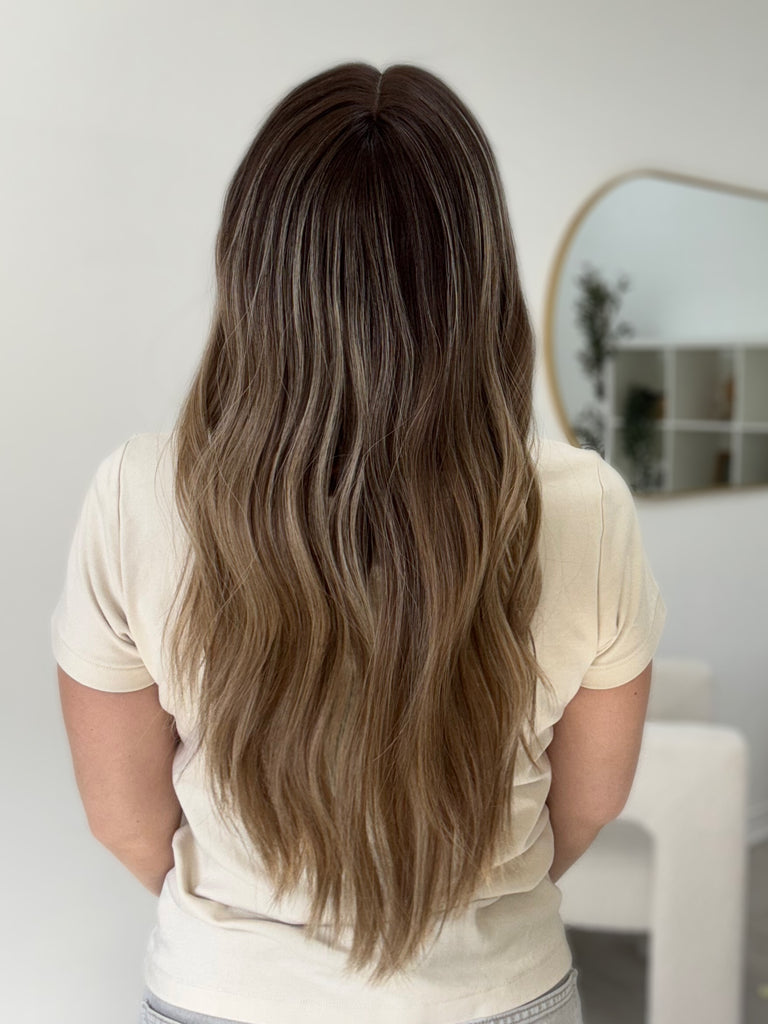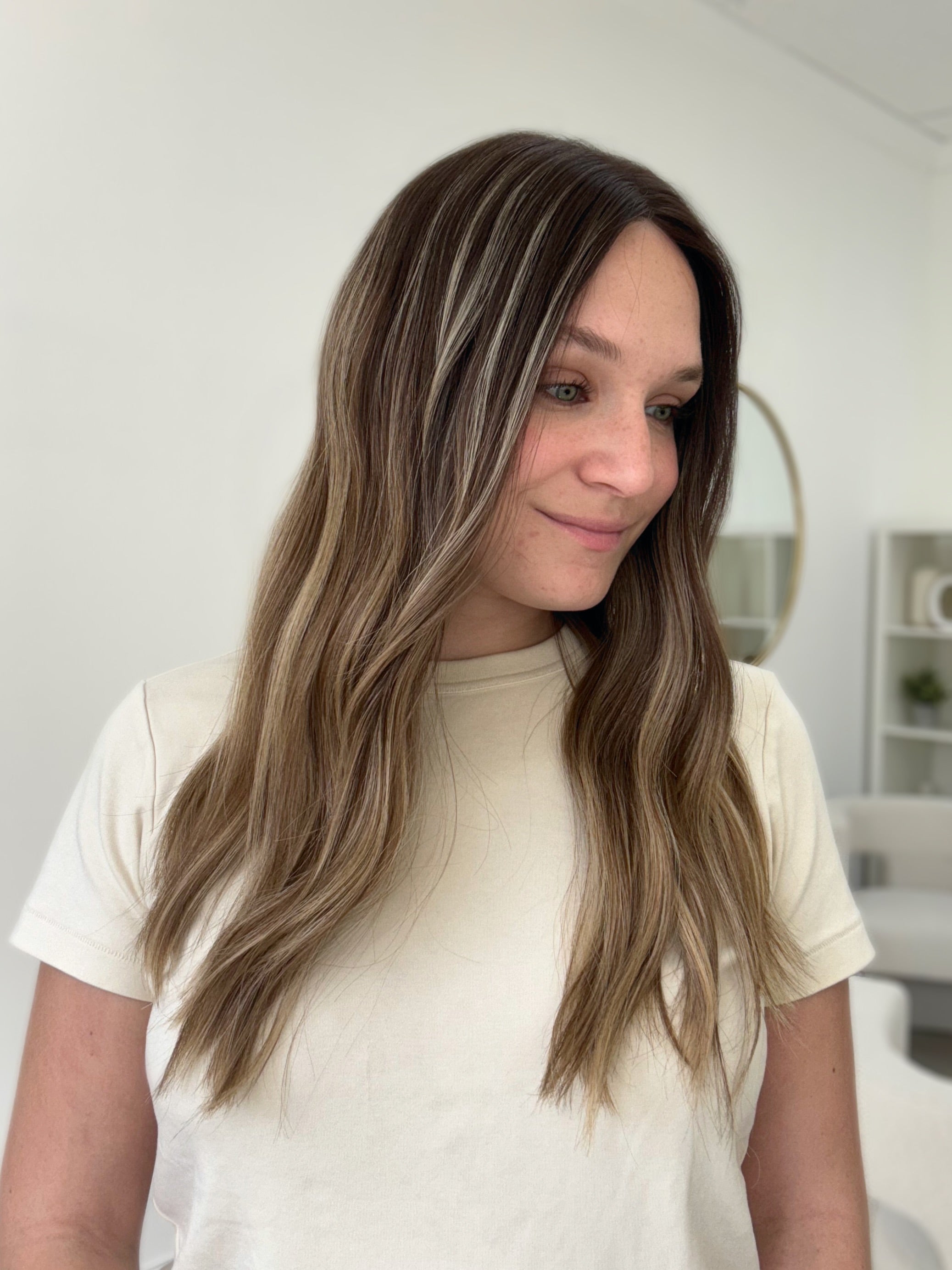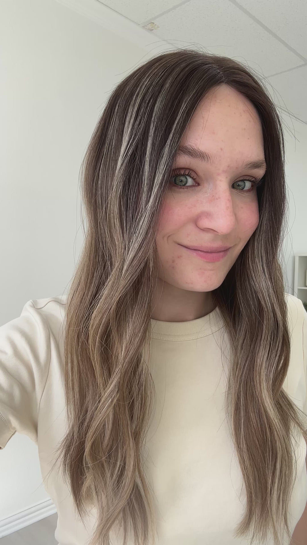 Color: A mix of warm and ashy blonde highlights and cooler-toned lowlights with dark root and bright money piece. Similar to our Jeannie, but with more highlights and dimension.