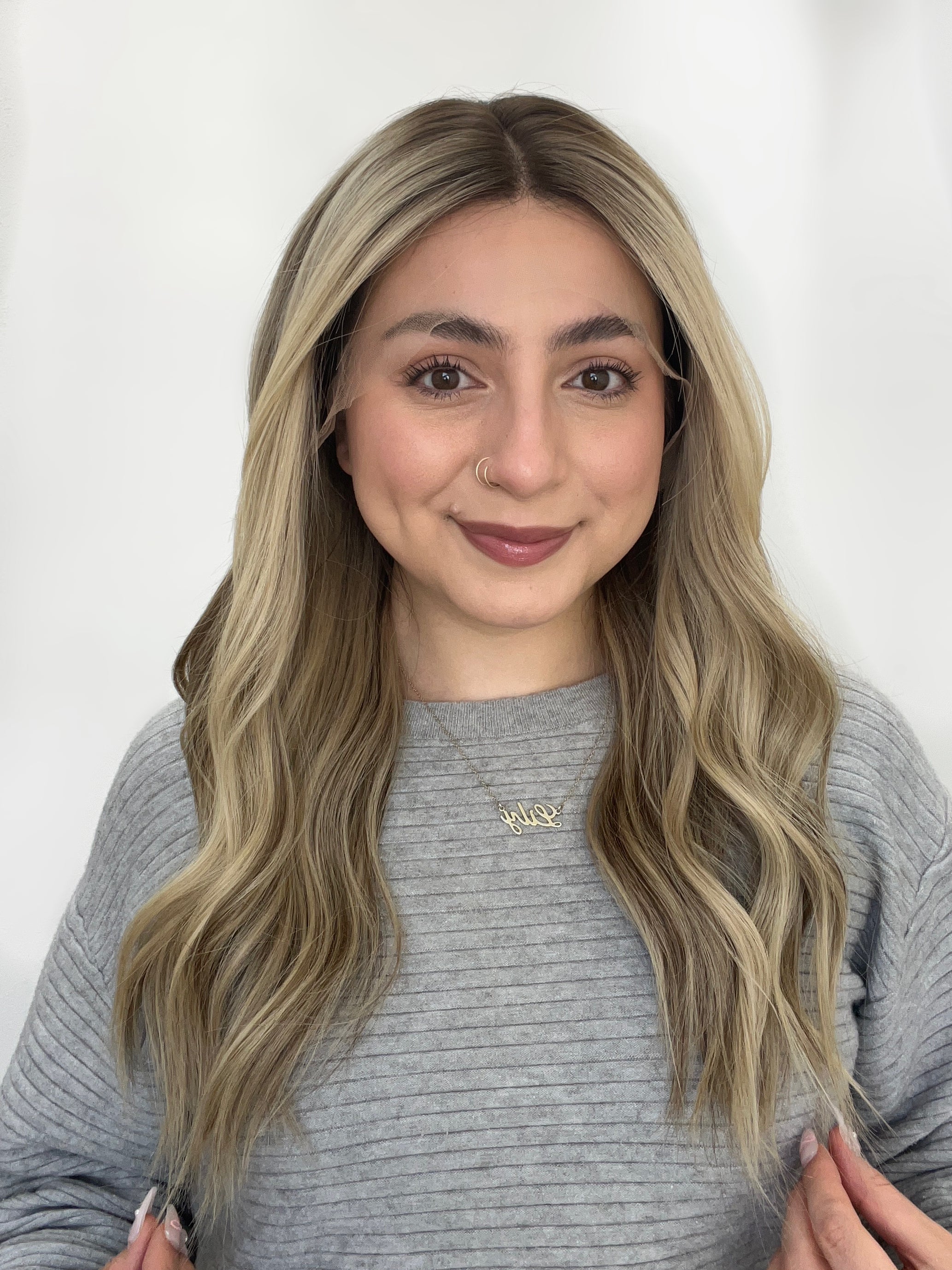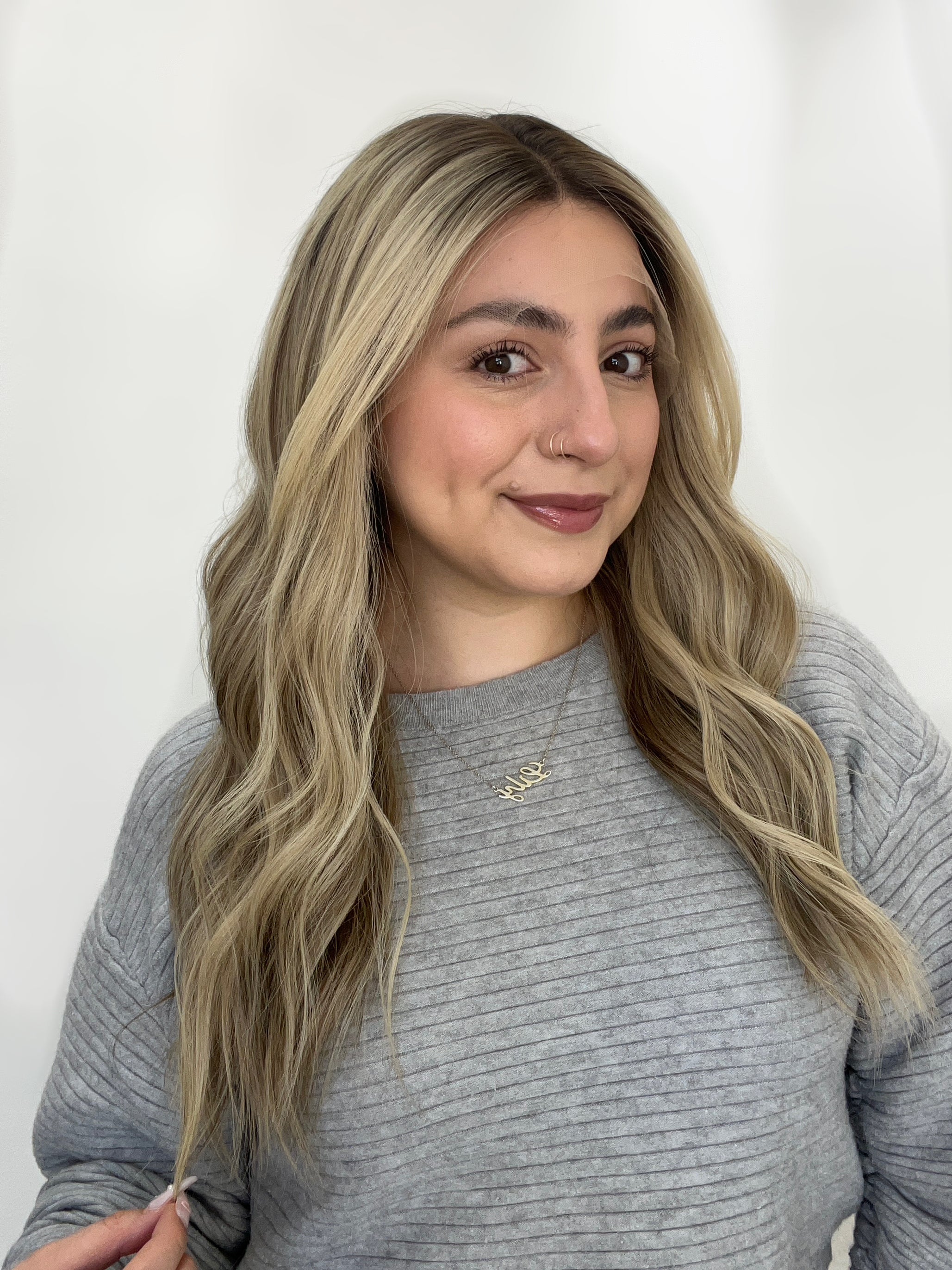 Color: Short darker brown root into a light stormy ash blonde with blend of darker neutral blonde
