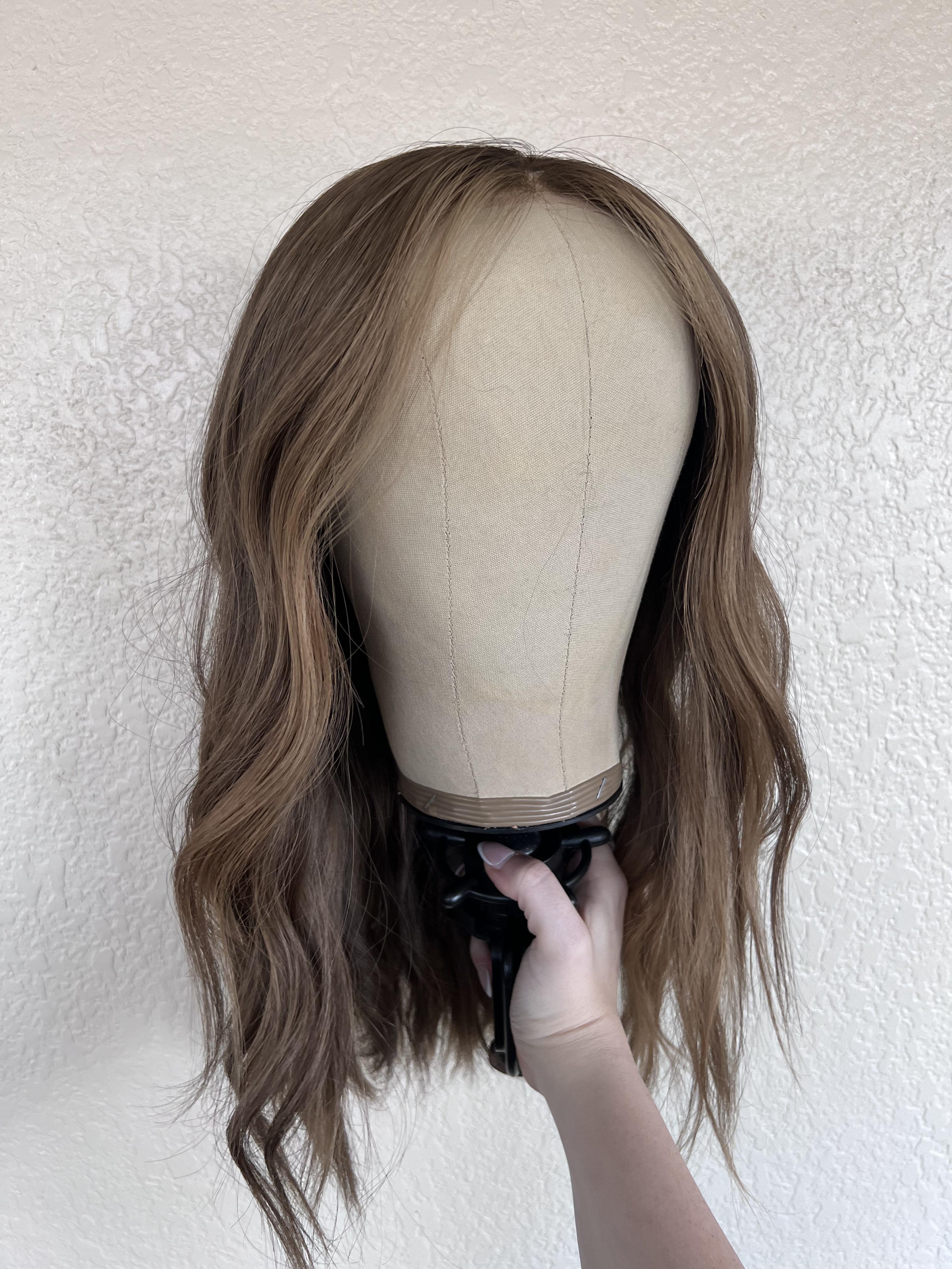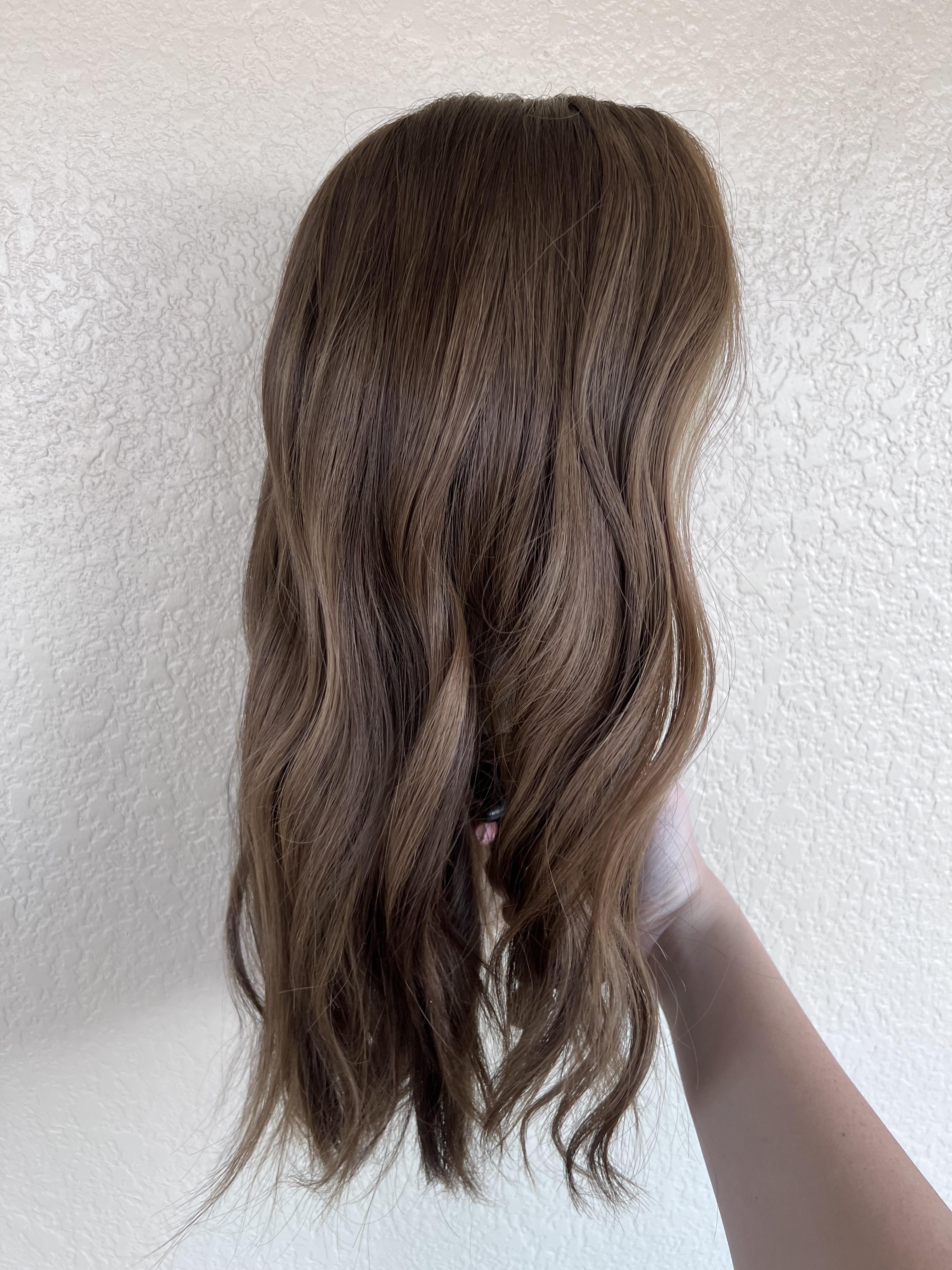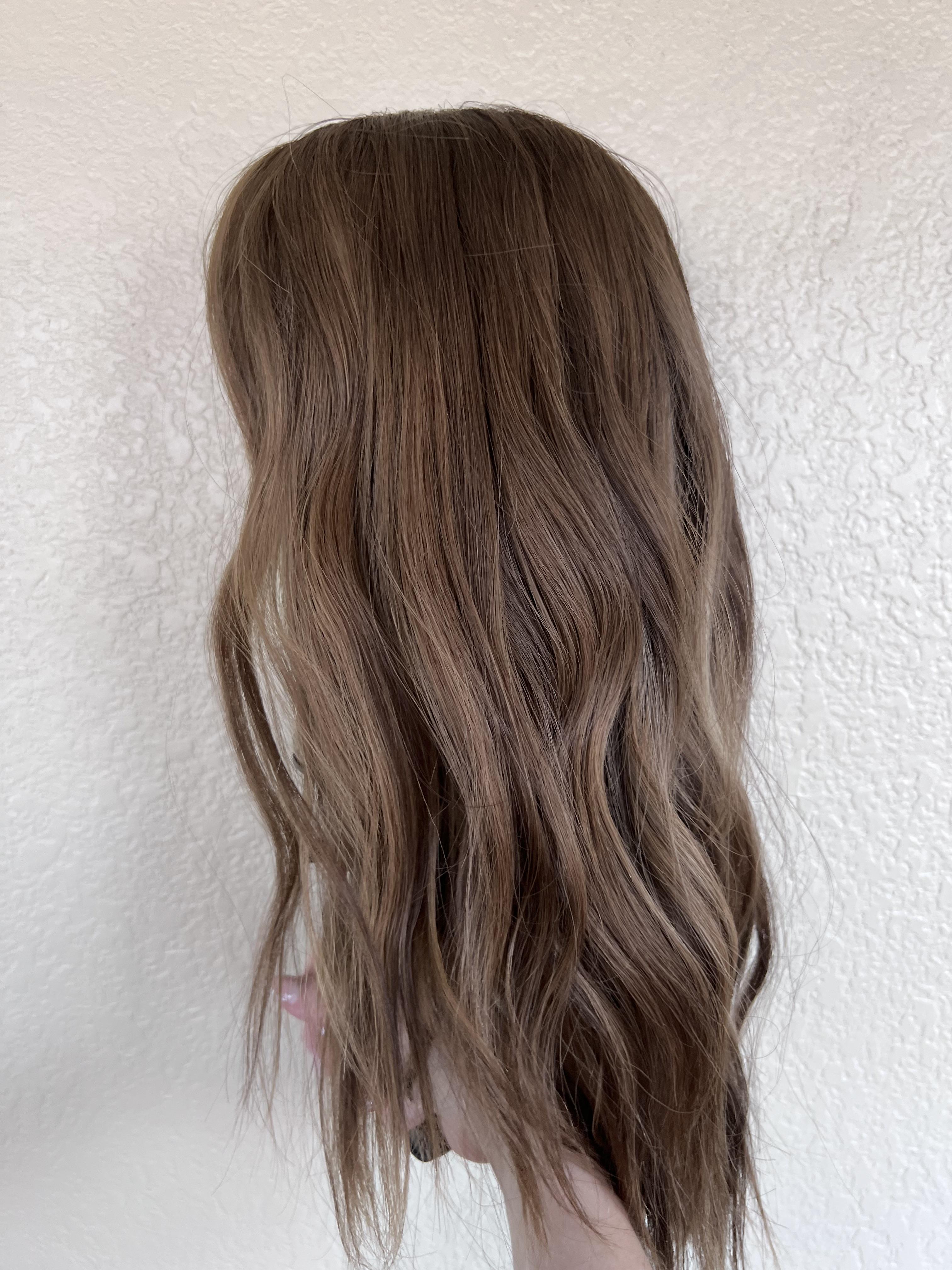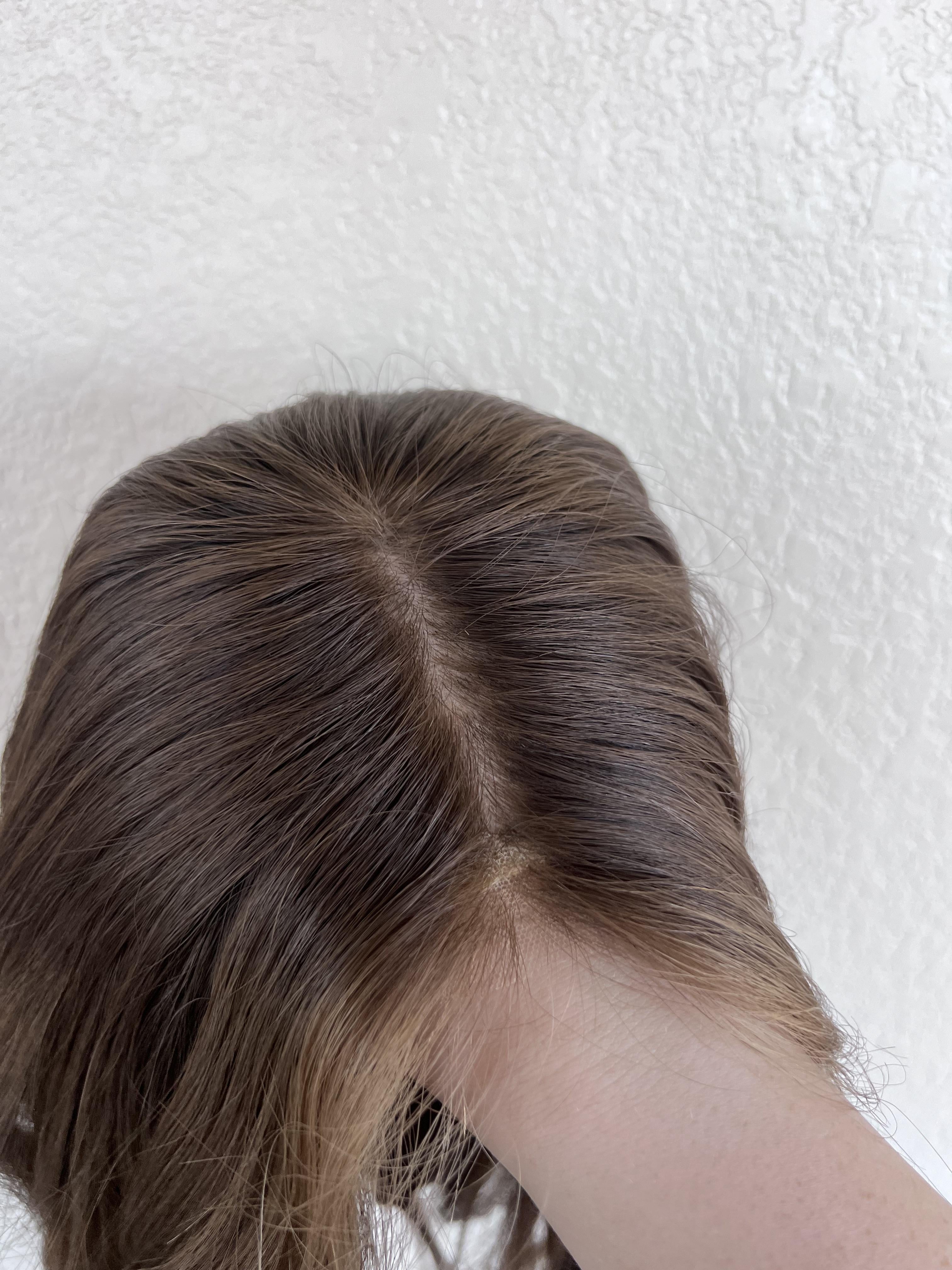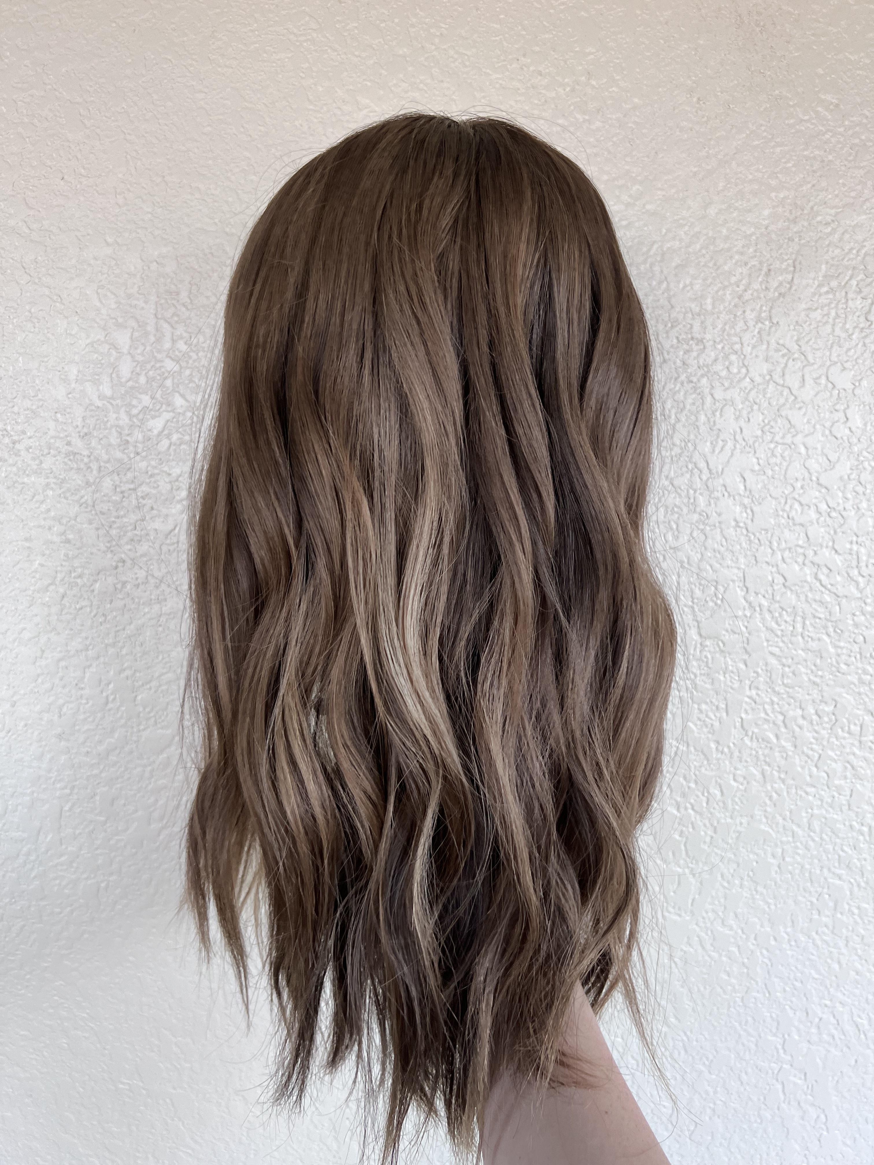 Color: Short brown root with a dimensional blend of dark, neutral, and a bit of lighter warm and very ashy brown tones throughout.