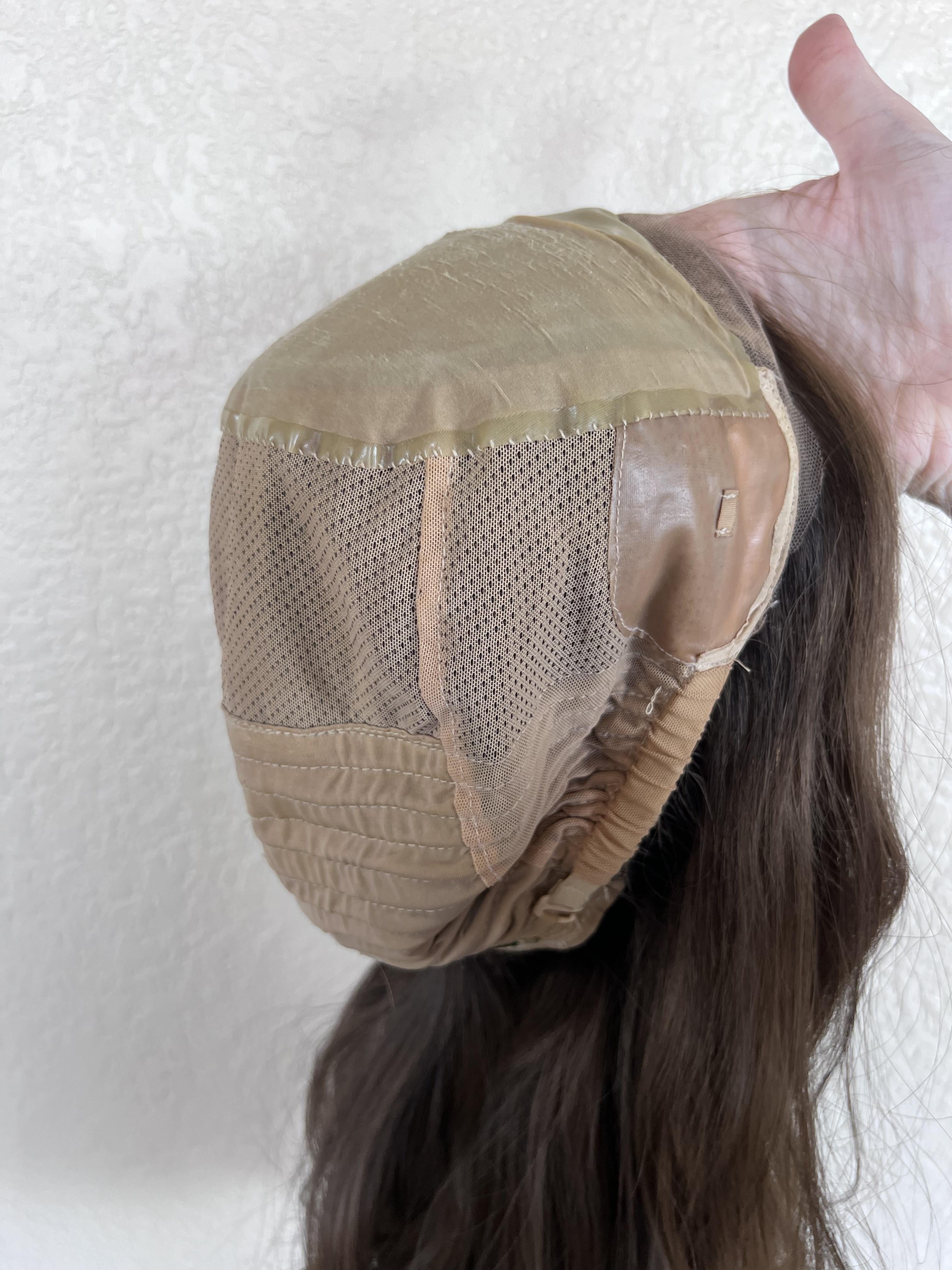 Gorgeous long and silky silk top wig by Lu's Wigs! Hair type is Mongolian. Knots are lightly bleached near the front of the hairline from temple to temple with the rest of the knots not bleached for longevity. I am usually a size medium and this wig fits too small on me.