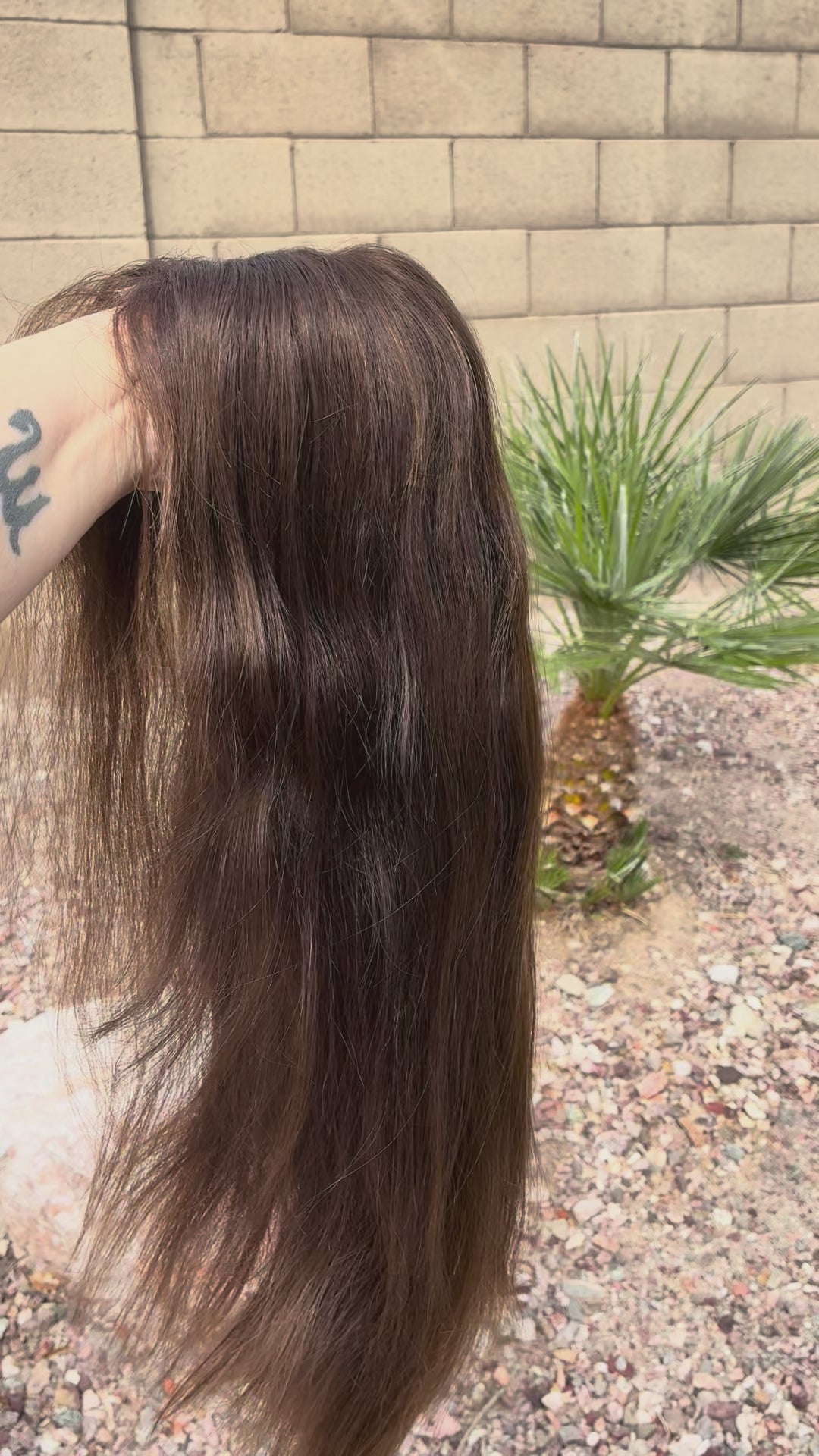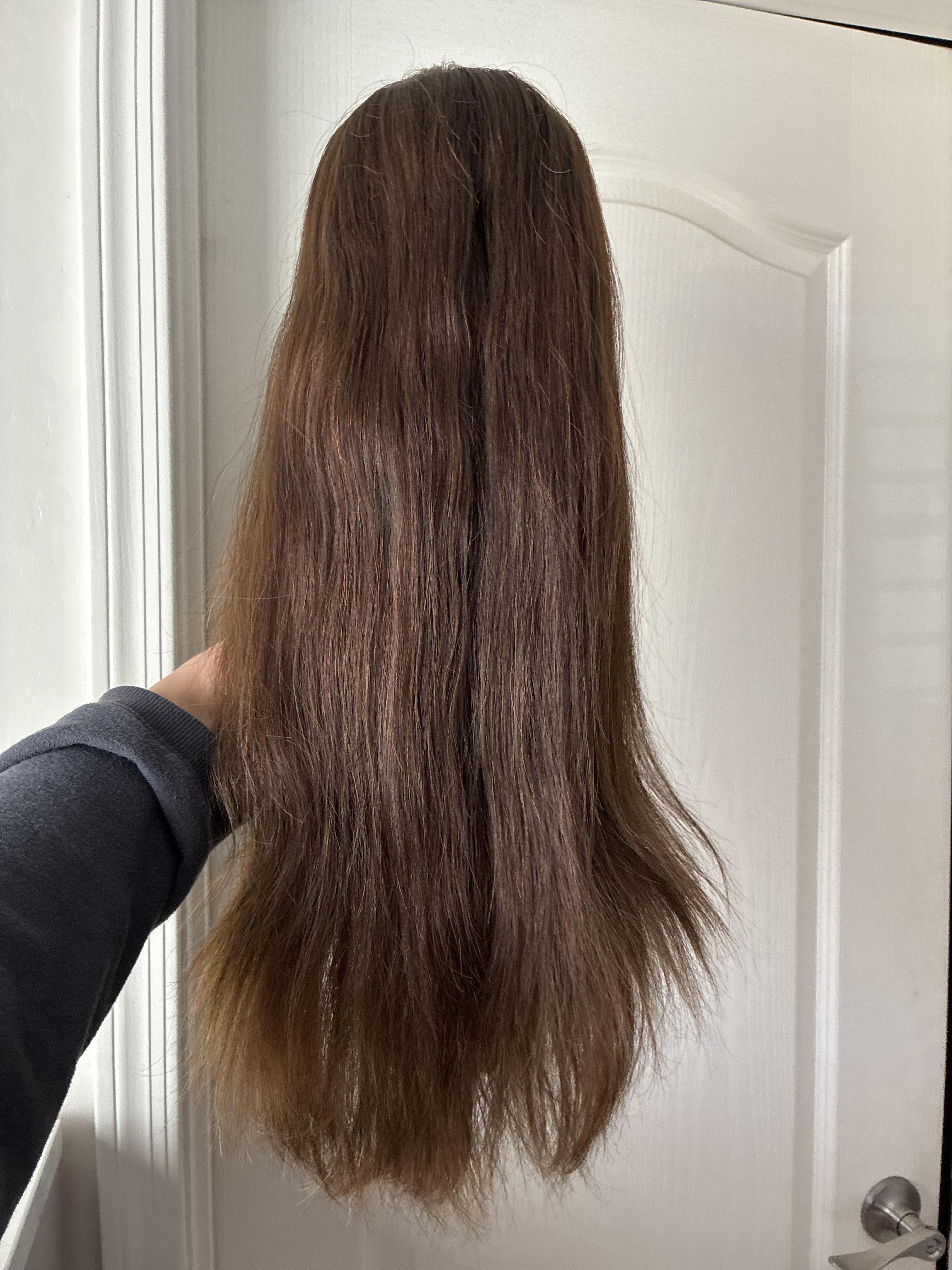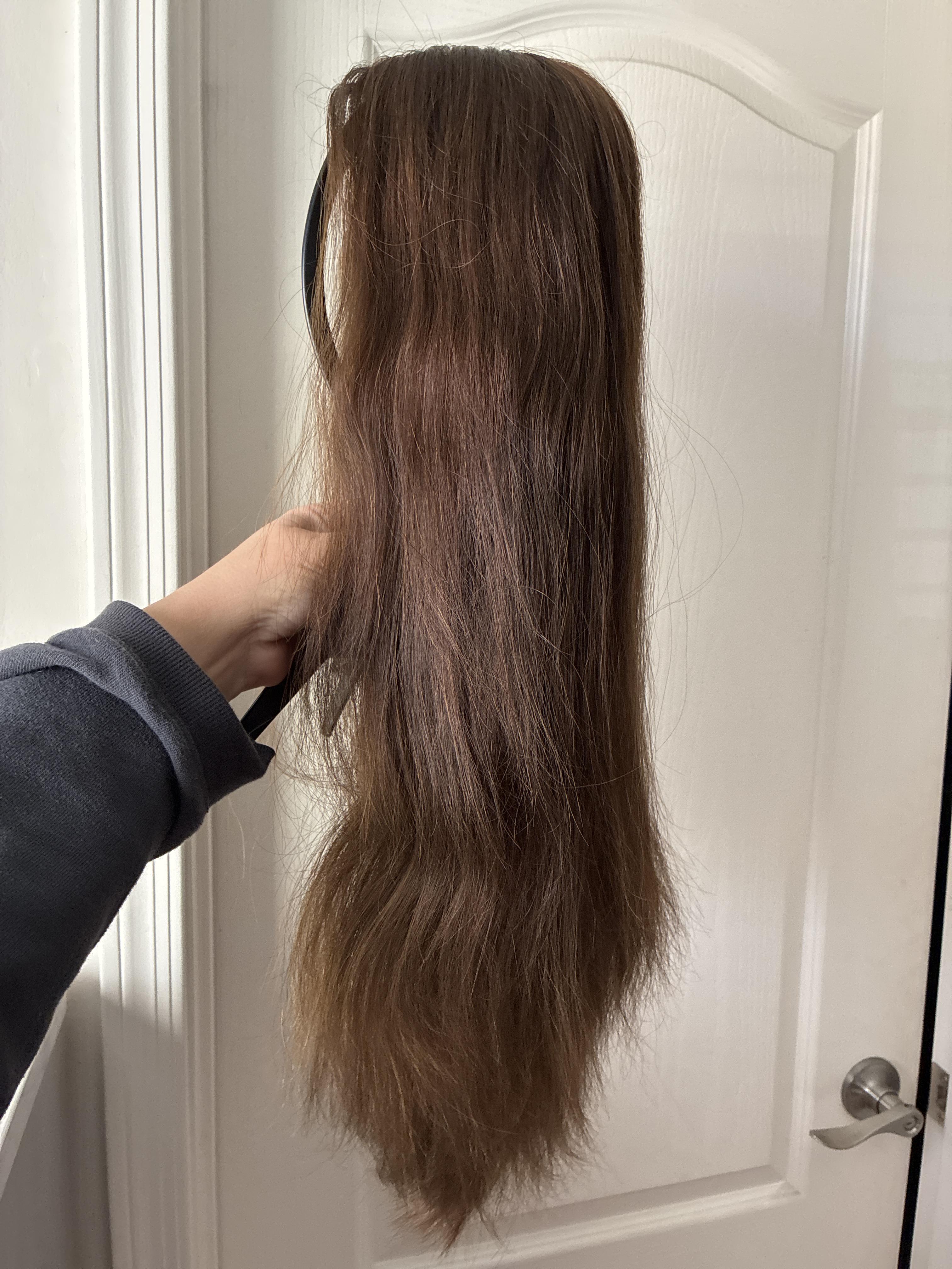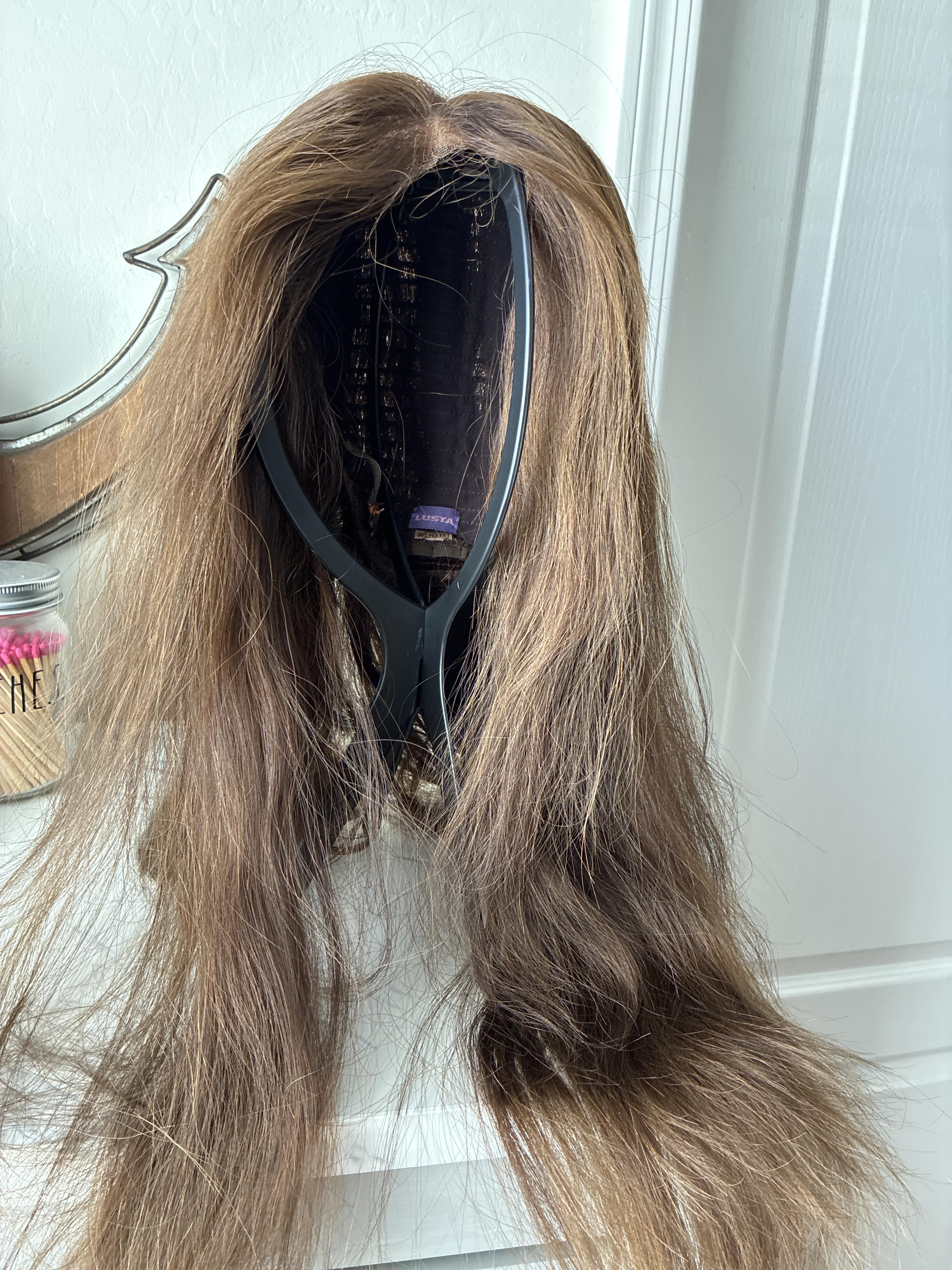 Other: Has clips at the ear tabs and silicone on the nape. This beautiful brunette may have taken a lot of trips across the US but she still has more miles left in her, hopefully for years to come! I am usually a size medium and this piece fit a bit too big on me.