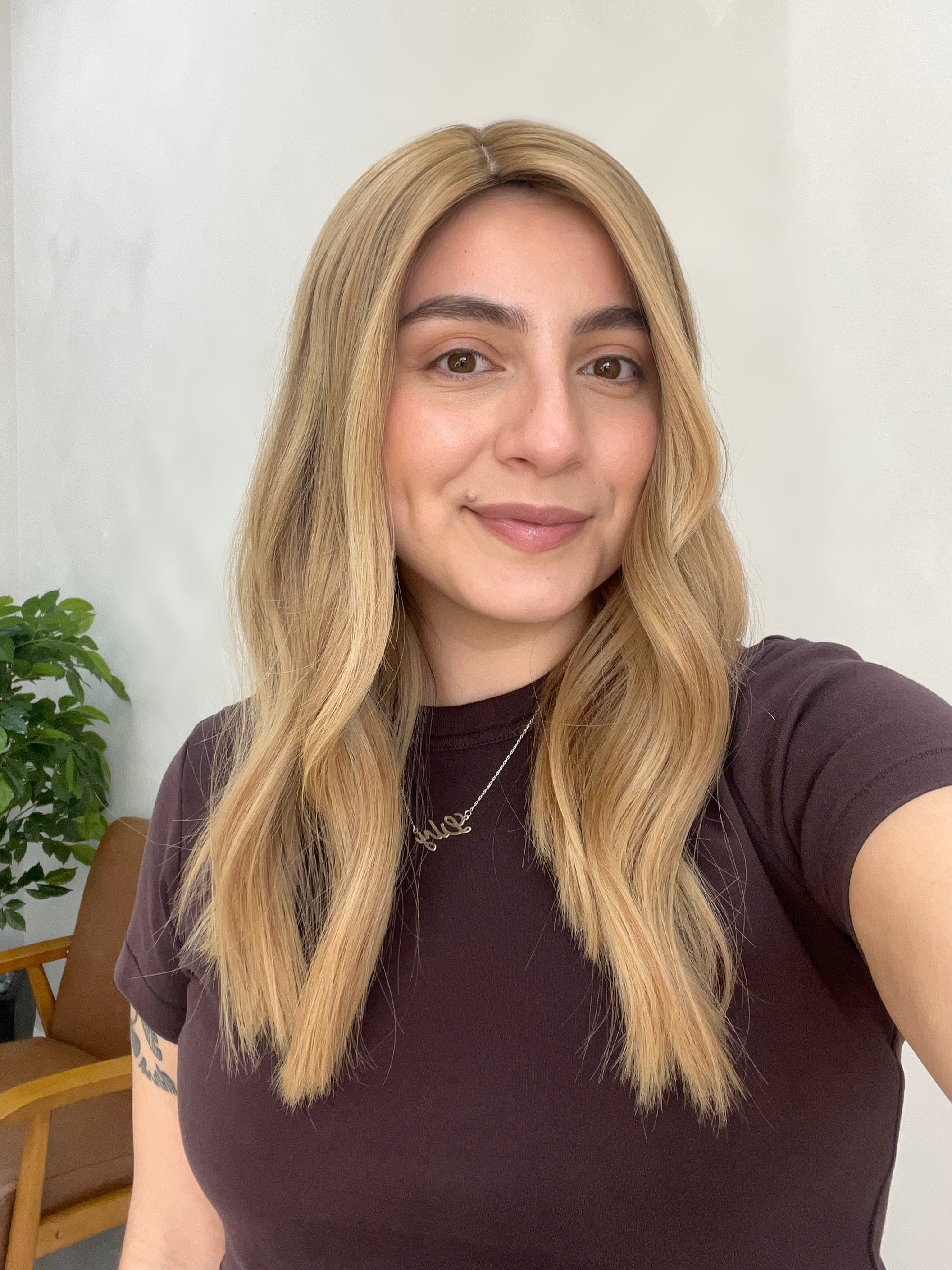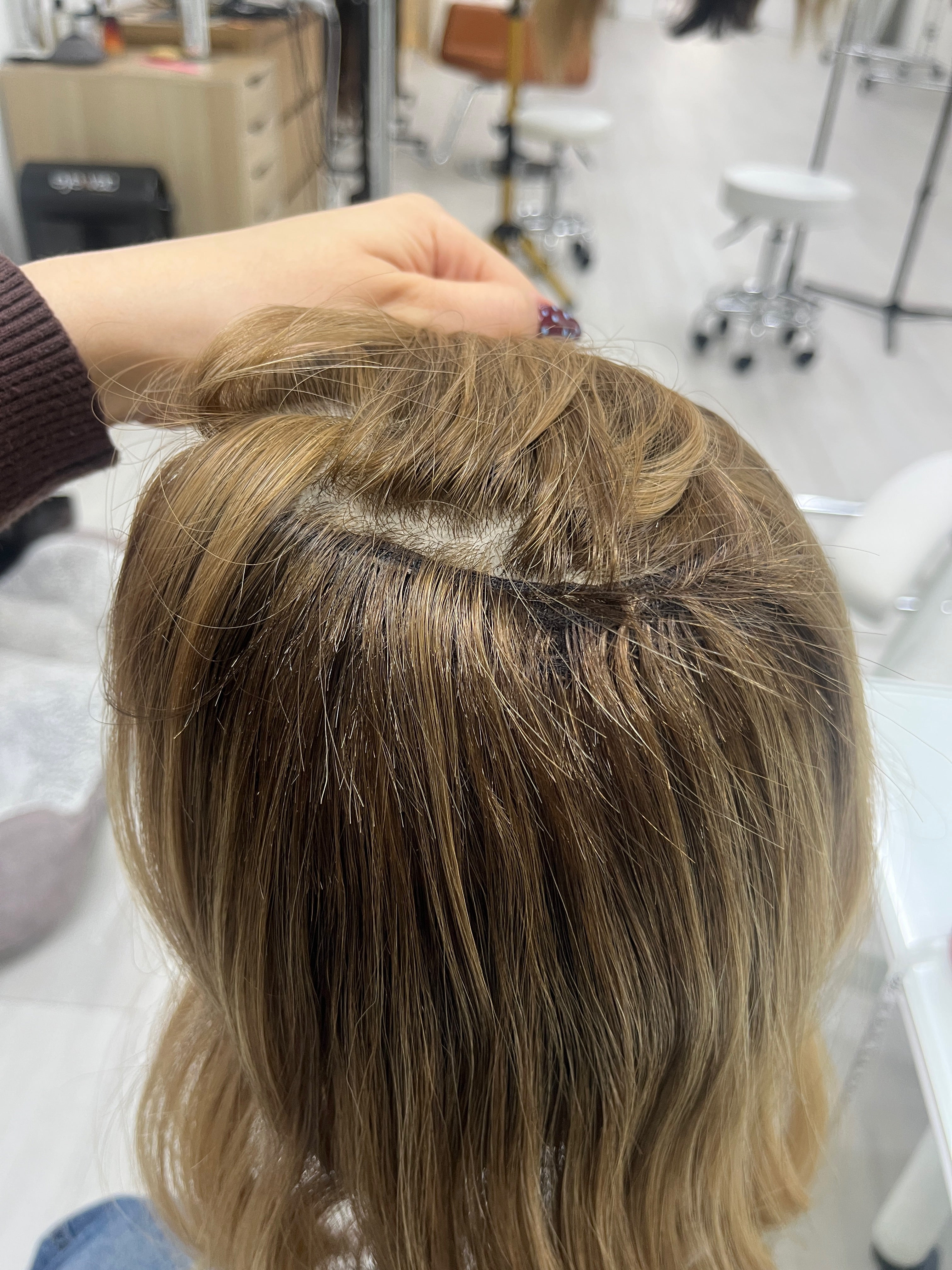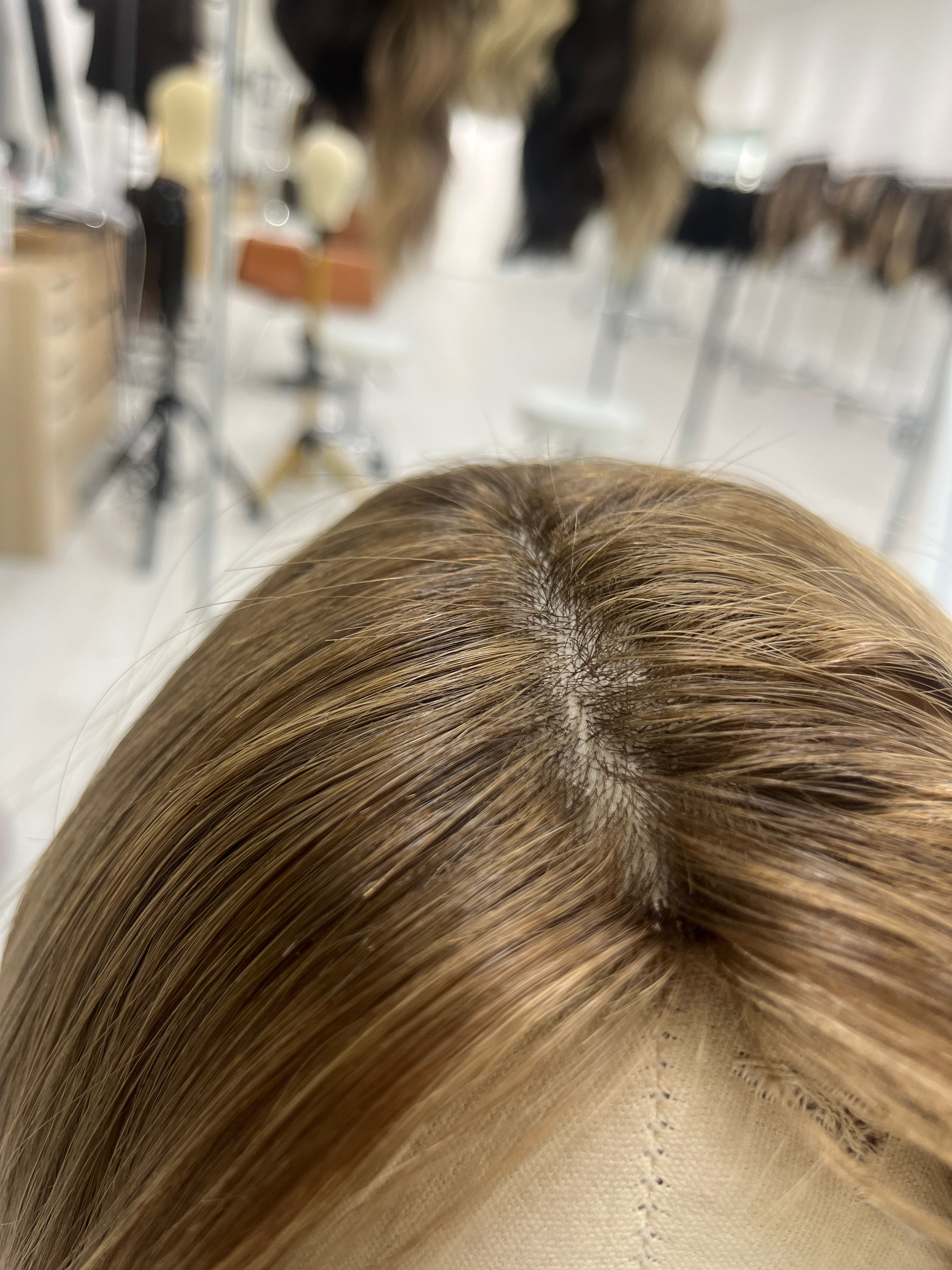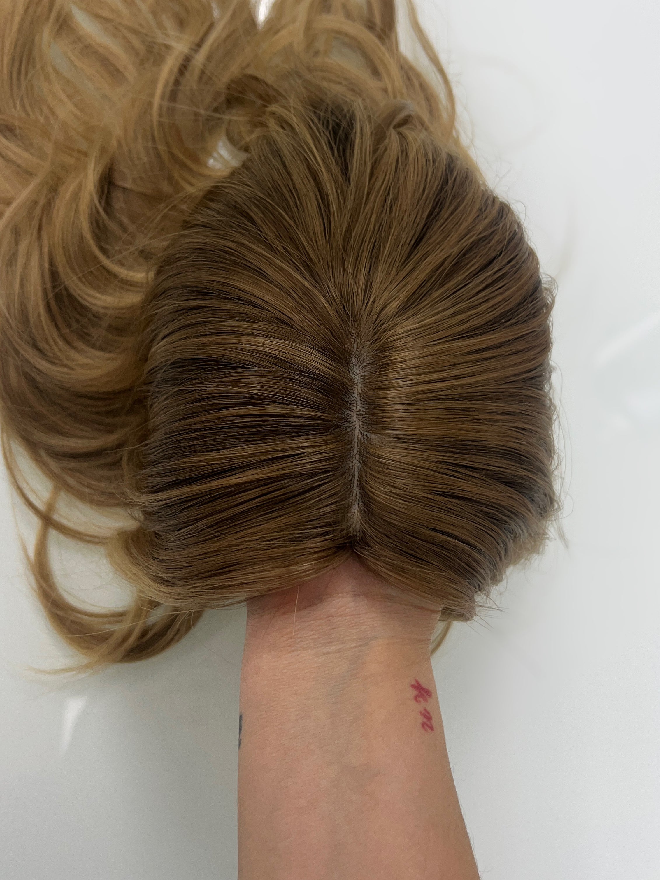Considerations: The hair feels a bit dry toward the ends, a deep conditioning treatment can help maintain nourishment on the hair over time. There are short hairs sticking out in certain areas of the silk top and cap by the wefts that are not visible when wearing (the topper may best be worn parted as shown to further conceal the shorter hairs). Overall, this piece is in good condition with lots of life left.