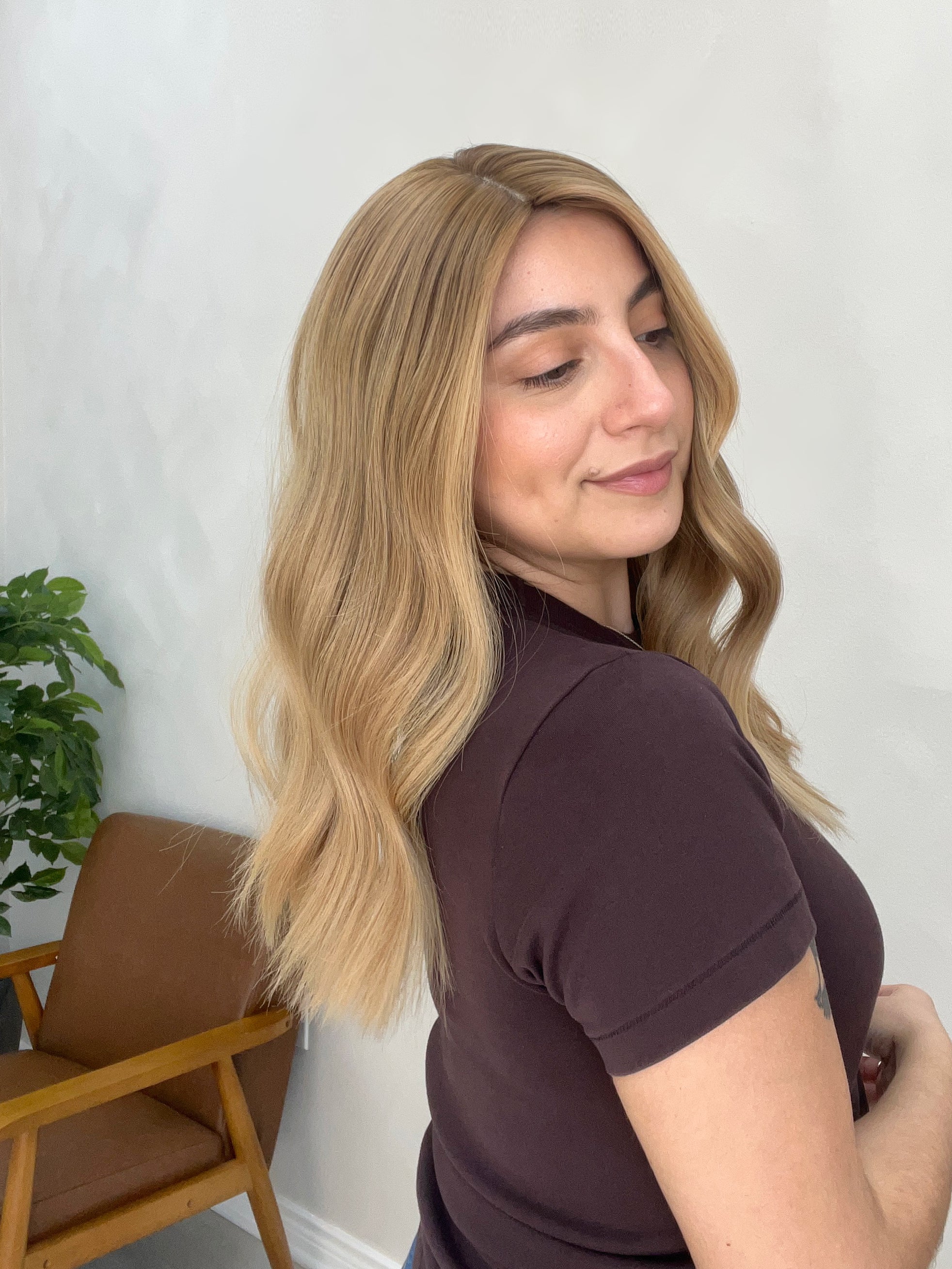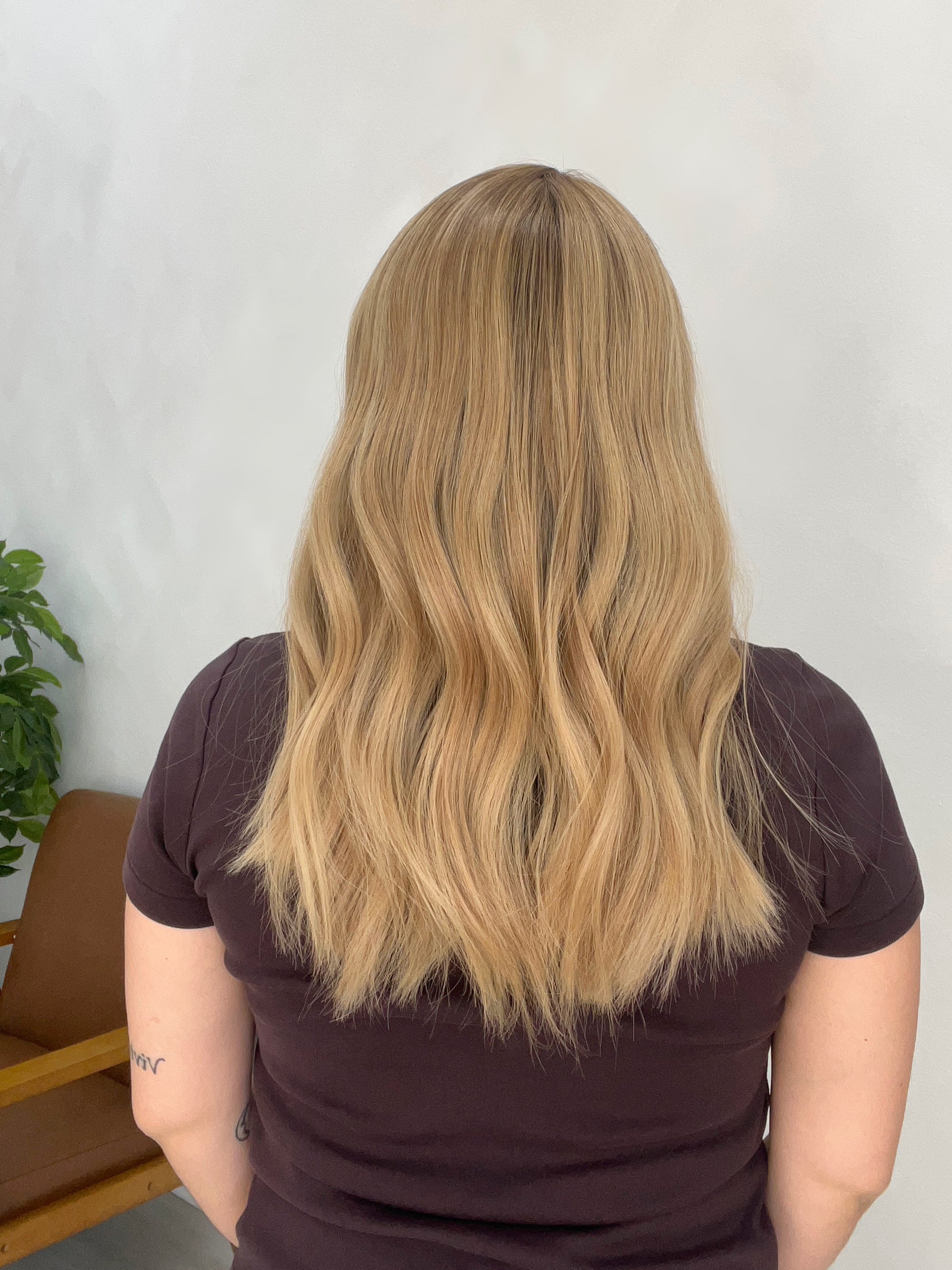 Color: Short darker shadow root into a dimensional honey beige blonde with lighter creamy blonde tones and darker blonde throughout