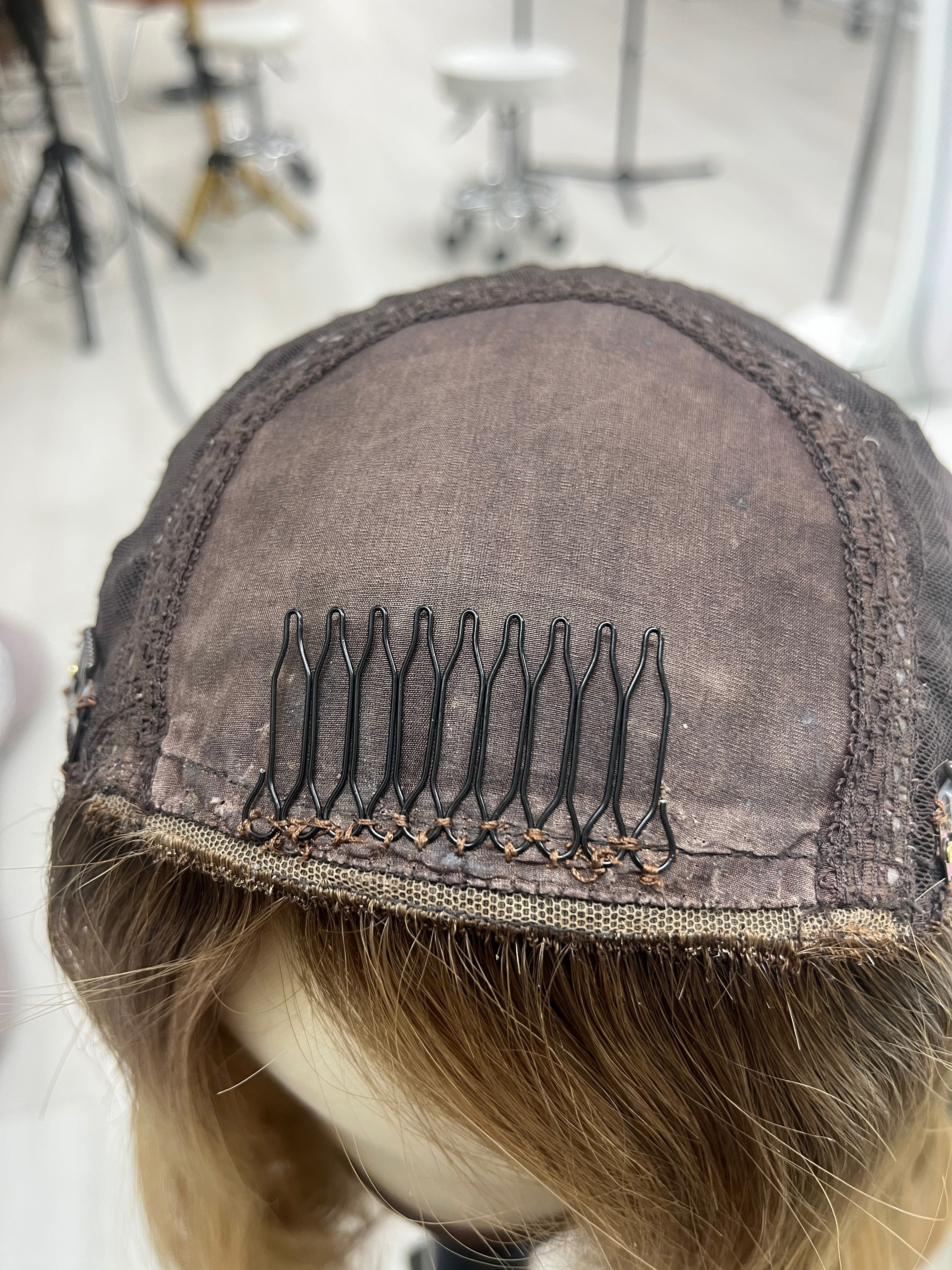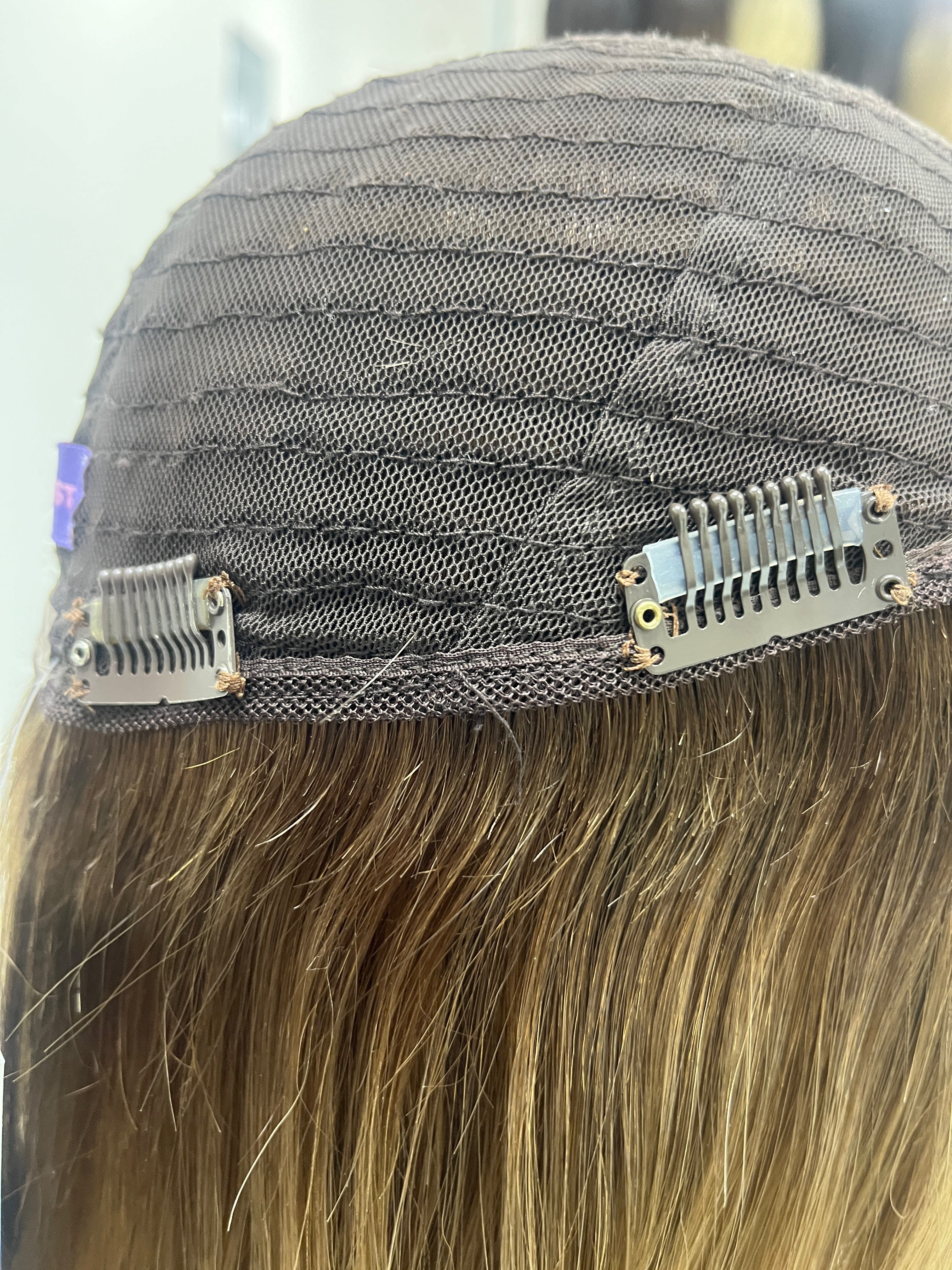 Other: Medium to medium light density (about 120%). The front comb has been re-sewn in a slightly diagonal line. Some loose thread by one side of the cap that does not affect the integrity of the piece. Light wear and tear on the clips. There is light discoloration on the silk top that is not visible and does not affect the integrity. There are return/baby hairs near the front of the silk top rim.