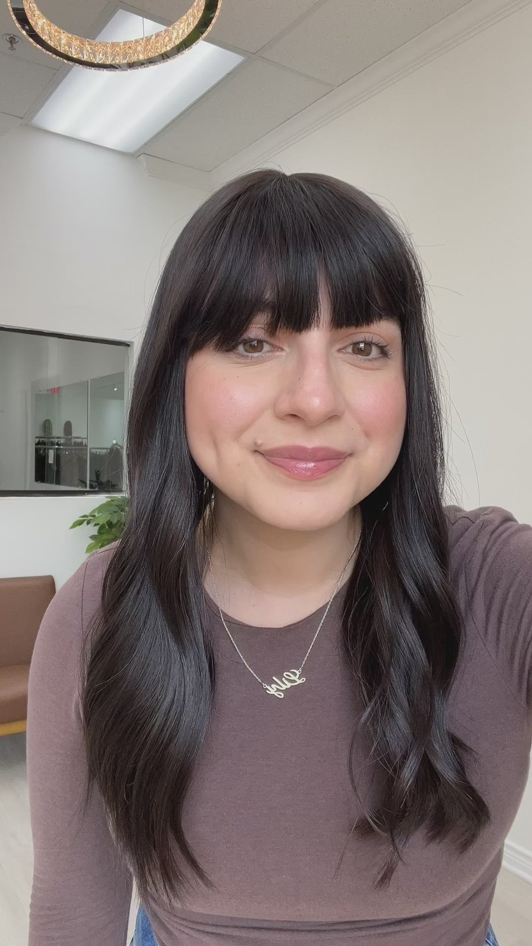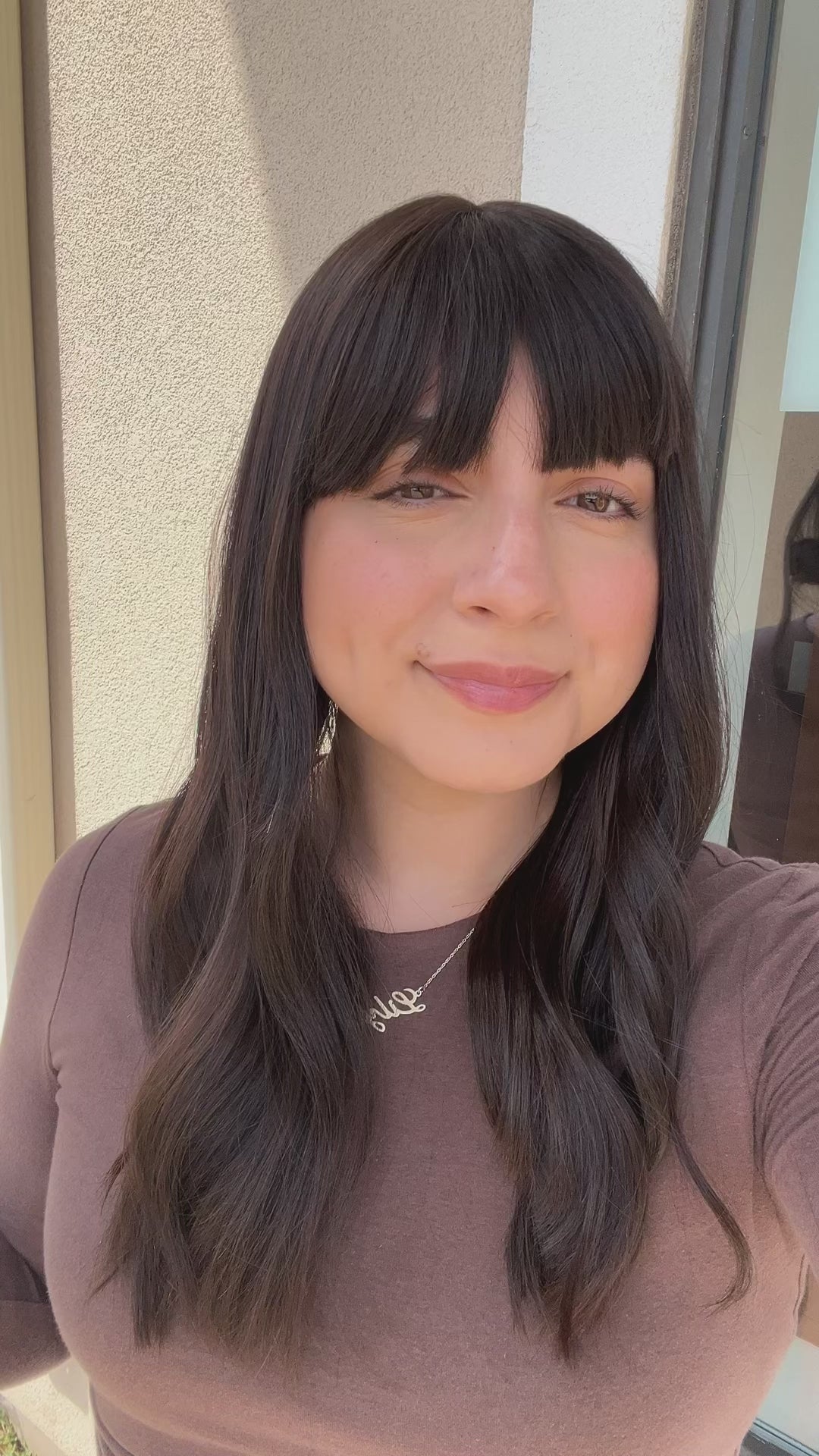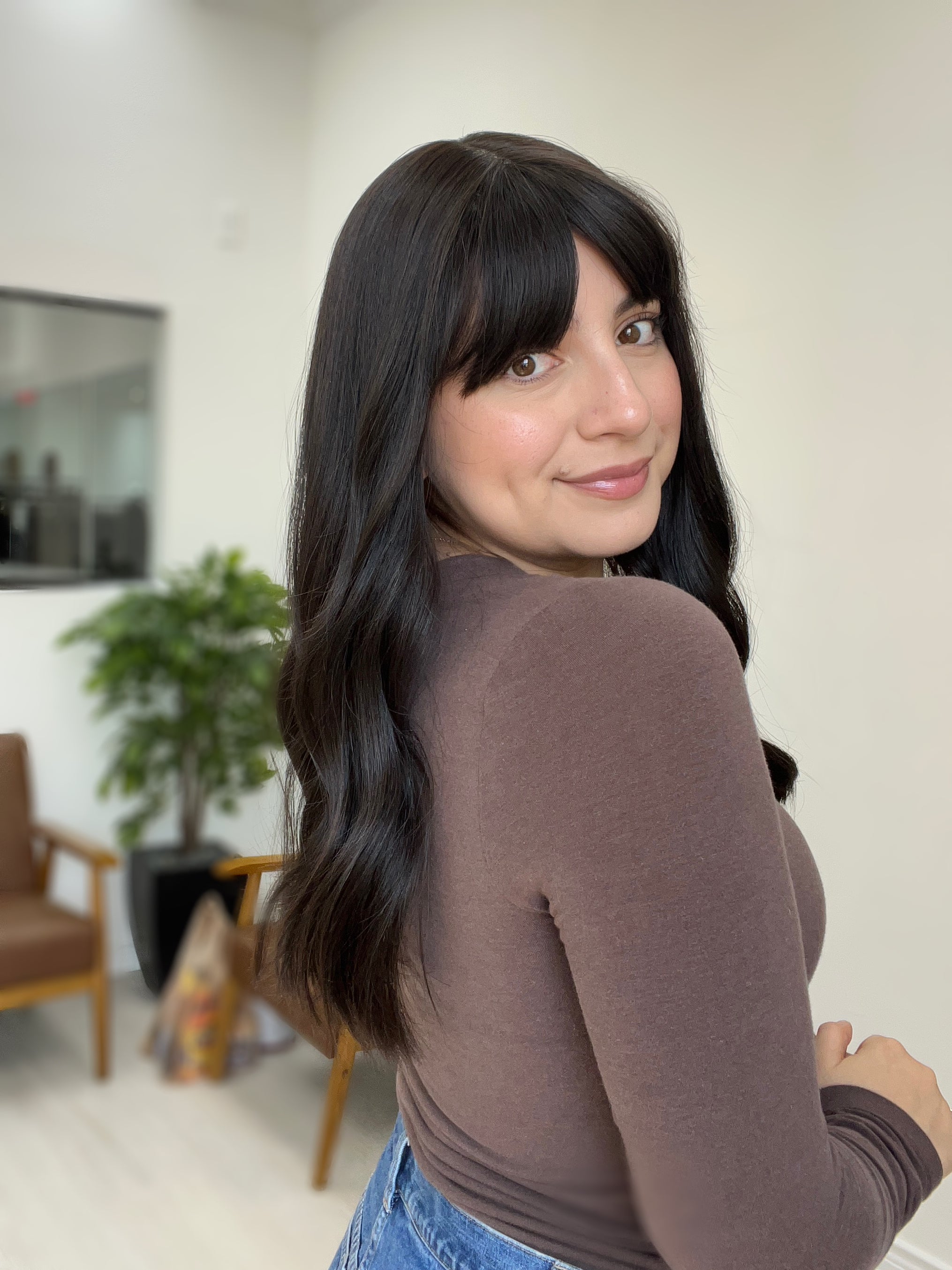 A beautiful soft black topper with bangs! You do not have to blend much of your hair (if any) with the topper due to the bangs. This piece is a great light density perfect for every day wear.