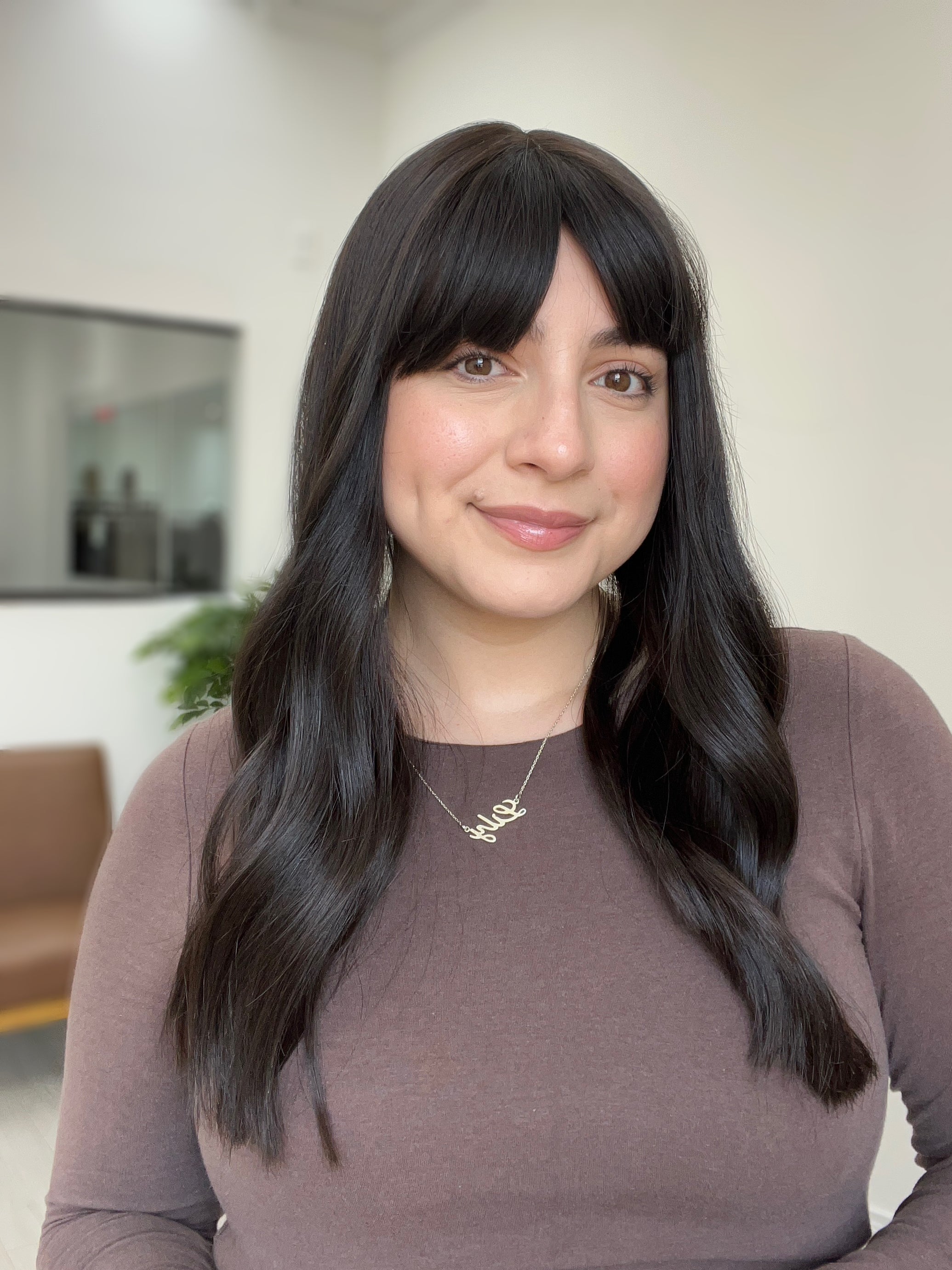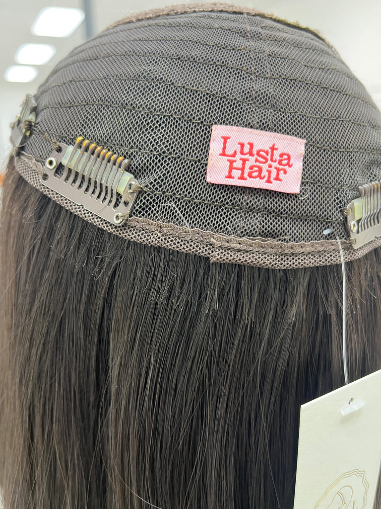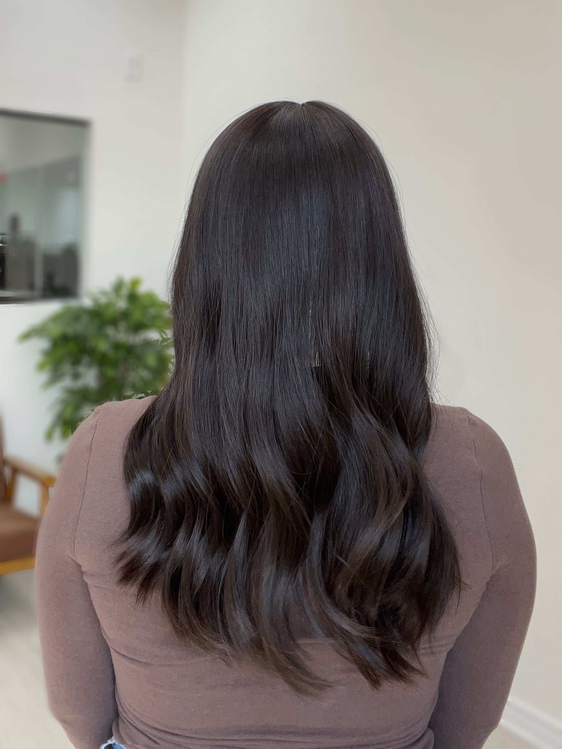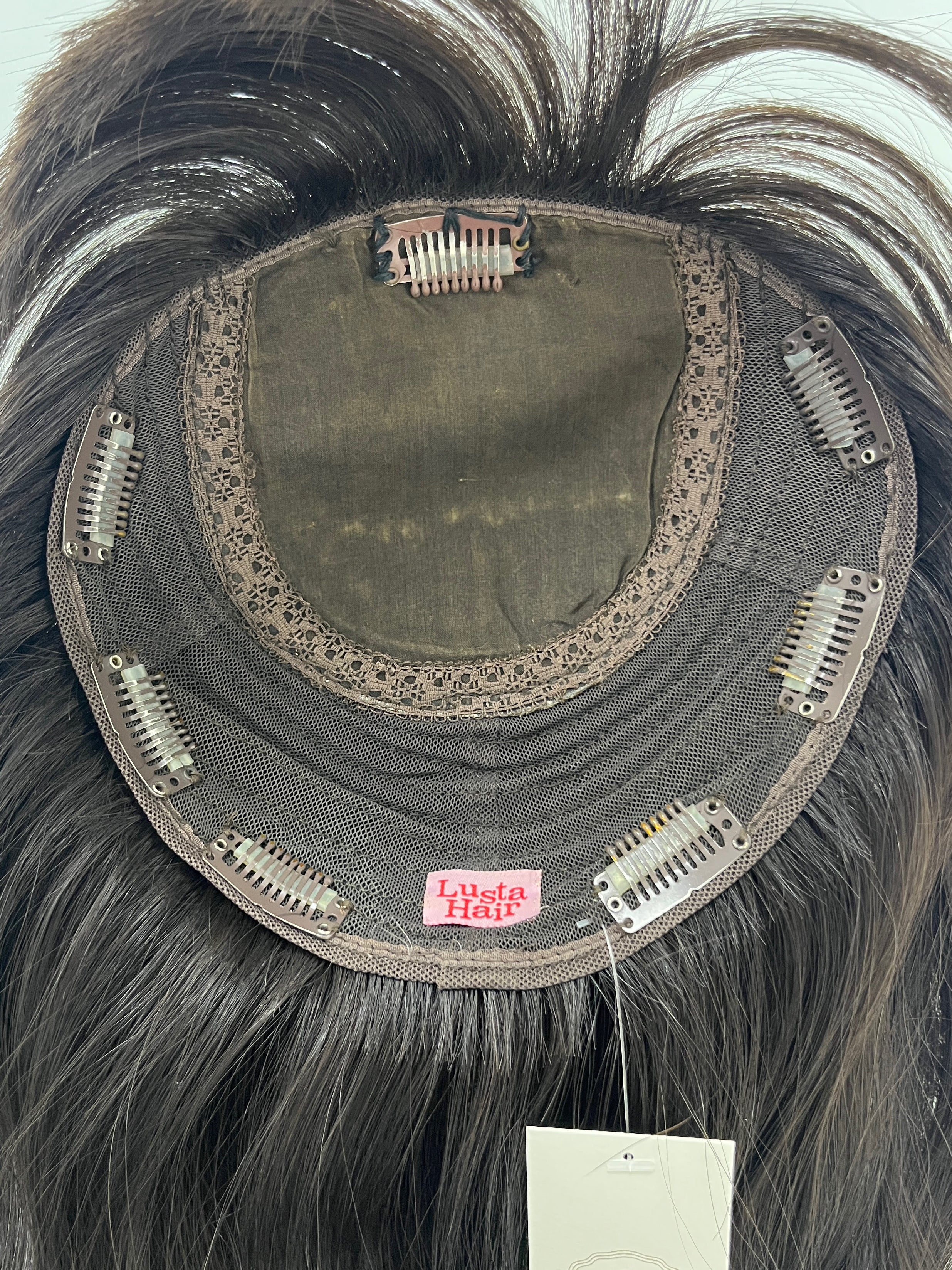 A beautiful soft black topper with bangs! You do not have to blend much of your hair (if any) with the topper due to the bangs. This piece is a great light density perfect for every day wear.