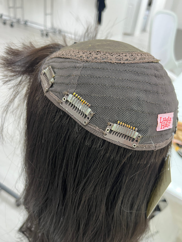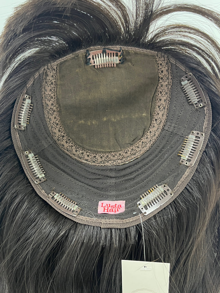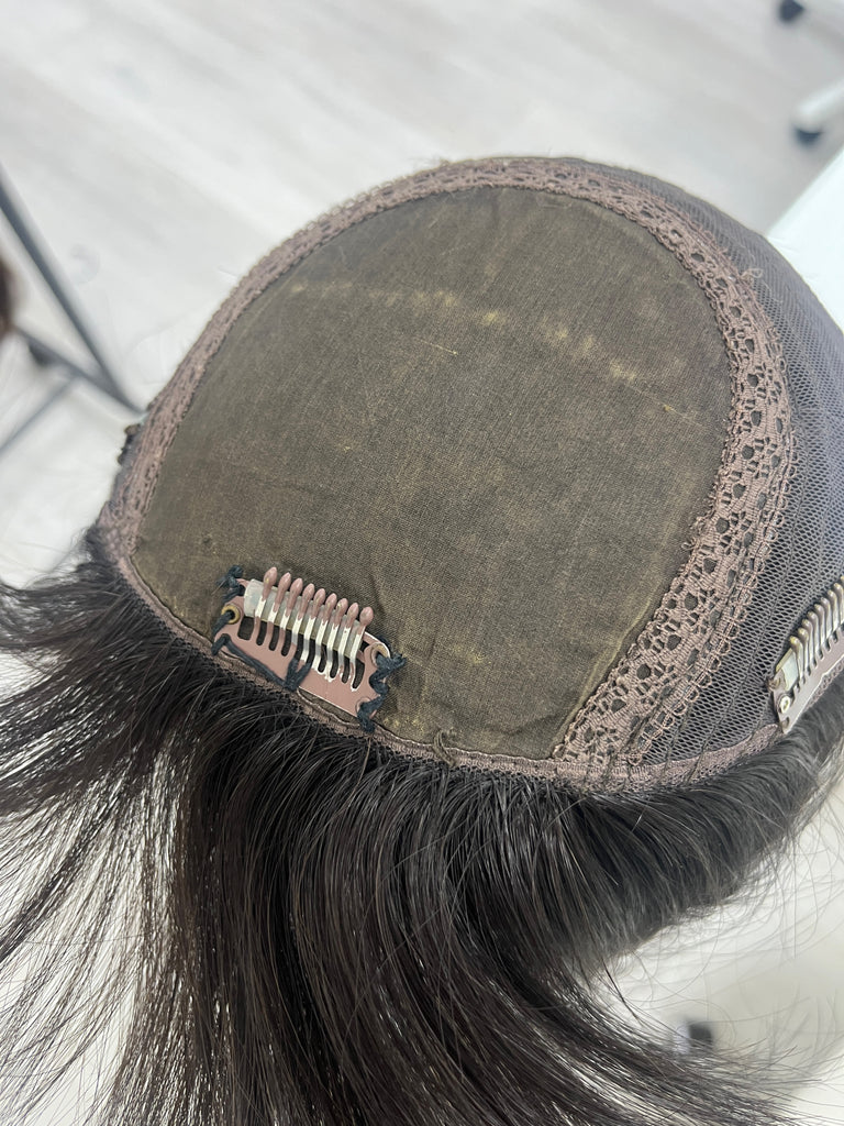 Other: Light medium density (about 115%-120%). The front comb has been removed and replaced with a clip that was sewn with different colored thread. There is some discoloration on the silk top that is not visible on the outside and does not affect the integrity of the piece. Light wear and tear on the clips. There is loose thread near the bottom of the cap that does not affect the integrity of the piece.