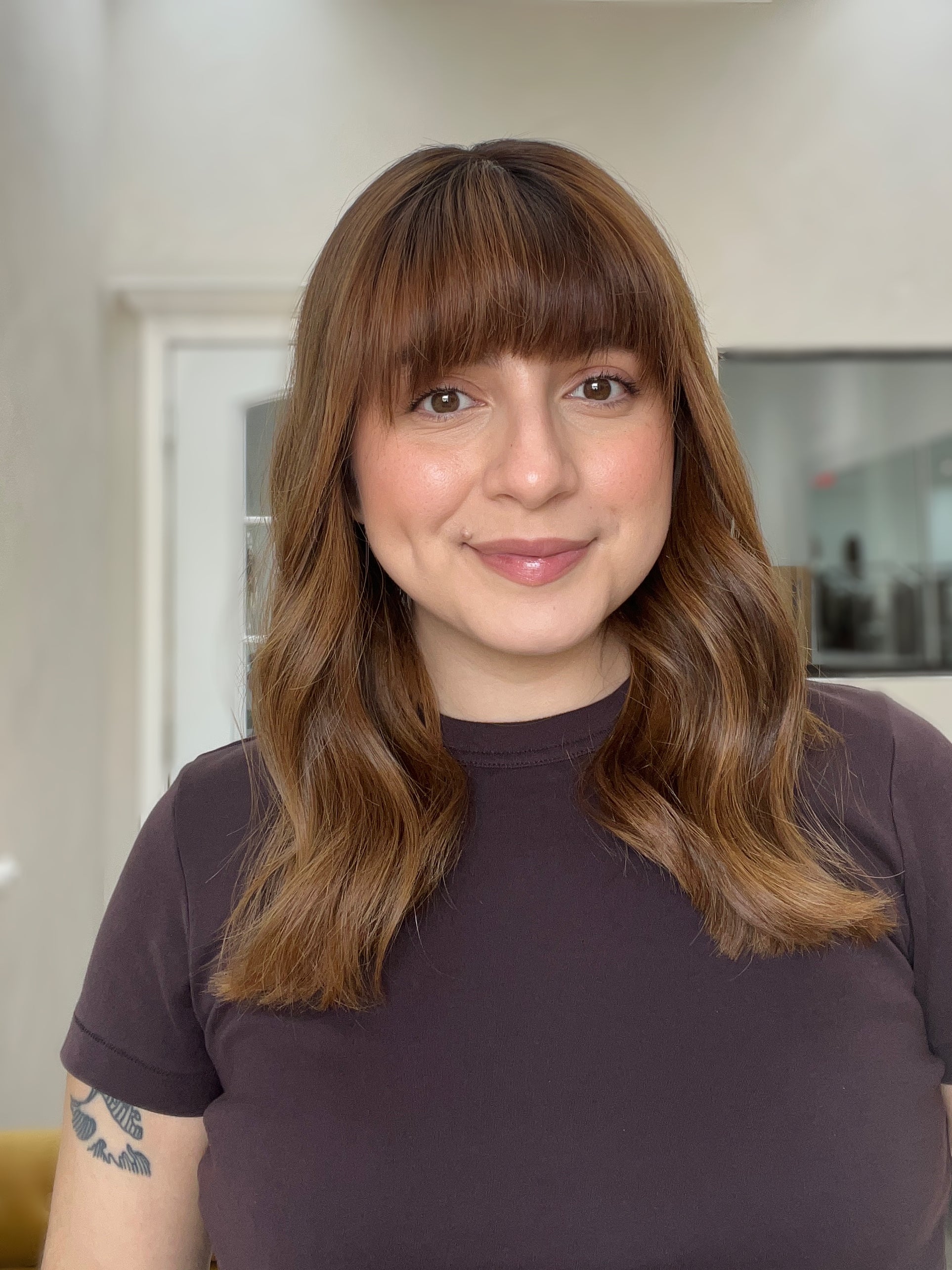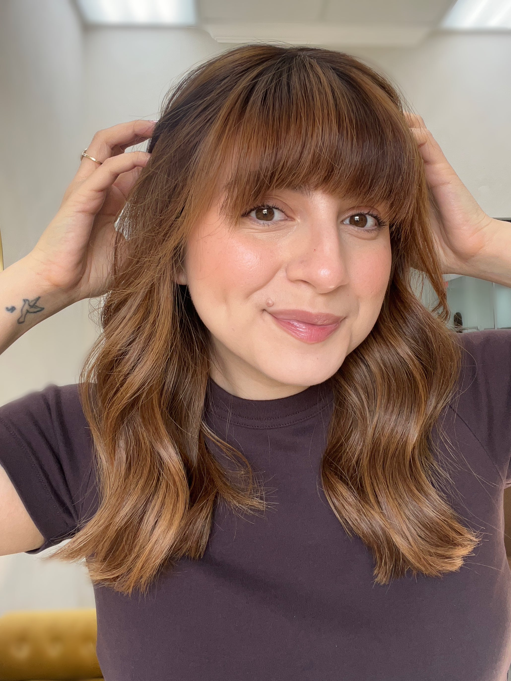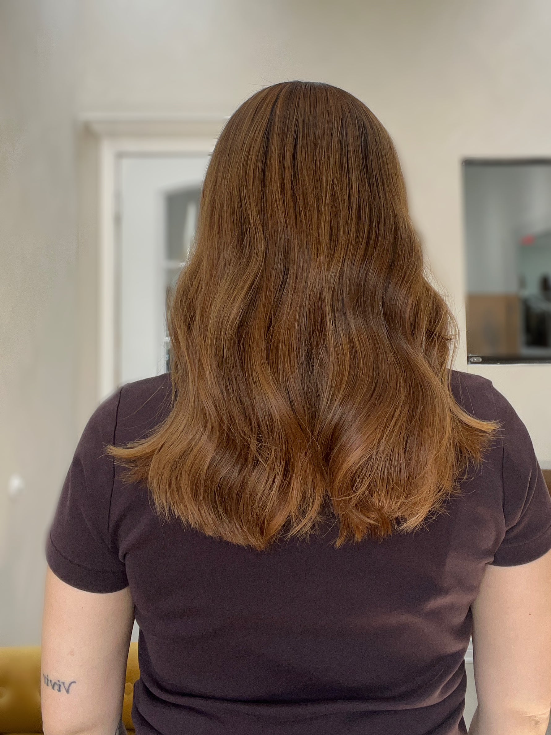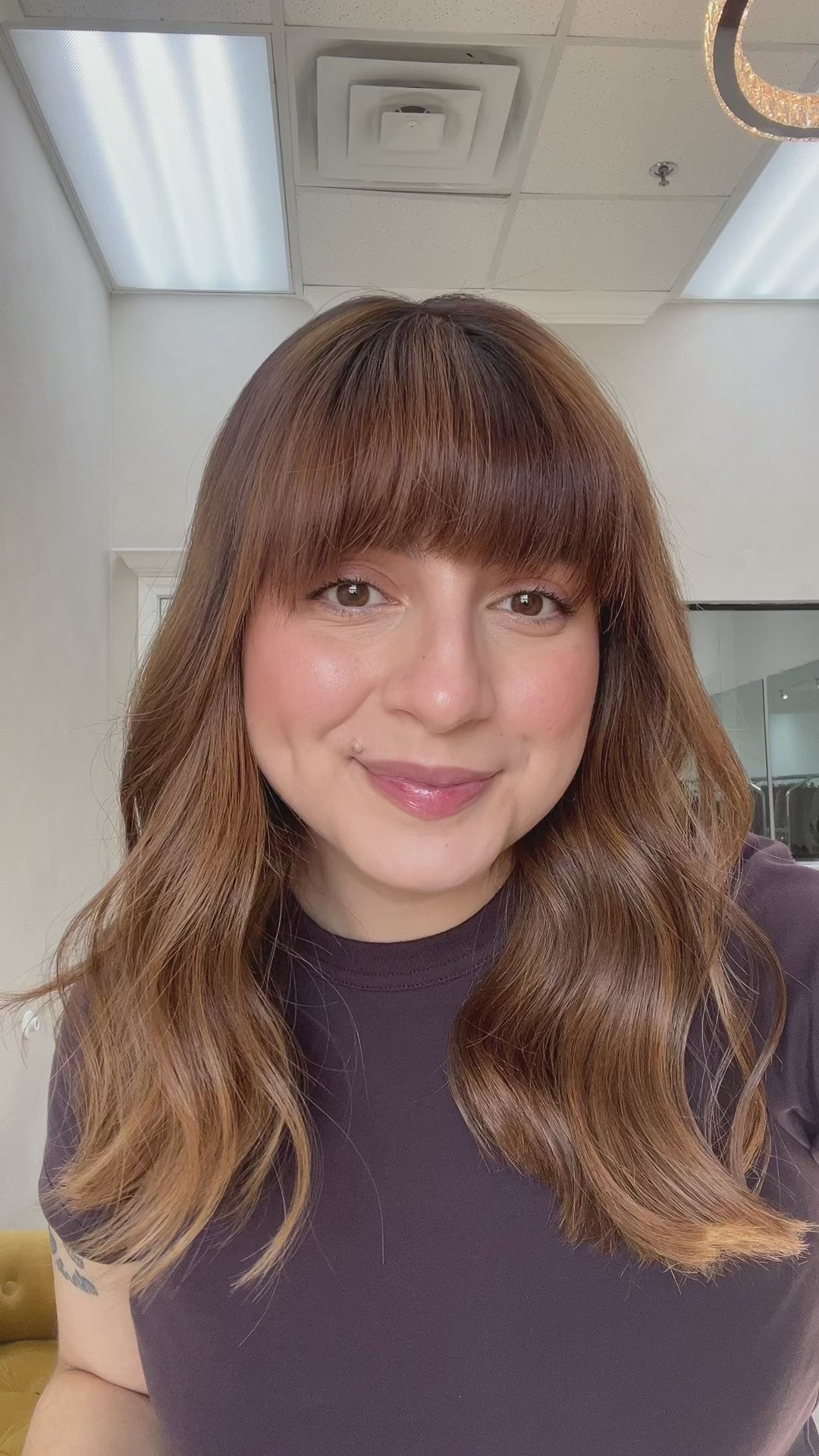 Color: Dark medium brown root into a copper chestnut balayage with lighter copper highlights and warm tones overall