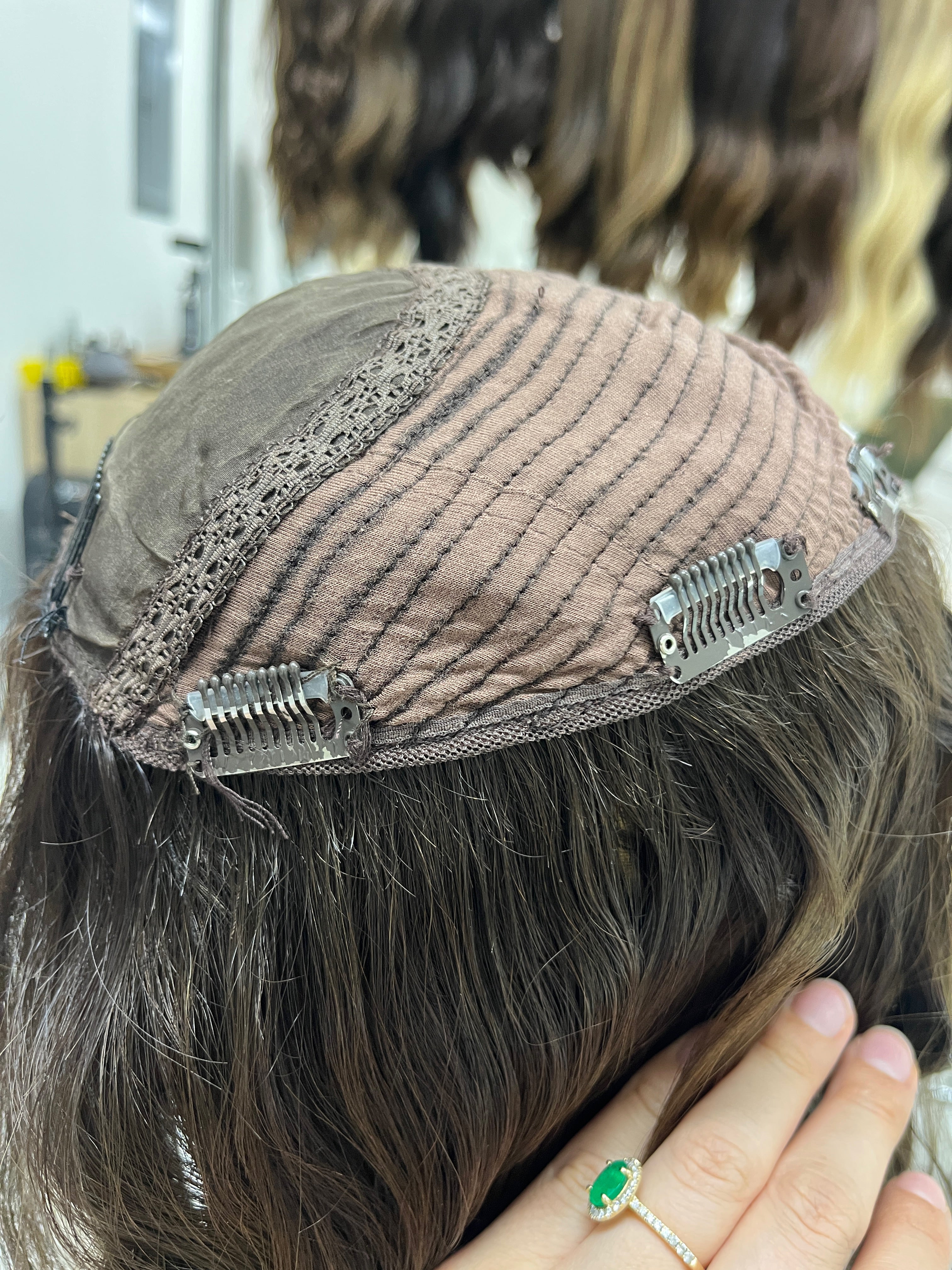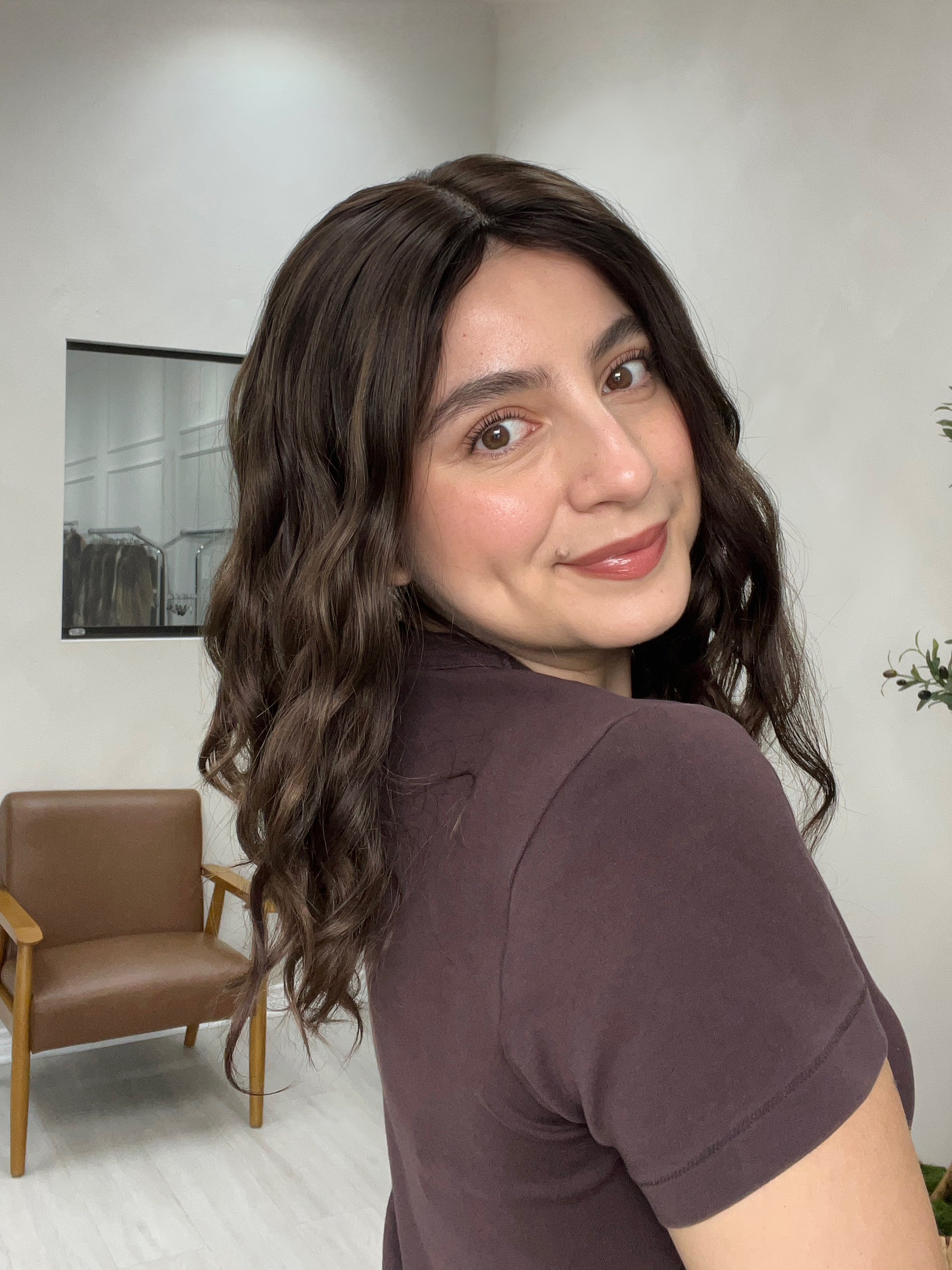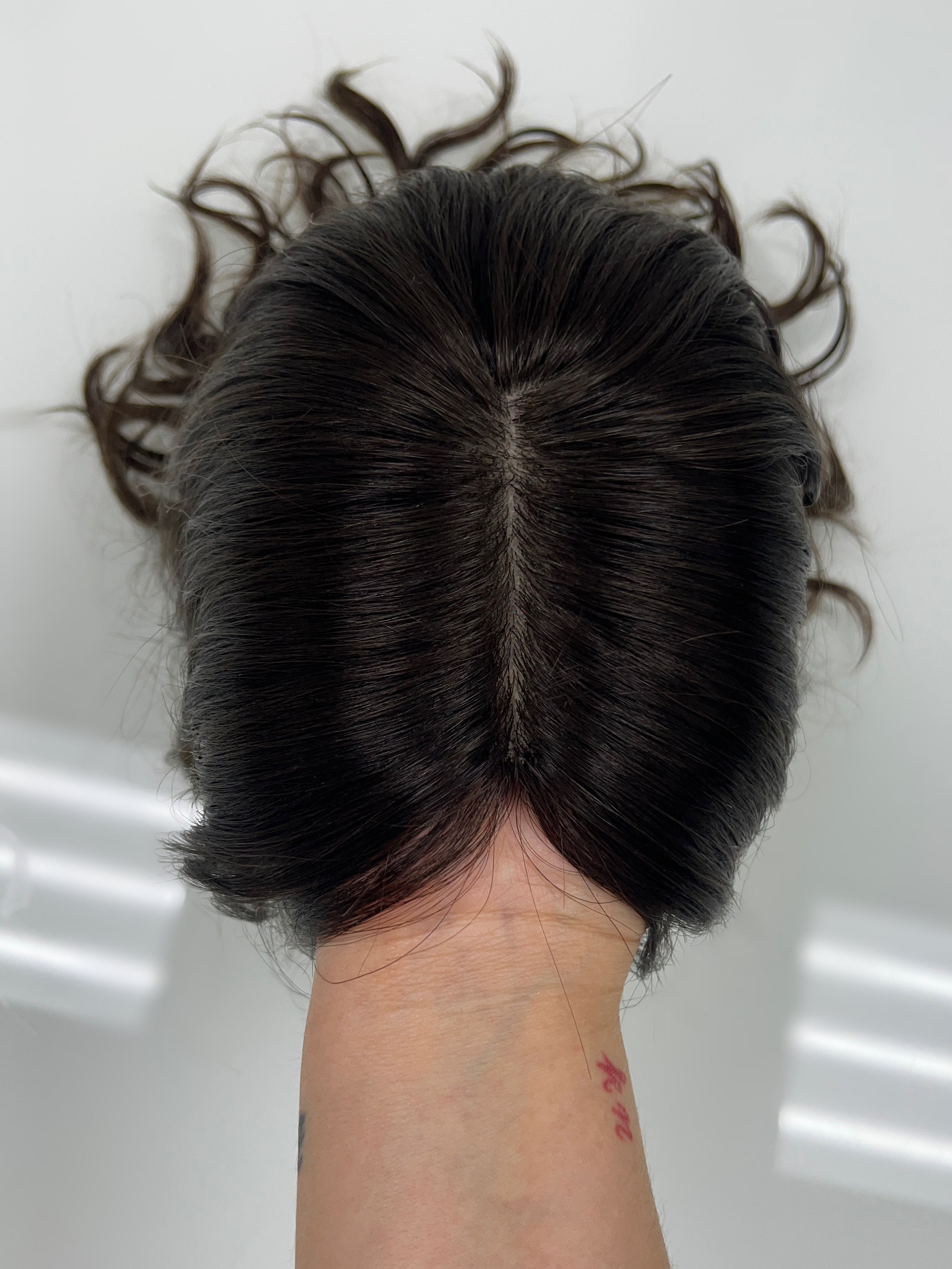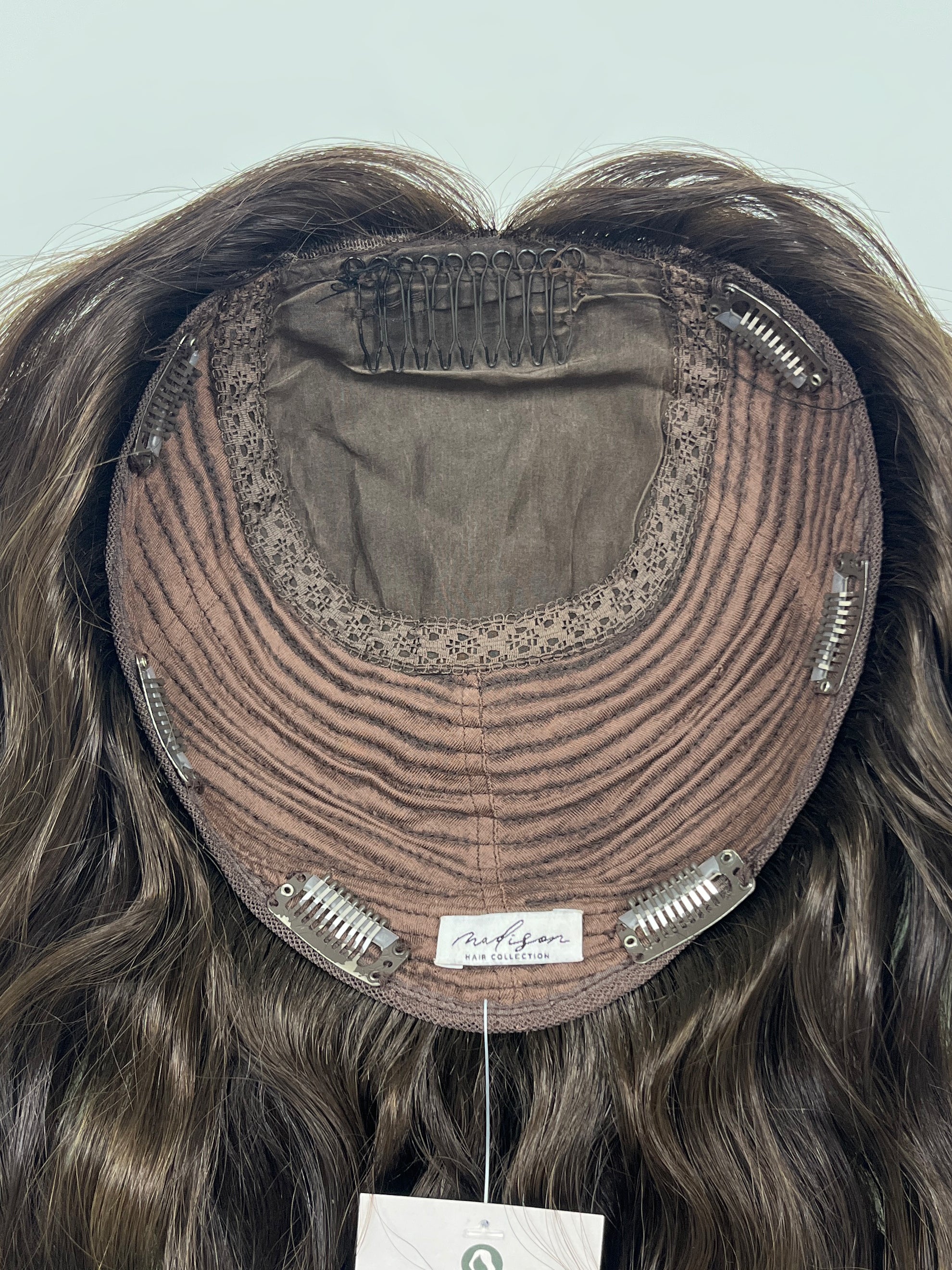 This beautiful silk top topper is a part of the fine texture natural collection from Madison Hair Collection - the texture is different than their typical Mongolian hair texture. It is ideal for those who have baby fine hair and naturally wavy texture. The density feels very lightweight and great for everyday wear. The bigger cap size is also a great option for those looking for extra coverage for hair loss or hair thinning.