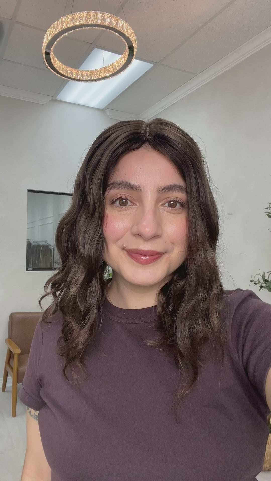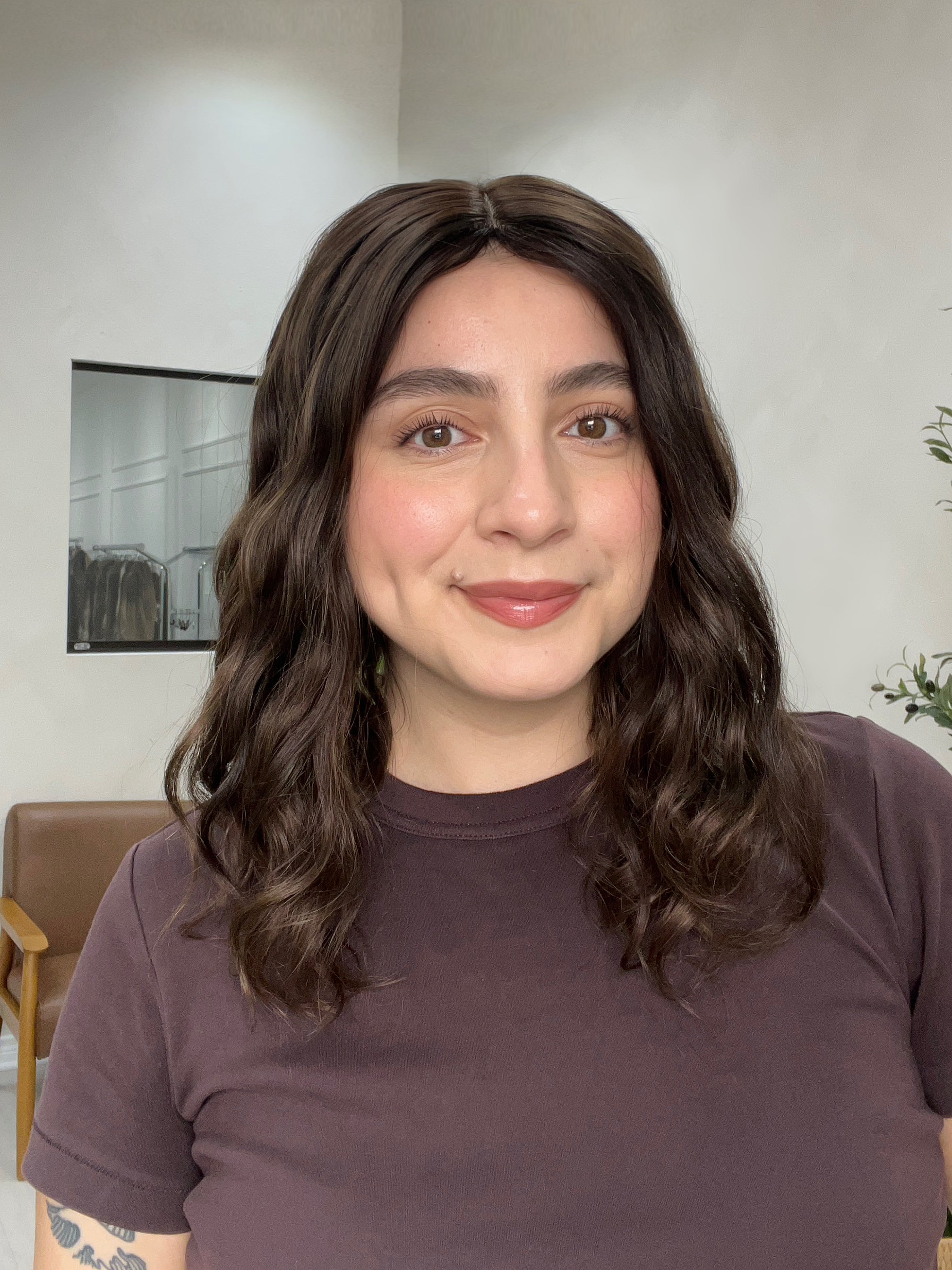 Considerations: This piece features t-shirt like jersey material for ideal comfort. The hair will dry slightly wavy to medium loose wavy according to the Madison Wigs website. We used the curly girl method to style this piece and let it air dry. The hair is sewn all over the rim so you don't have to blend much of your hair with it.