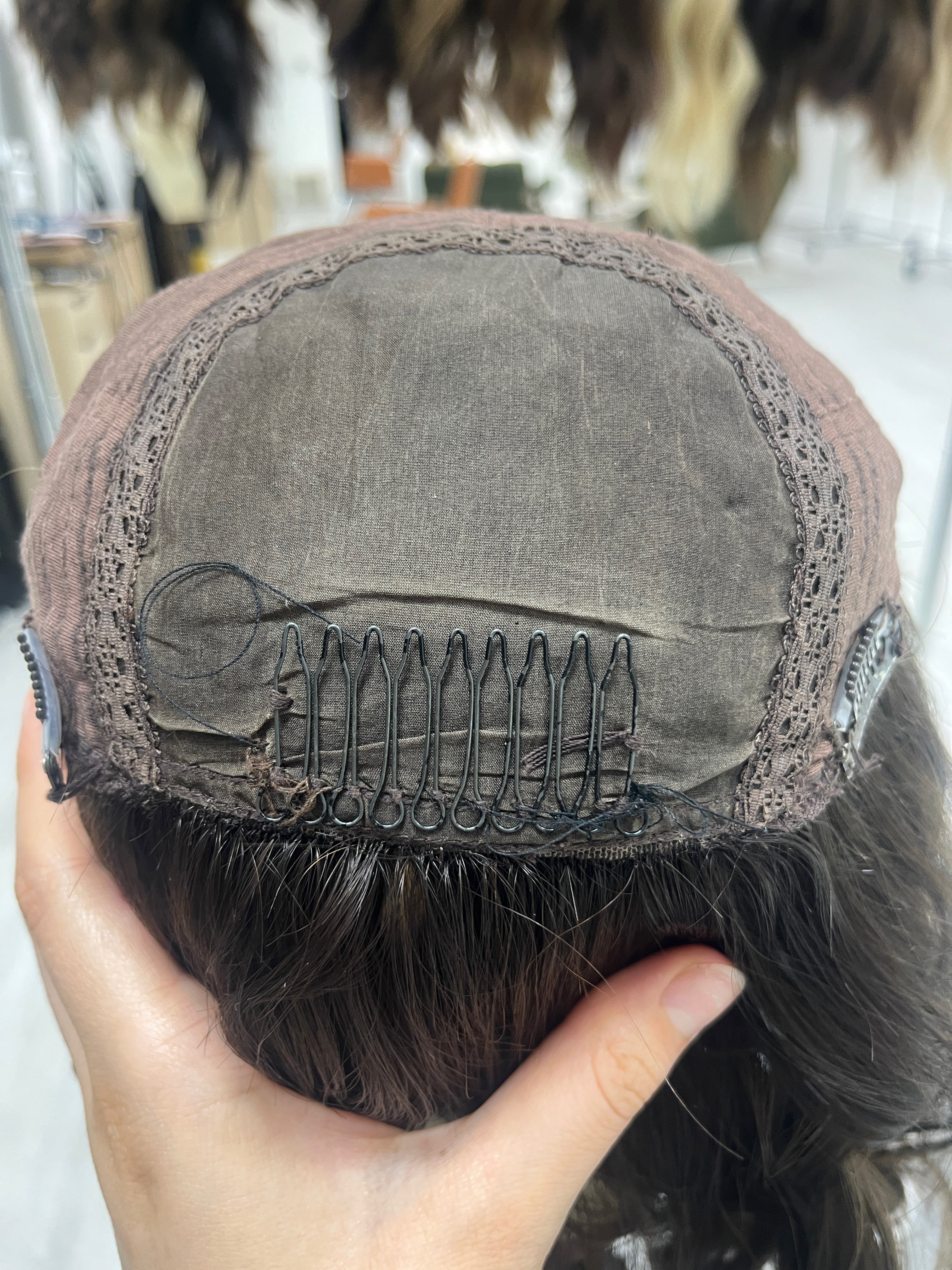 Other: Medium light density (about 120%). Wear and tear on the clips and comb. Two clips loose from one side and will need to be re-sewn/tightened. Loose thread by the front comb and some of the clips. Light discoloration on the silk top that is not visible on the outside.