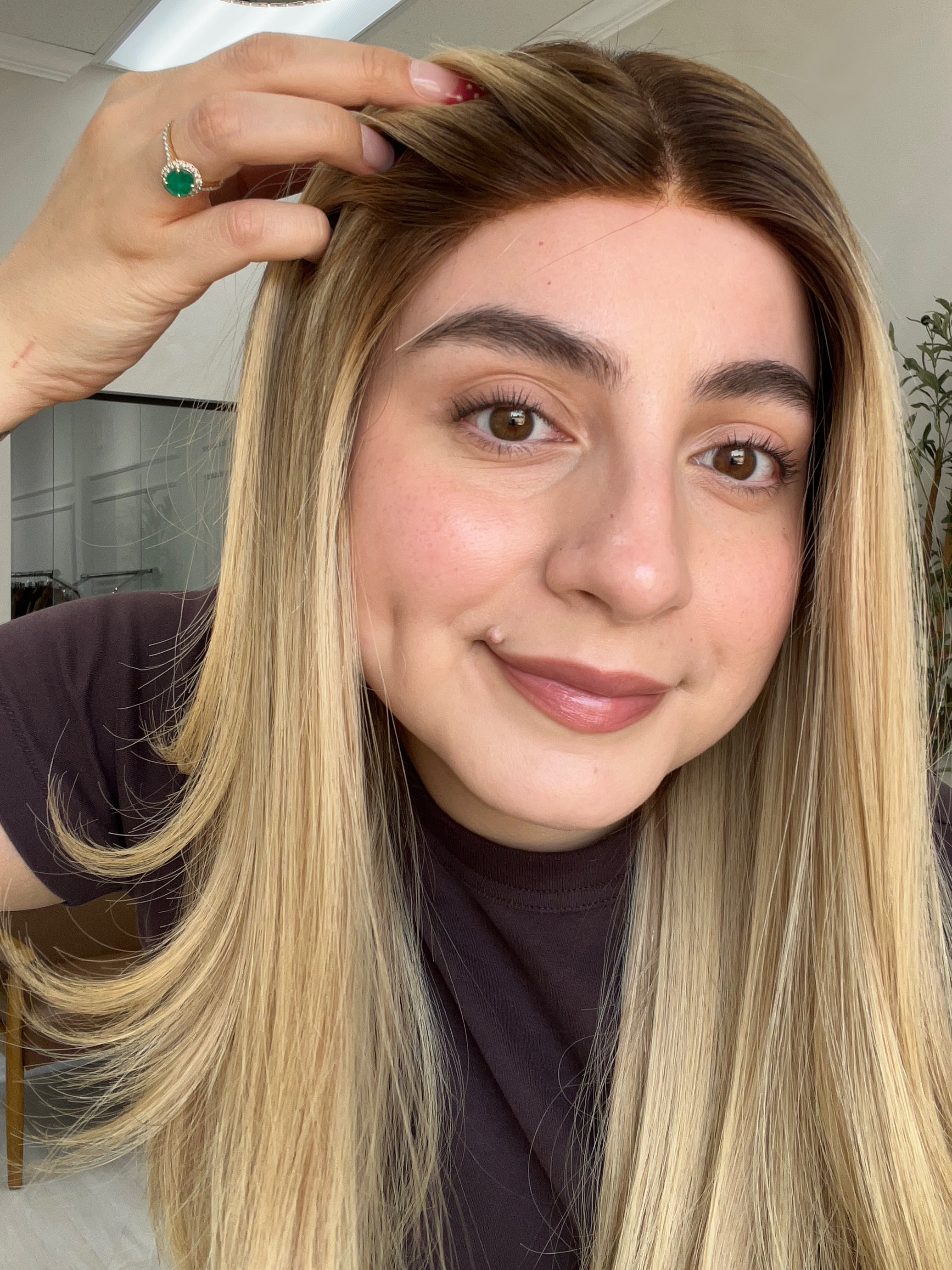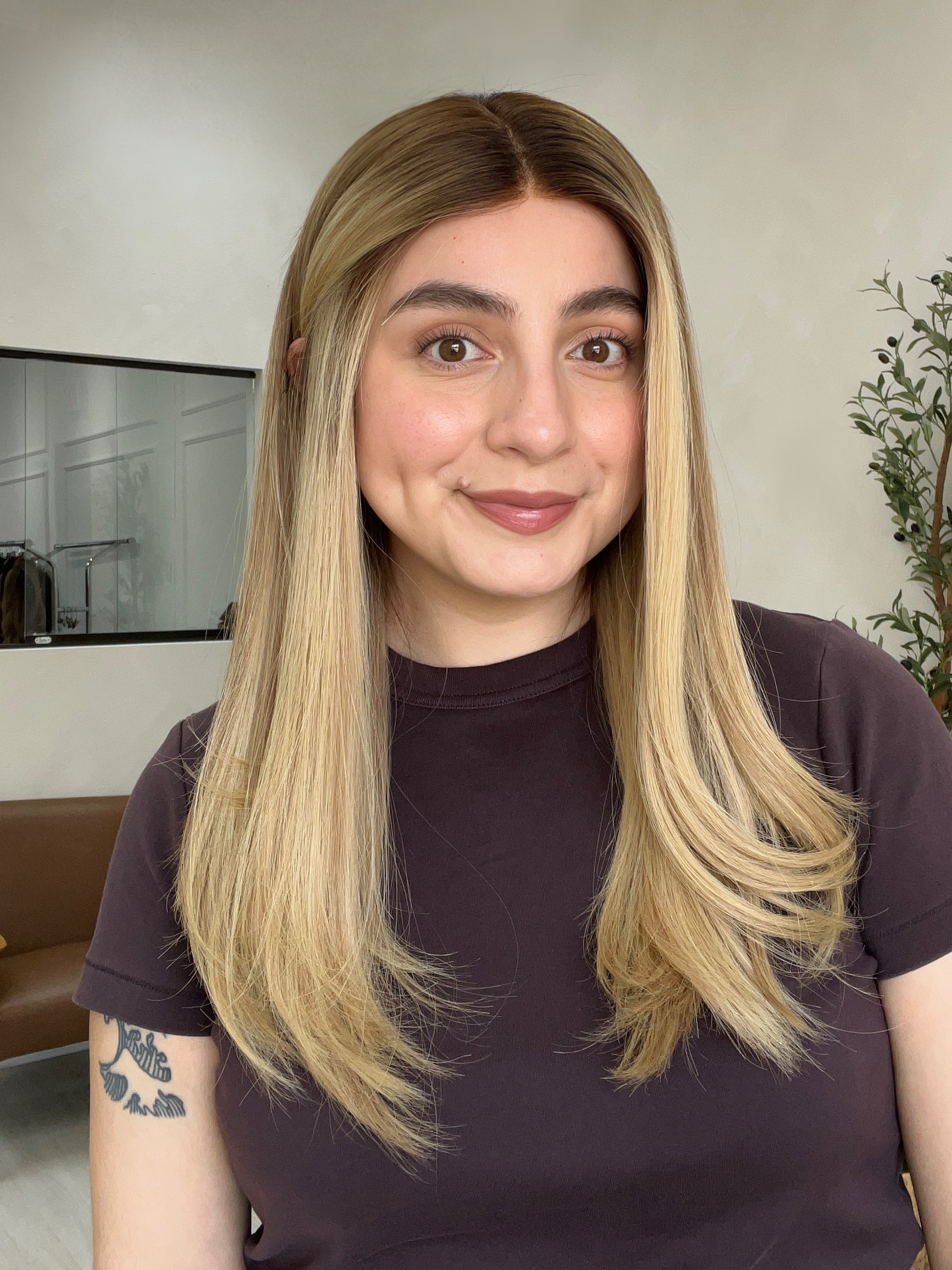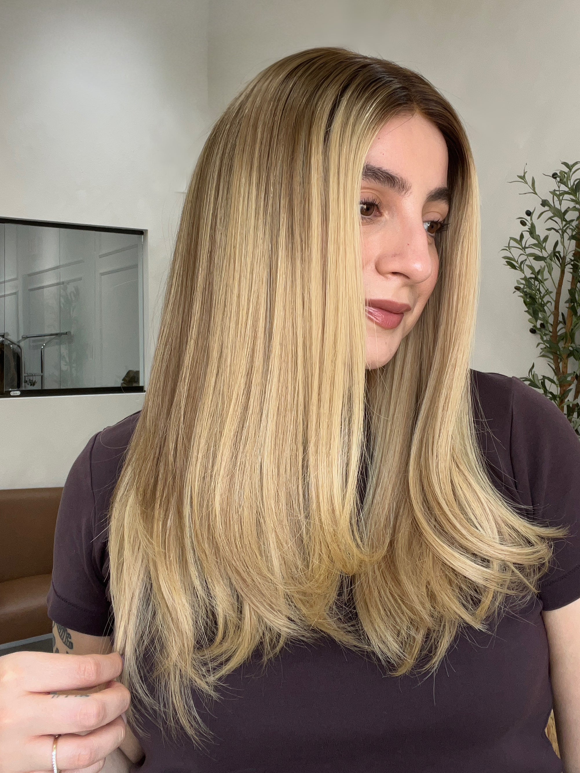 Color: Short dark root into a golden blonde/light brown blend with warm tones overall