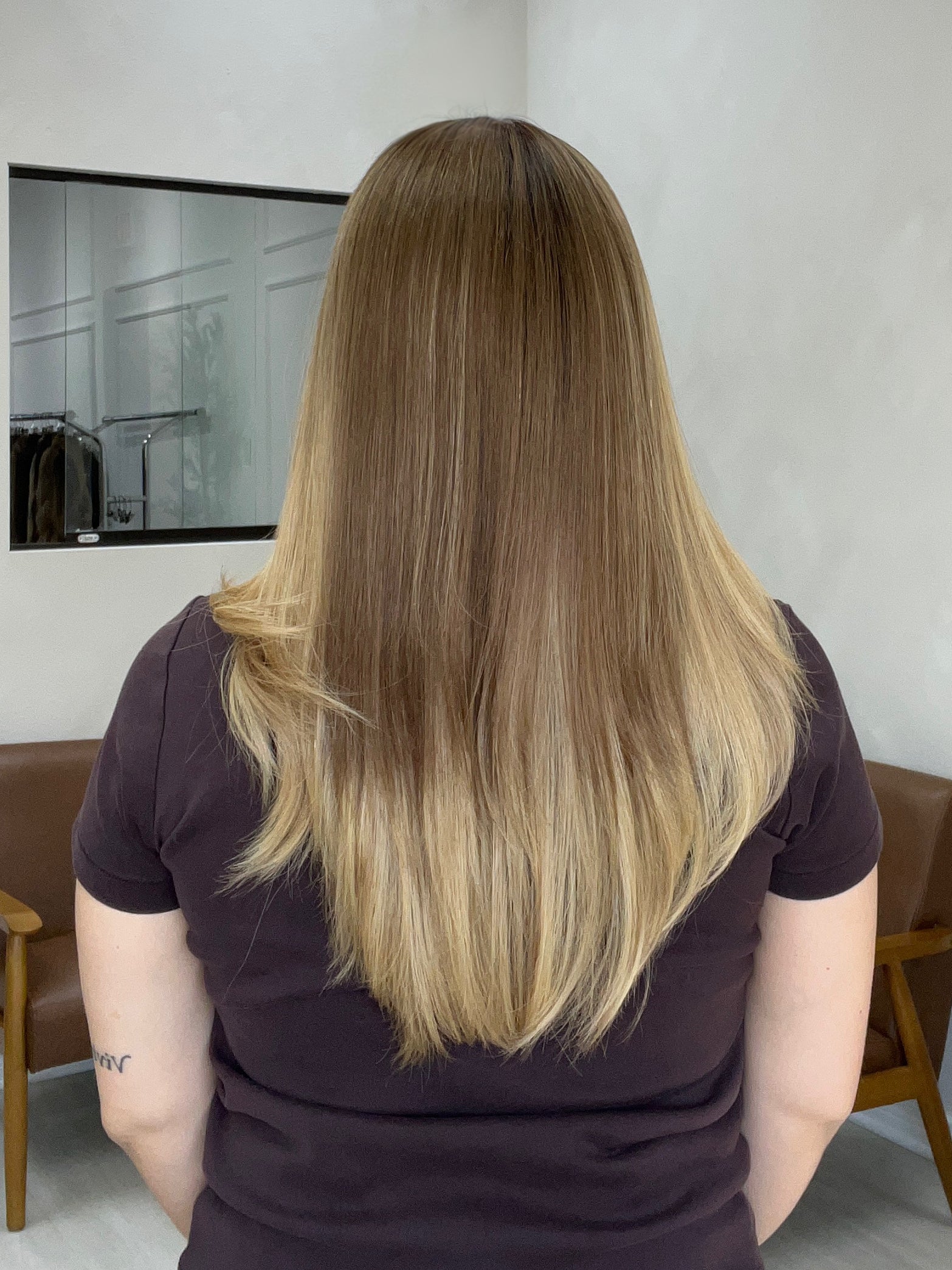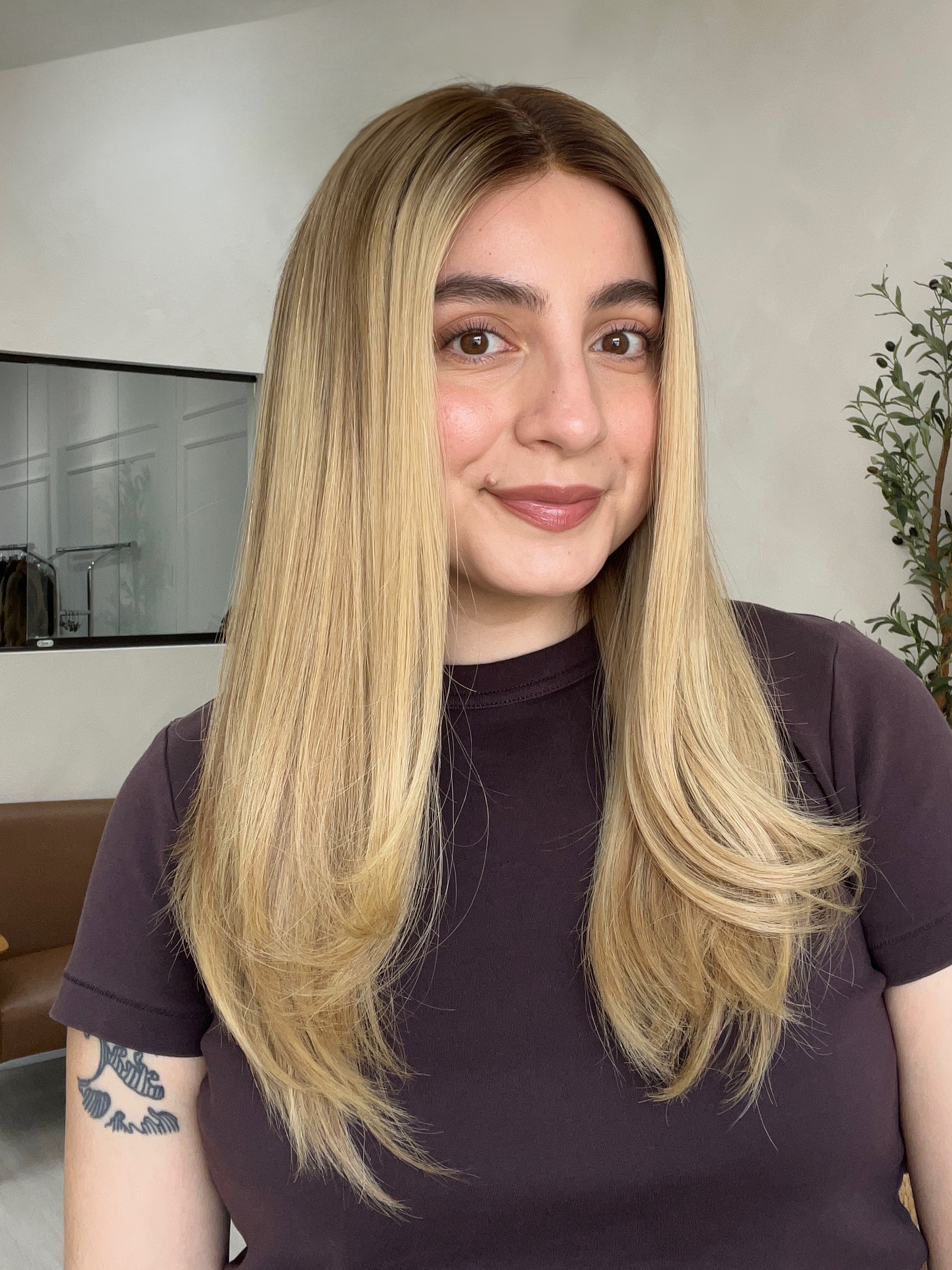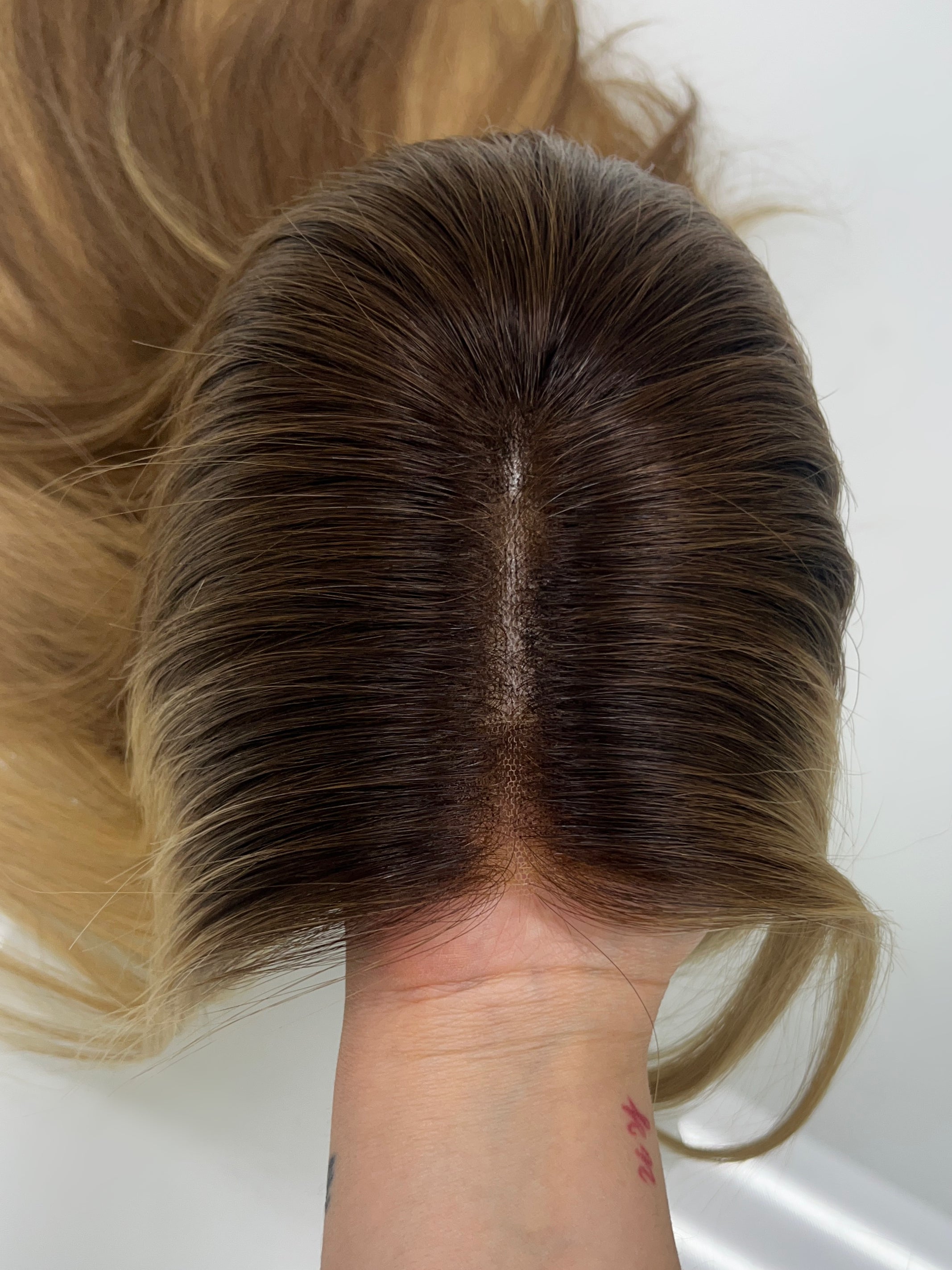 Color: Short dark root into a golden blonde/light brown blend with warm tones overall