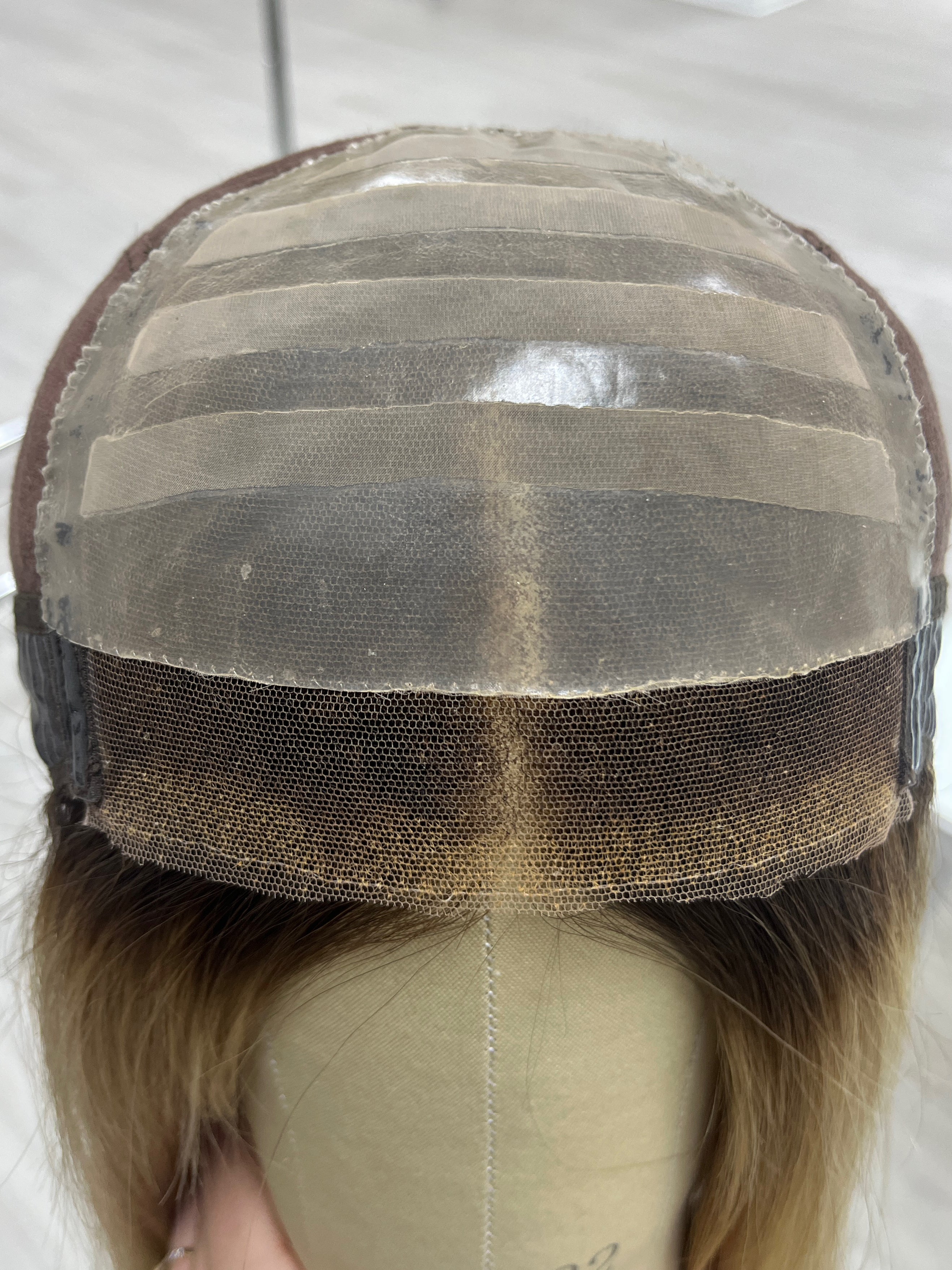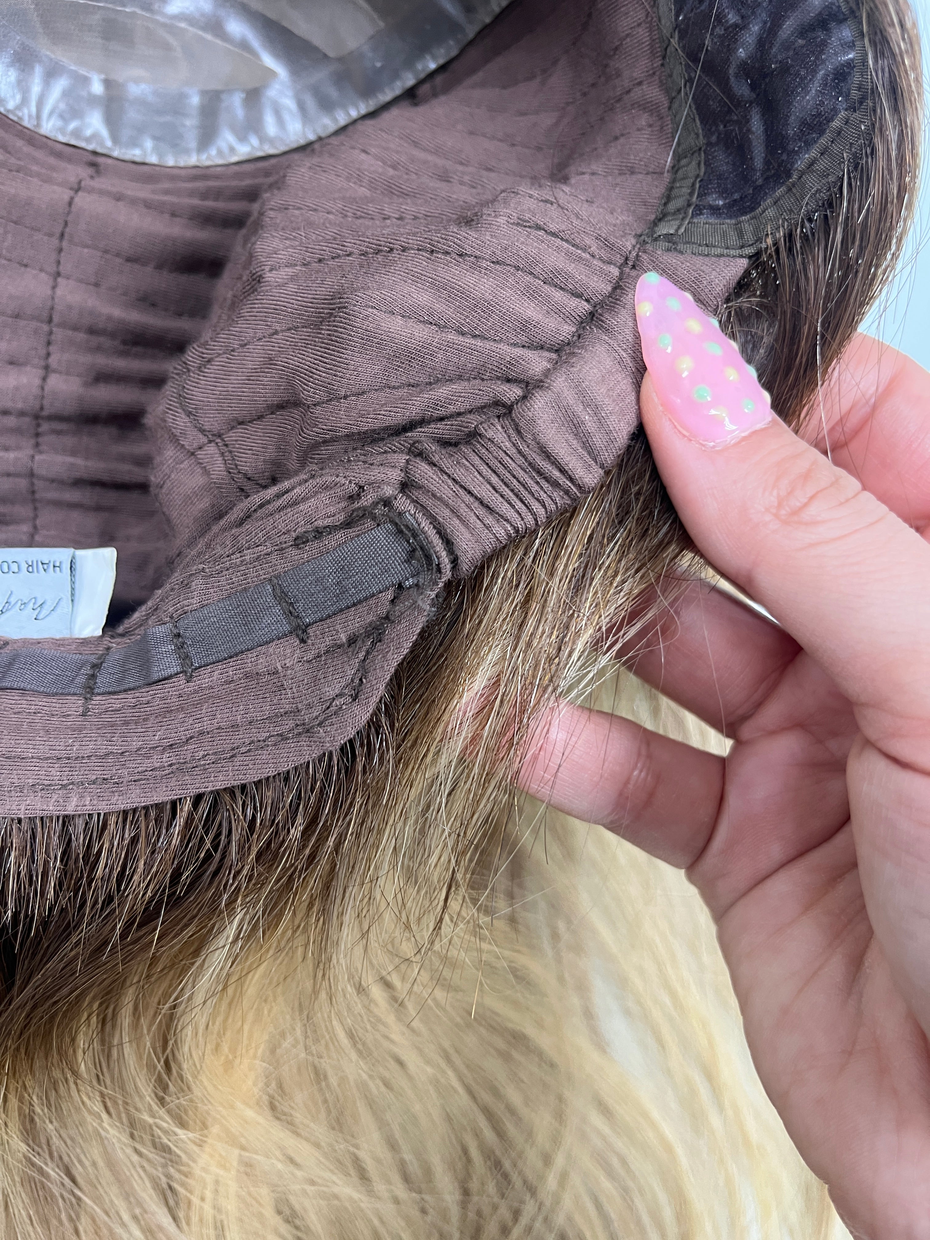 Other: Medium density (about 125%). Lace is cut very close to the hairline in a jagged method with a bit of fraying. Some short hairs sticking out near the front that are not visible when wearing. Knots are lightly bleached about 1 cm near the front of the hairline. The rest of the knots are not bleached, they are lightly plucked. The knots on the lace top are a bit more sparse than usual (this is not necessarily knot fallout and is not noticeable when wearing). This piece has no clips or comb. There is staining on the silk/silicone lining and inside the cap that is not visible on the outside. Light wear and tear on the silicone lining on the ear tabs that does not affect the integrity of the piece. Note: this piece has thread sewn going across the cap in the middle that may have been to resize. One of the adjustable strap hooks is stuck inside the fabric. Some loose thread by the nape that does not affect the integrity.