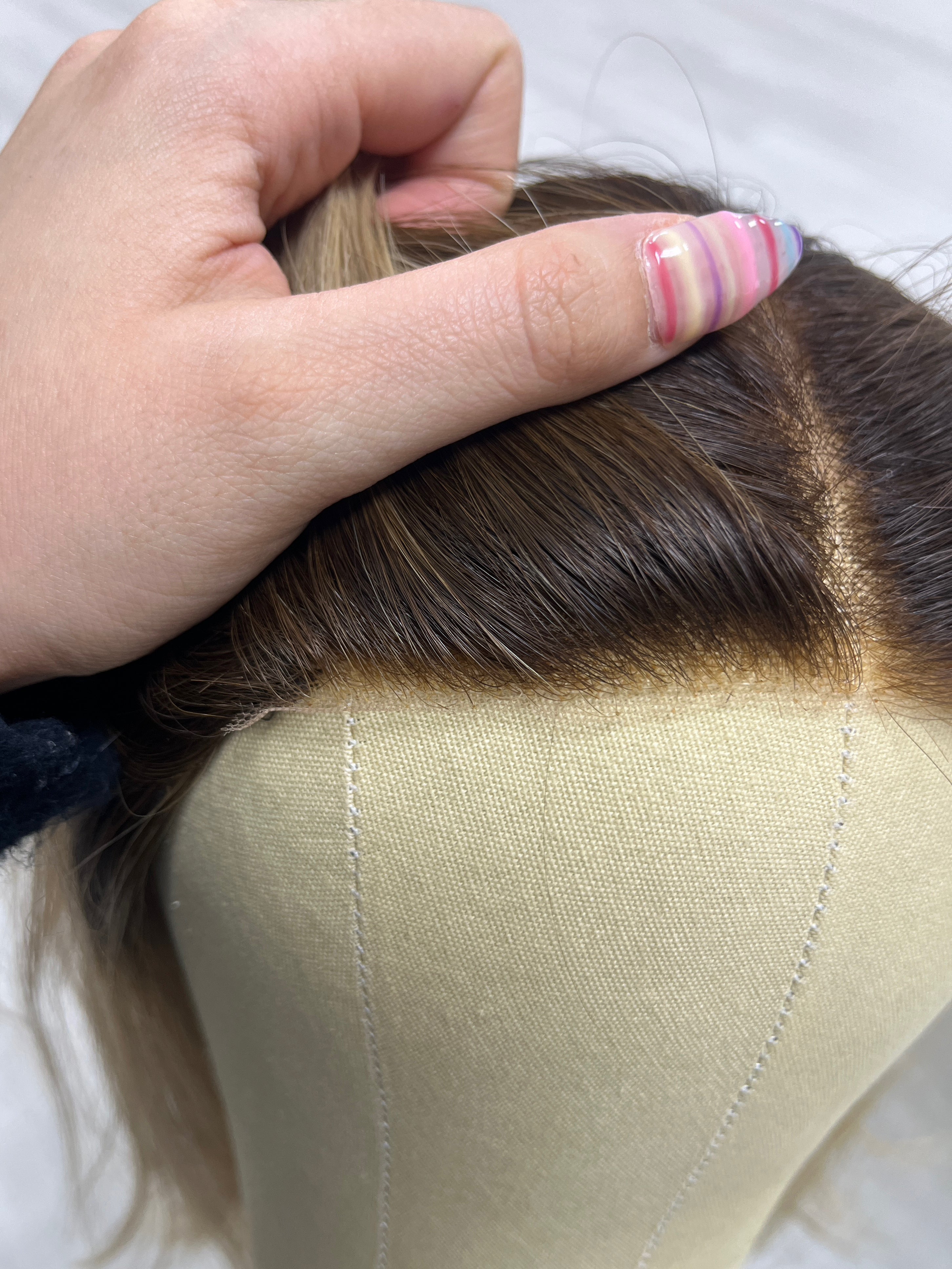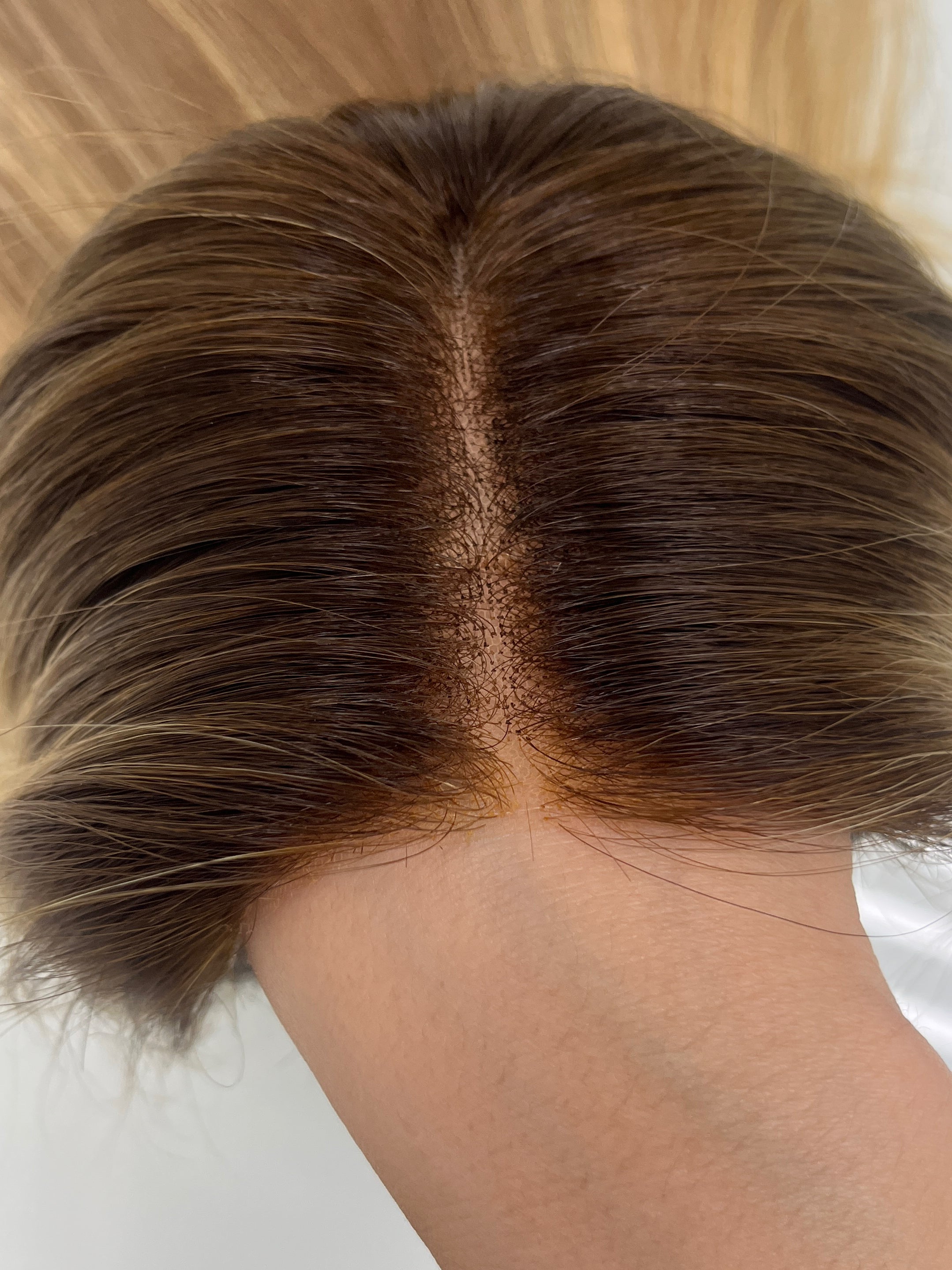 Considerations: There are a bit more return hairs than usual - you can use a hot comb/wax stick/water spray bottle or a combination of all three to further pat down if you do not prefer. The color/root has oxidized and there are some color irregularities on the blend with more blonde in the front and brunette toward the back - you can take this piece to a professional to tone/neutralize. Overall, this piece is in good condition.