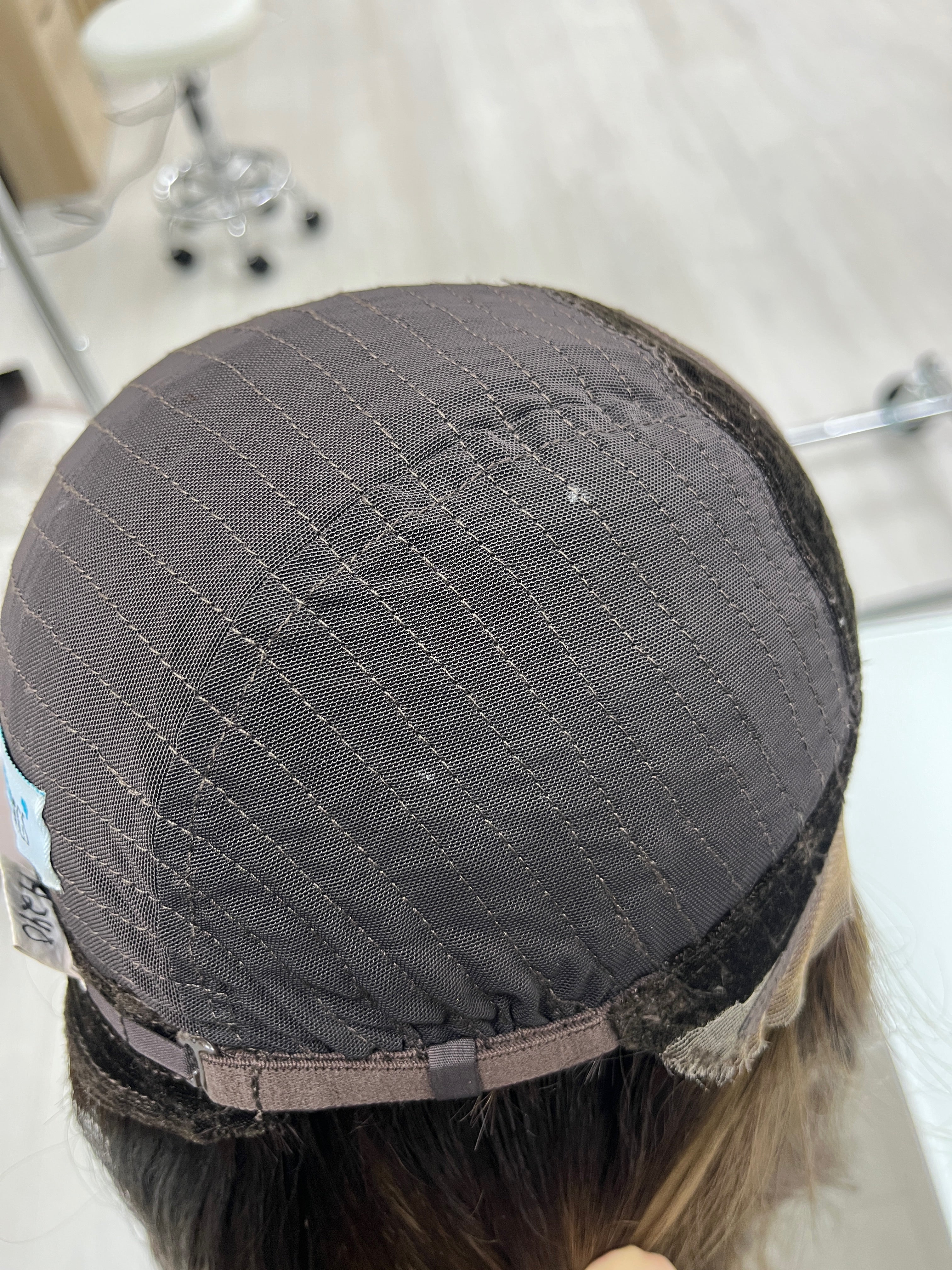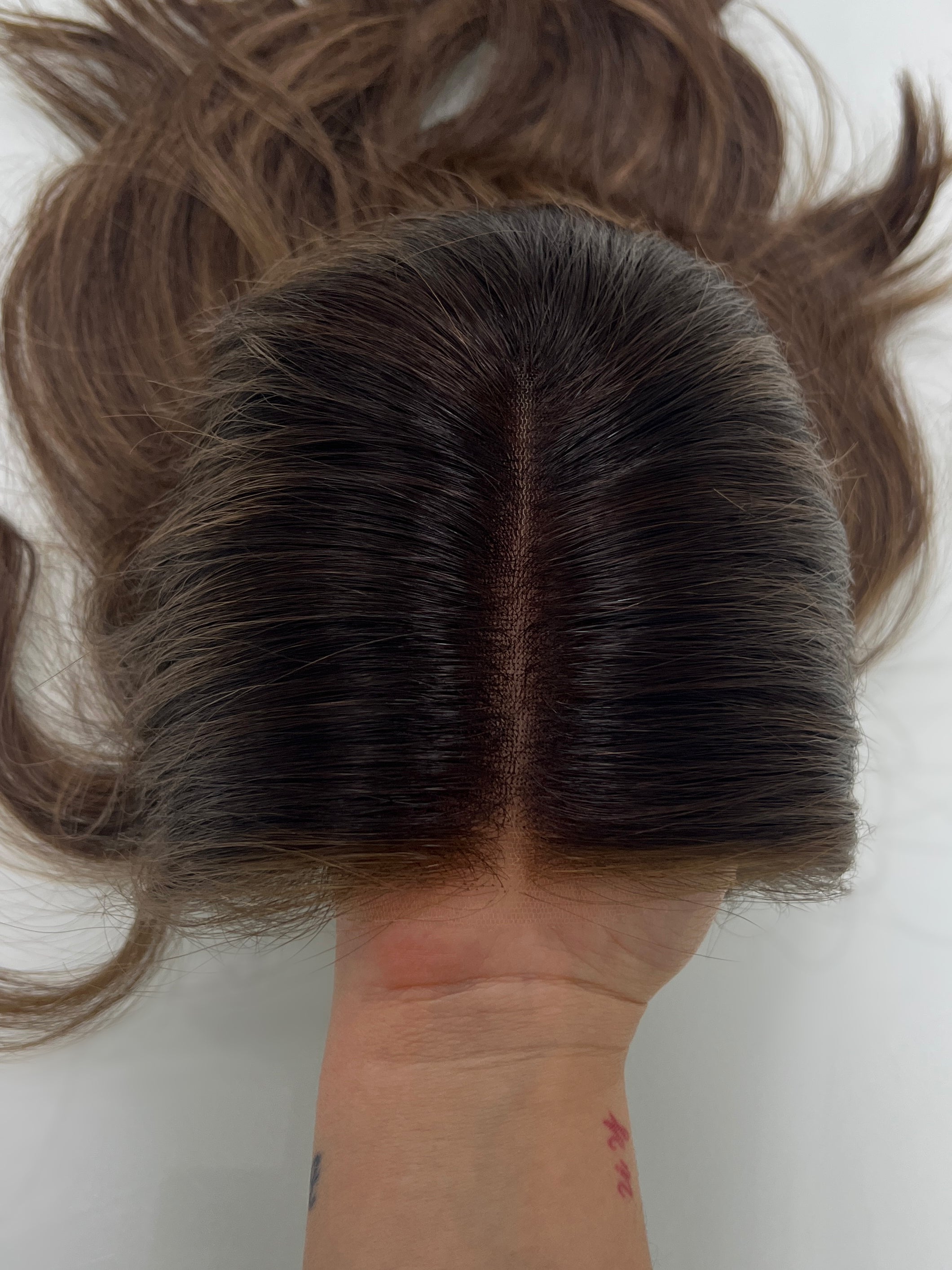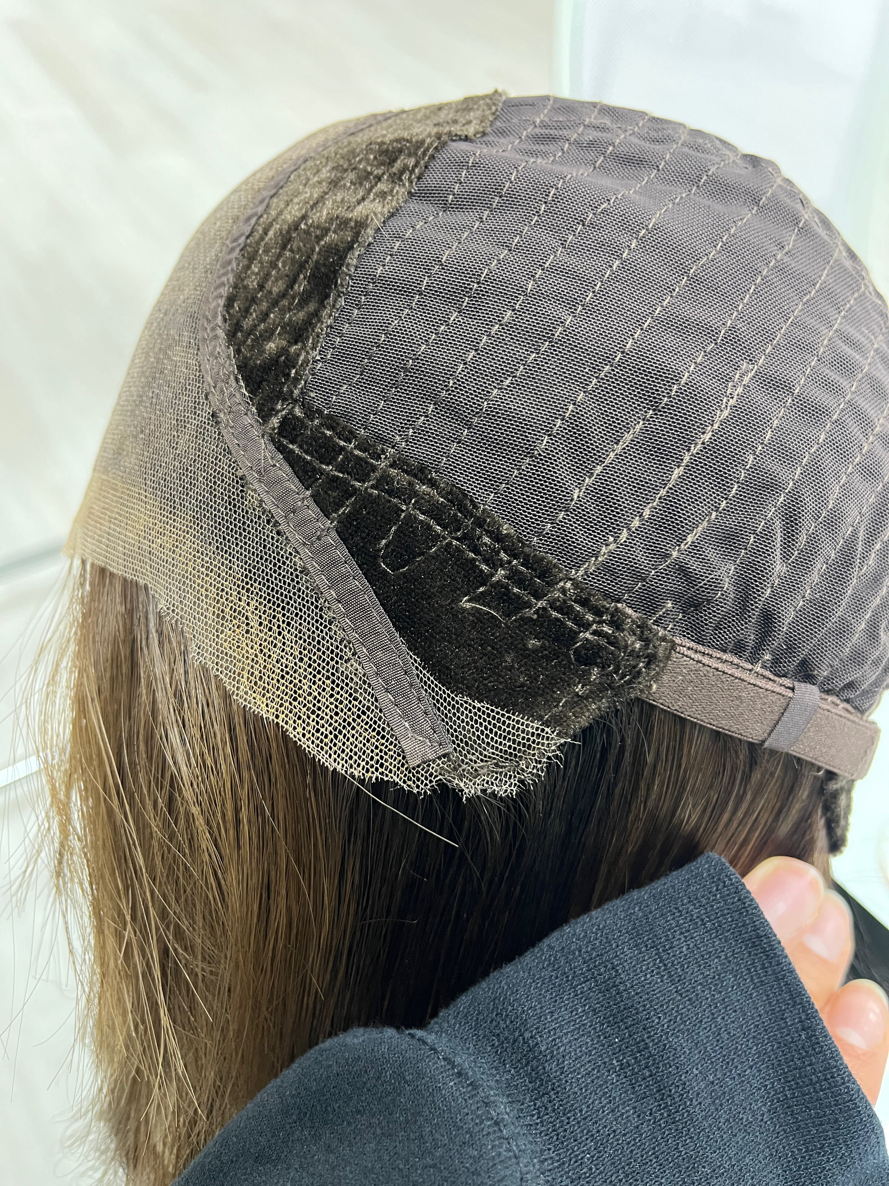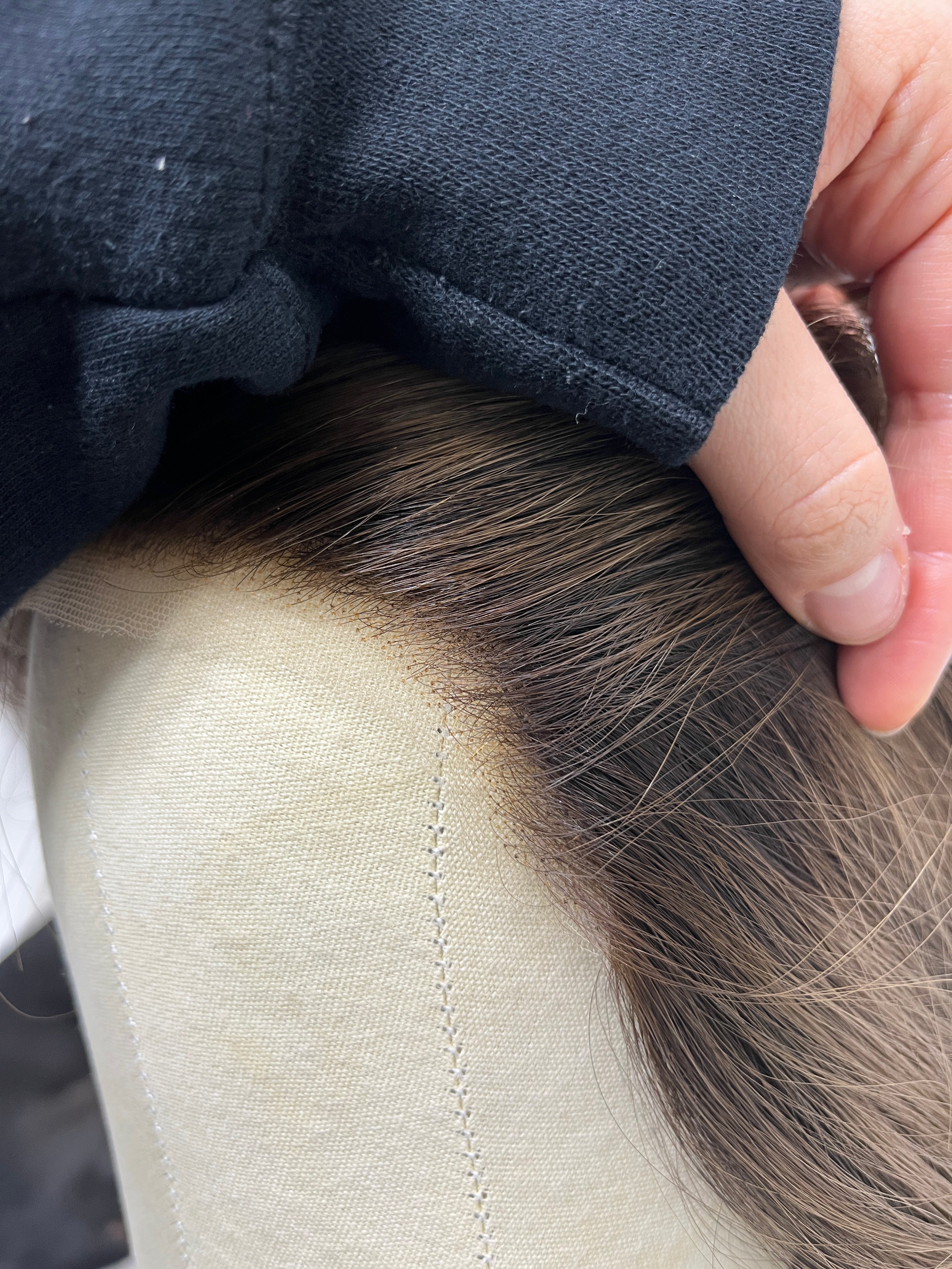 Other: Medium to medium high density (about 125-130%). The lace is cut with some room to further customize in a jagged, uneven method. Knots are naturally light near the front of the hairline due to the color about 1 cm in (there are some knots that are darker than others). The rest of the knots are not bleached. Knots are lightly plucked. There is light staining inside the cap that is not visible and does not affect the integrity. There is some loose thread by one of the ear tabs that does not affect the integrity of the piece.