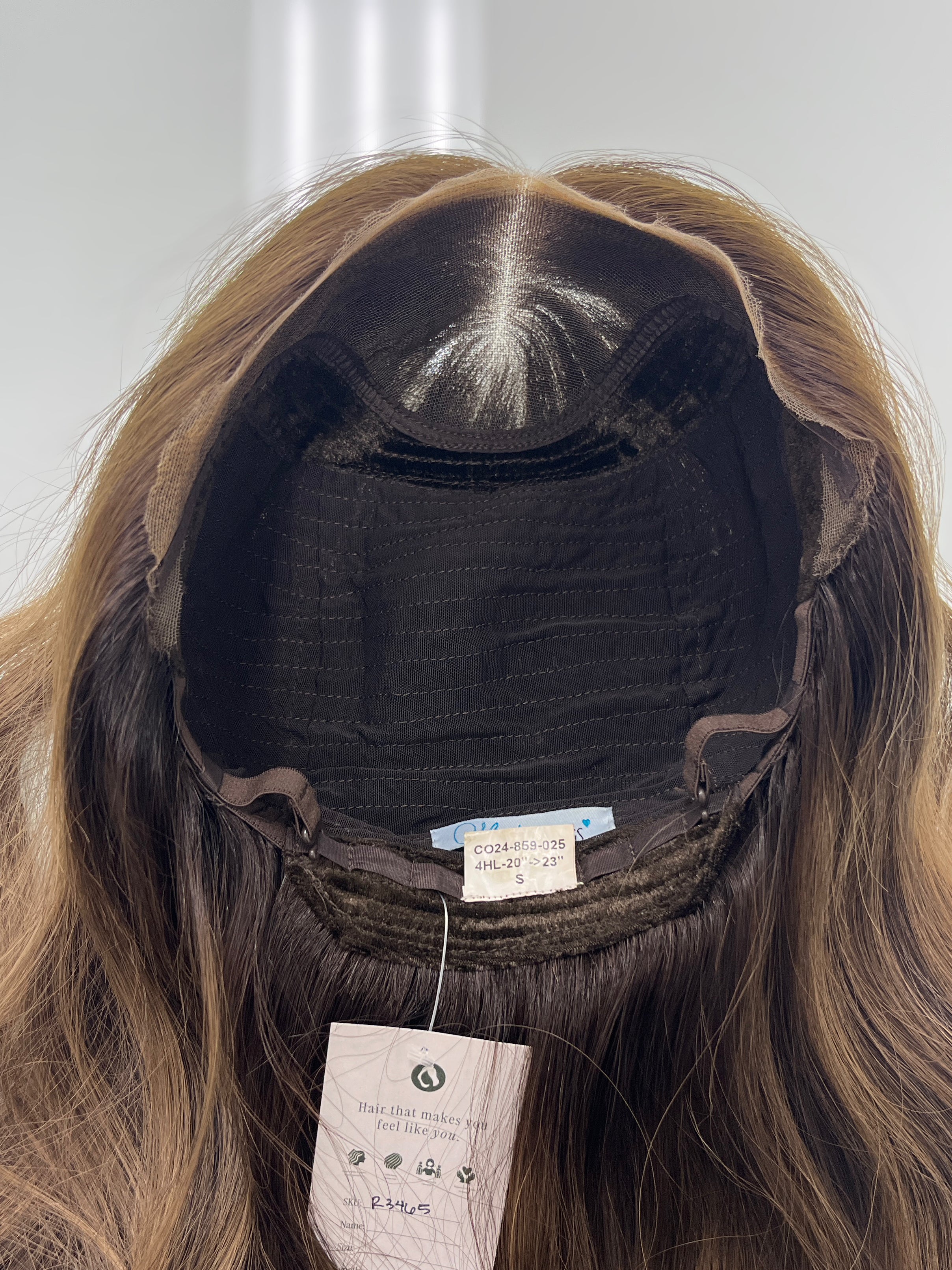 A Madison Hair Collection lace top wig in a beautiful brunette balayage color! This wig has Mongolian hair that is known for its thickness and smooth texture - it is a good balance between added volume and manageability. Easy to style and very soft/silky. The velvet lining inside the cap makes this piece feel snug and secure - an added layer of comfort/security so you do not have to wear any clips, combs or glue. Overall, in like new condition.