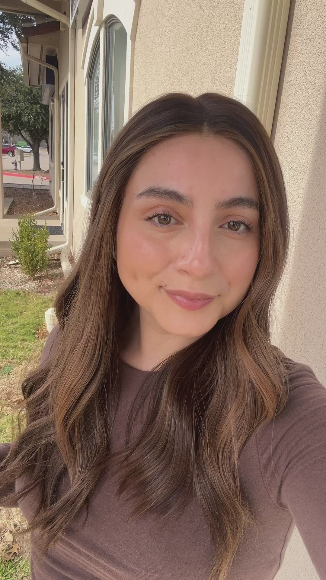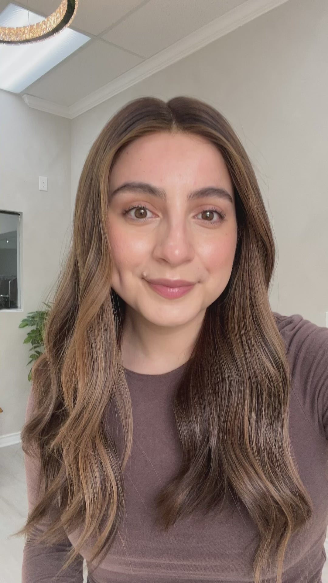 Color: Dark medium brown root into a light neutral brown base with a light caramel brown balayage and subtle ashy undertones