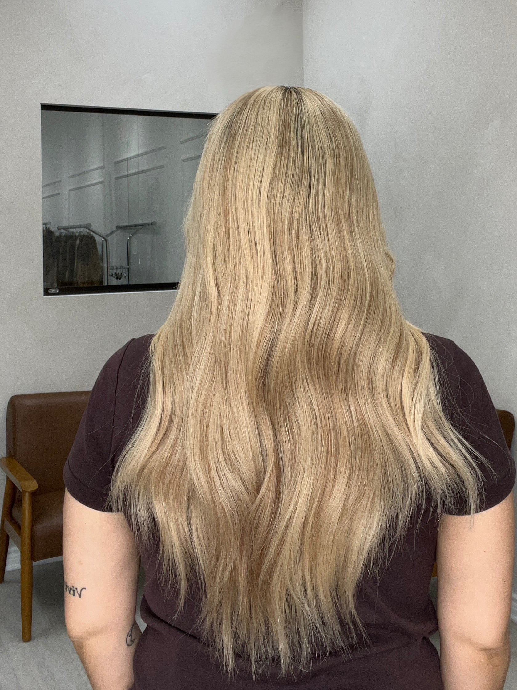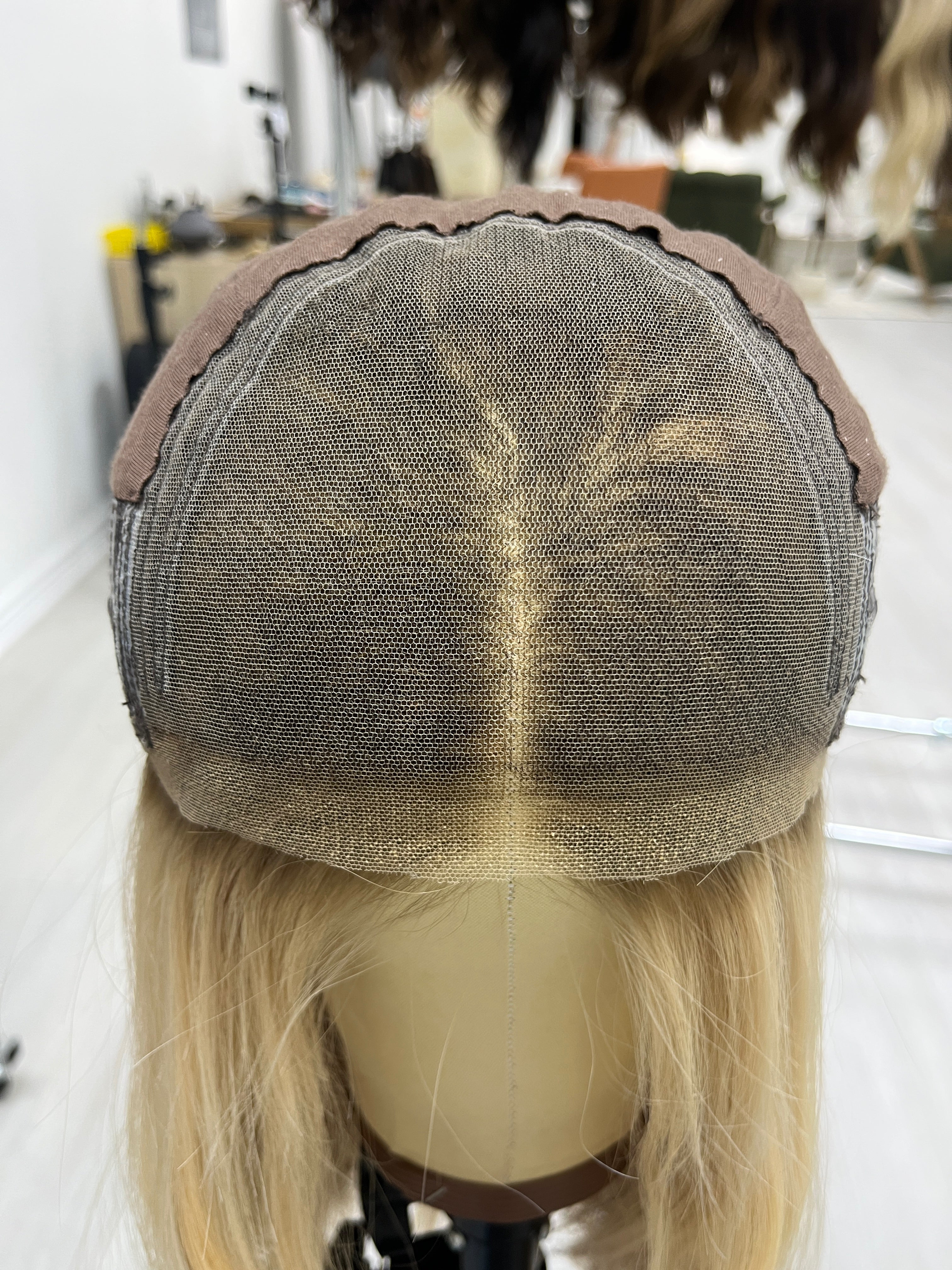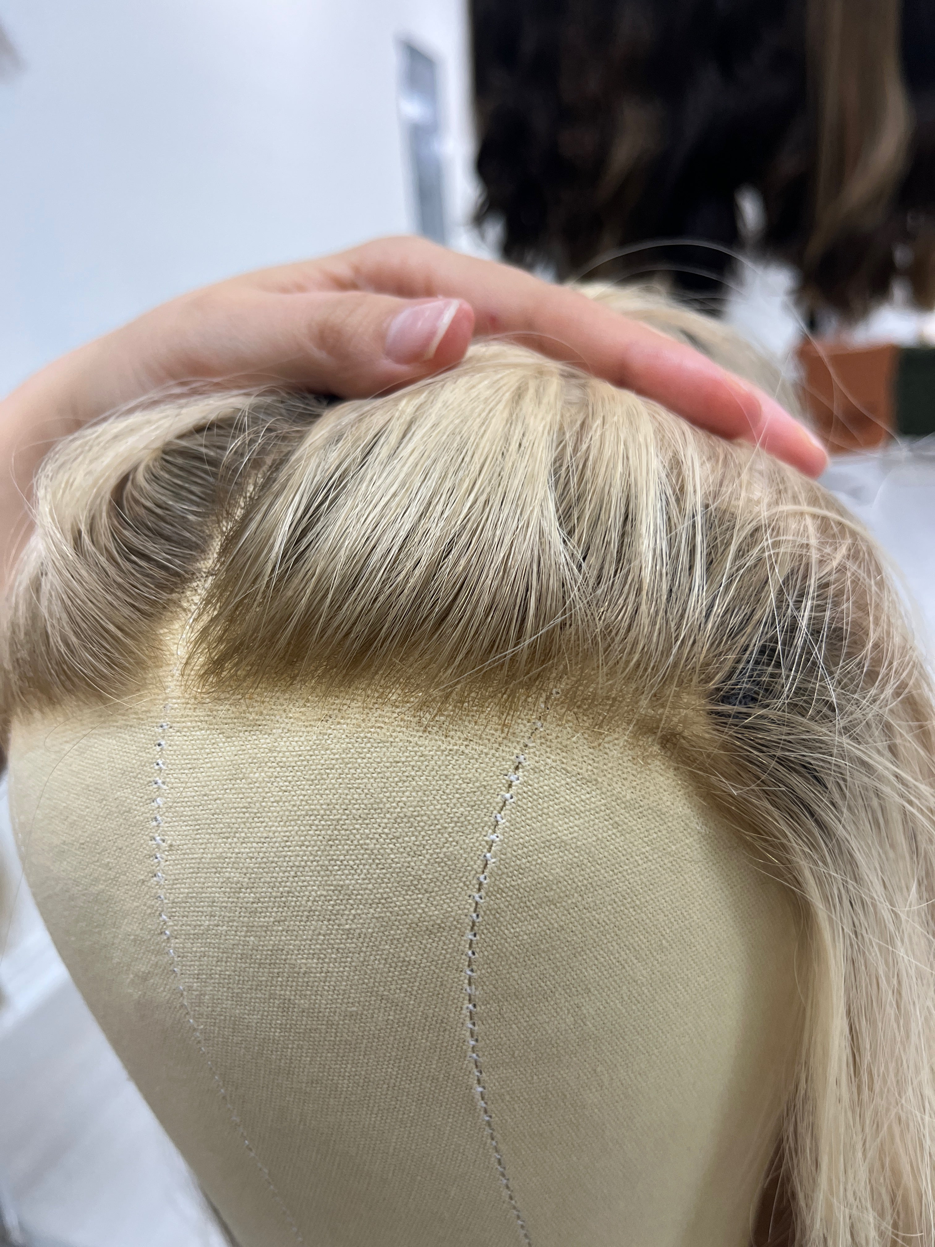 Considerations: There are some color irregularities on the root blend as the first inch or so is a beige blonde while the rest of the root is a shadow root. Overall, in good condition.