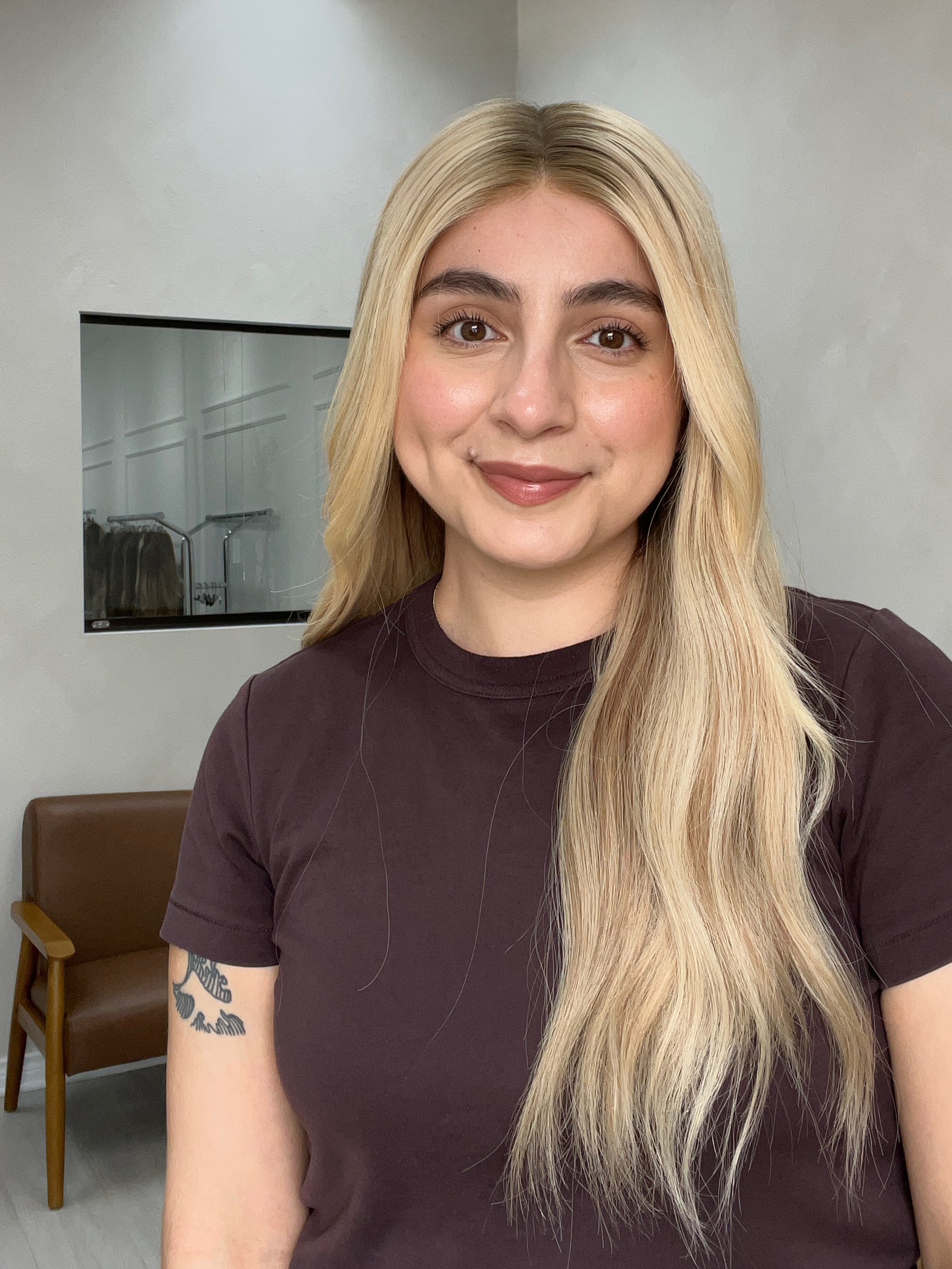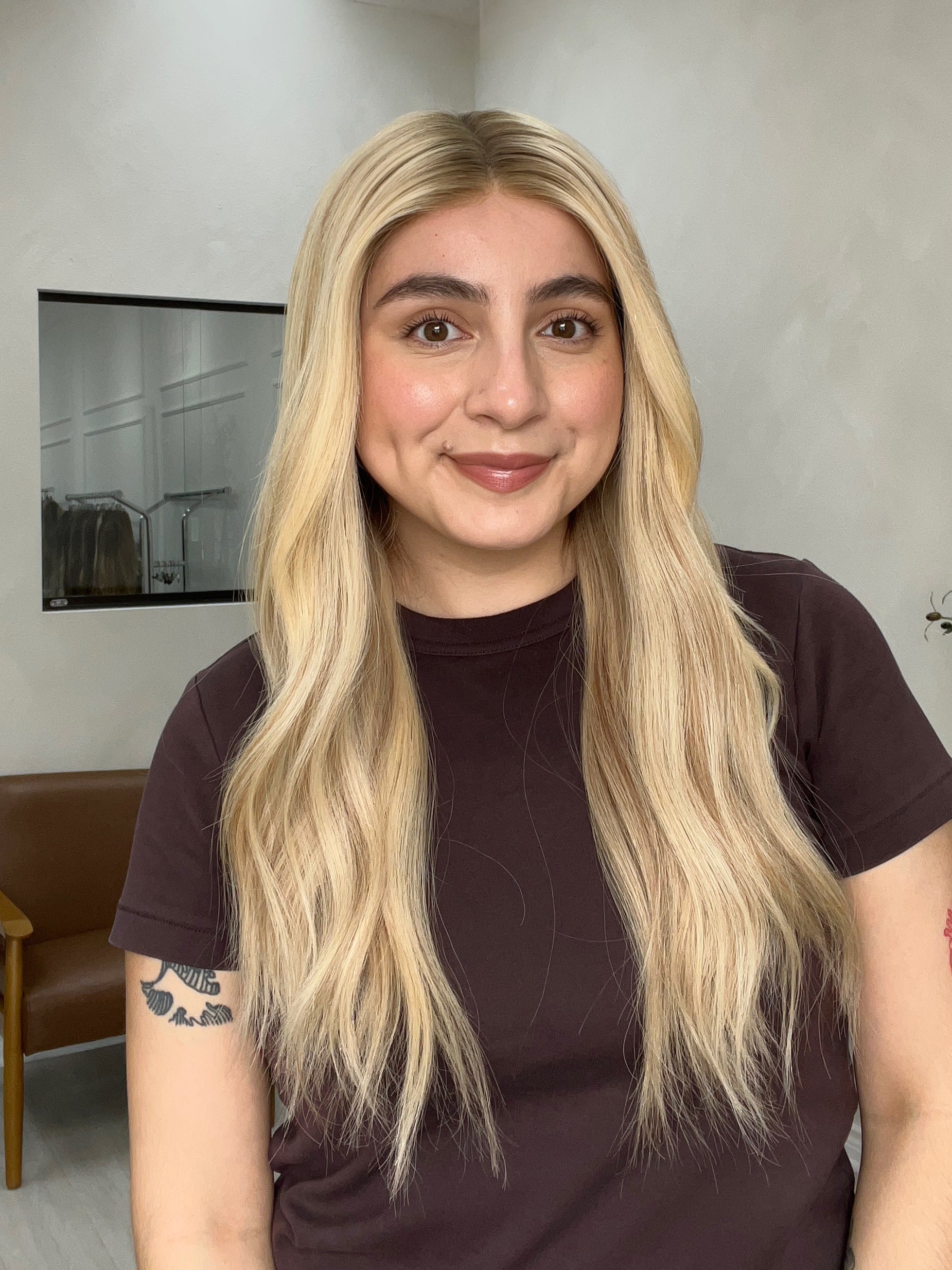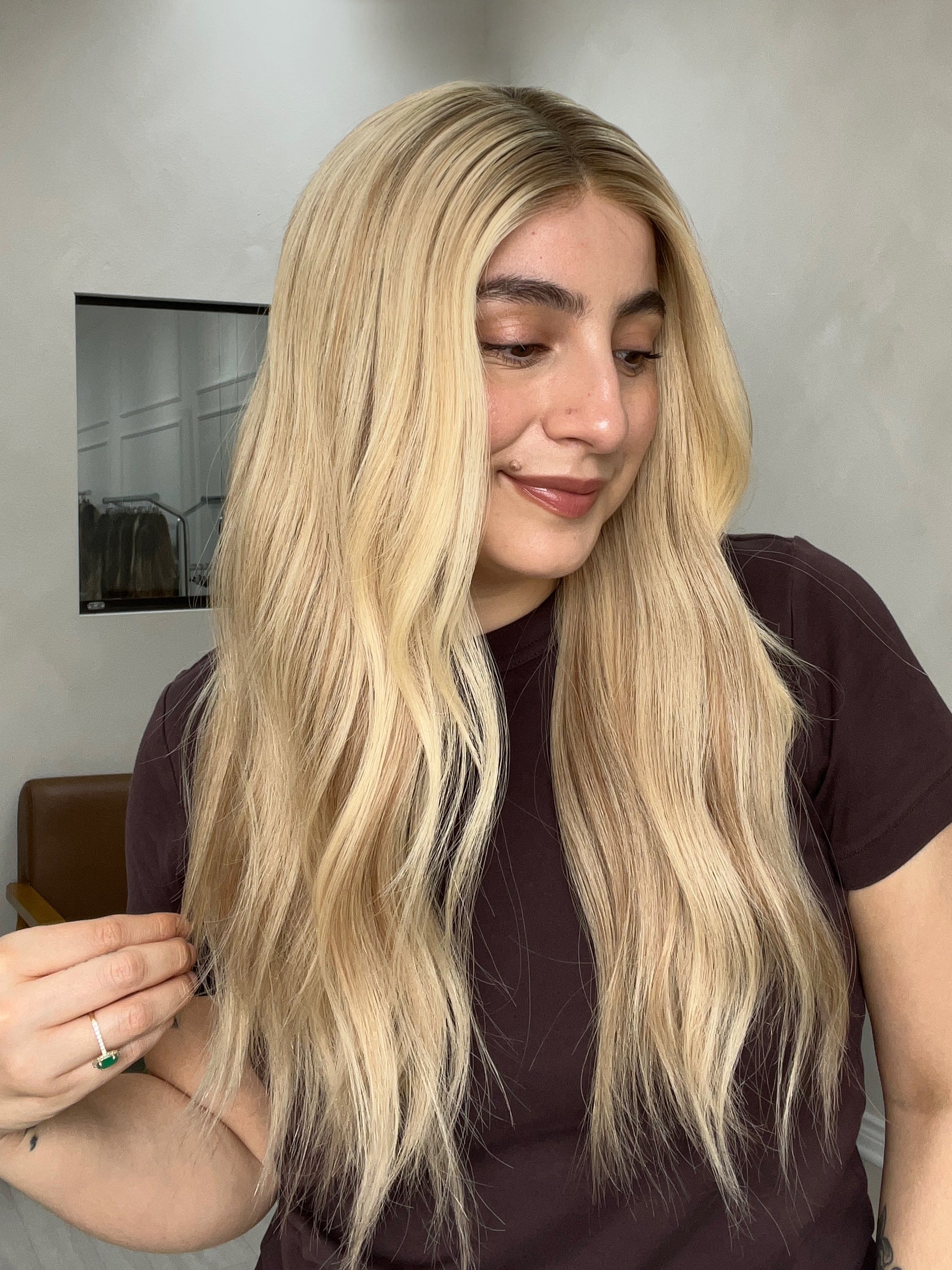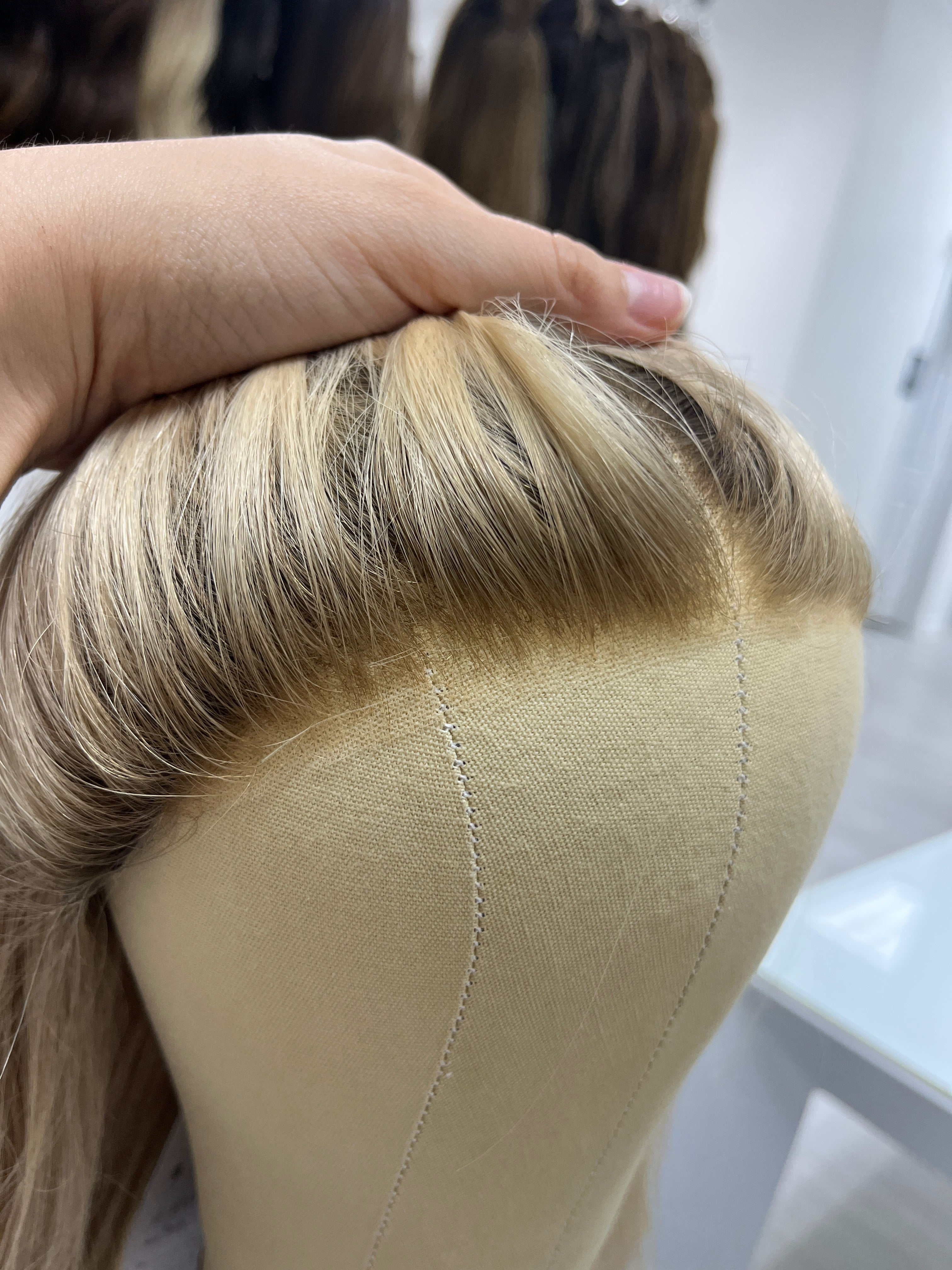 Considerations: There are some color irregularities on the root blend as the first inch or so is a beige blonde while the rest of the root is a shadow root. Overall, in good condition.