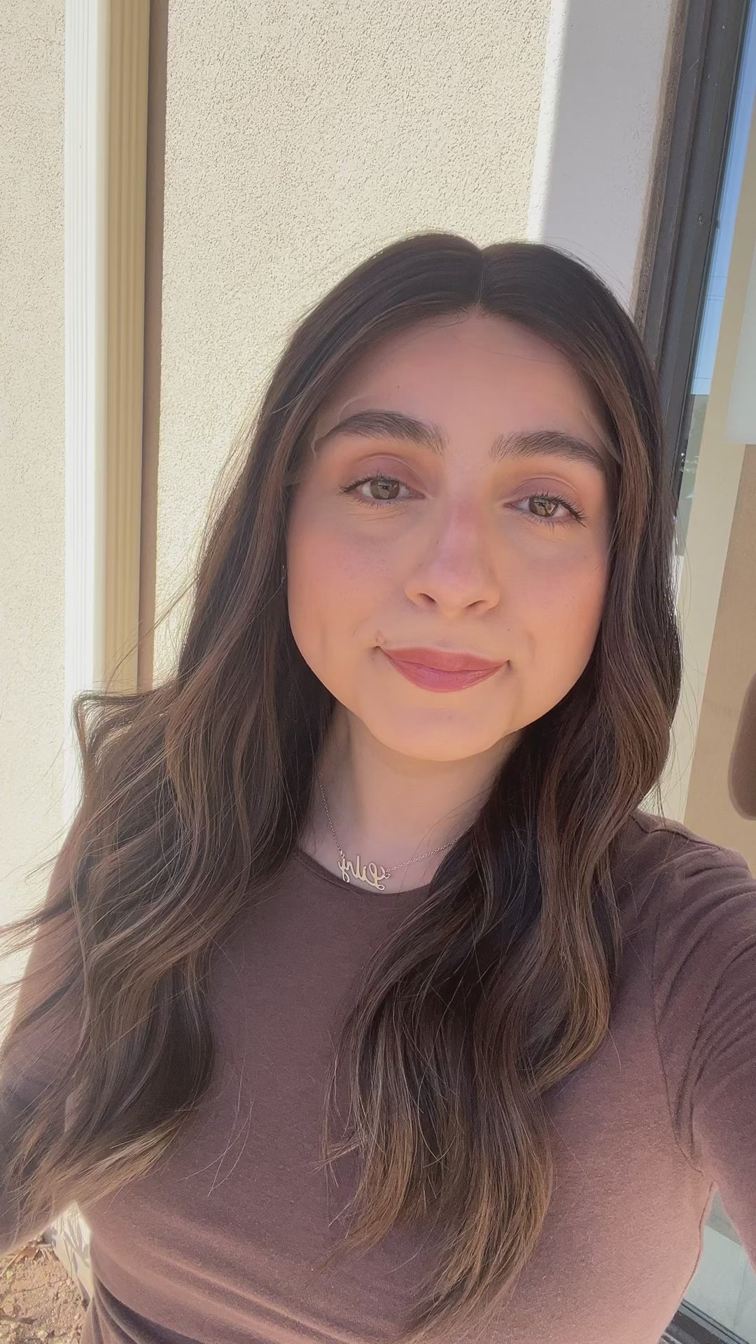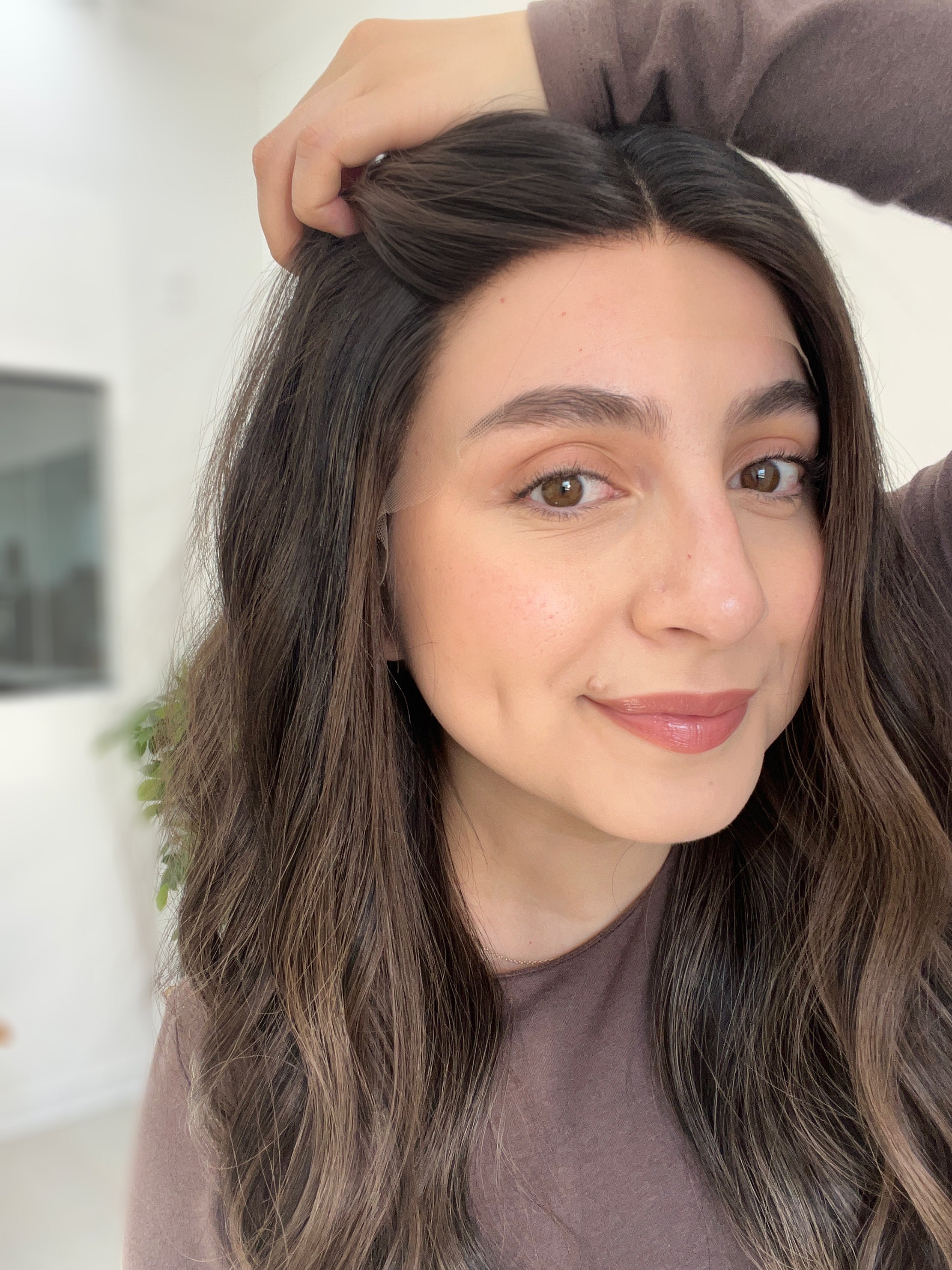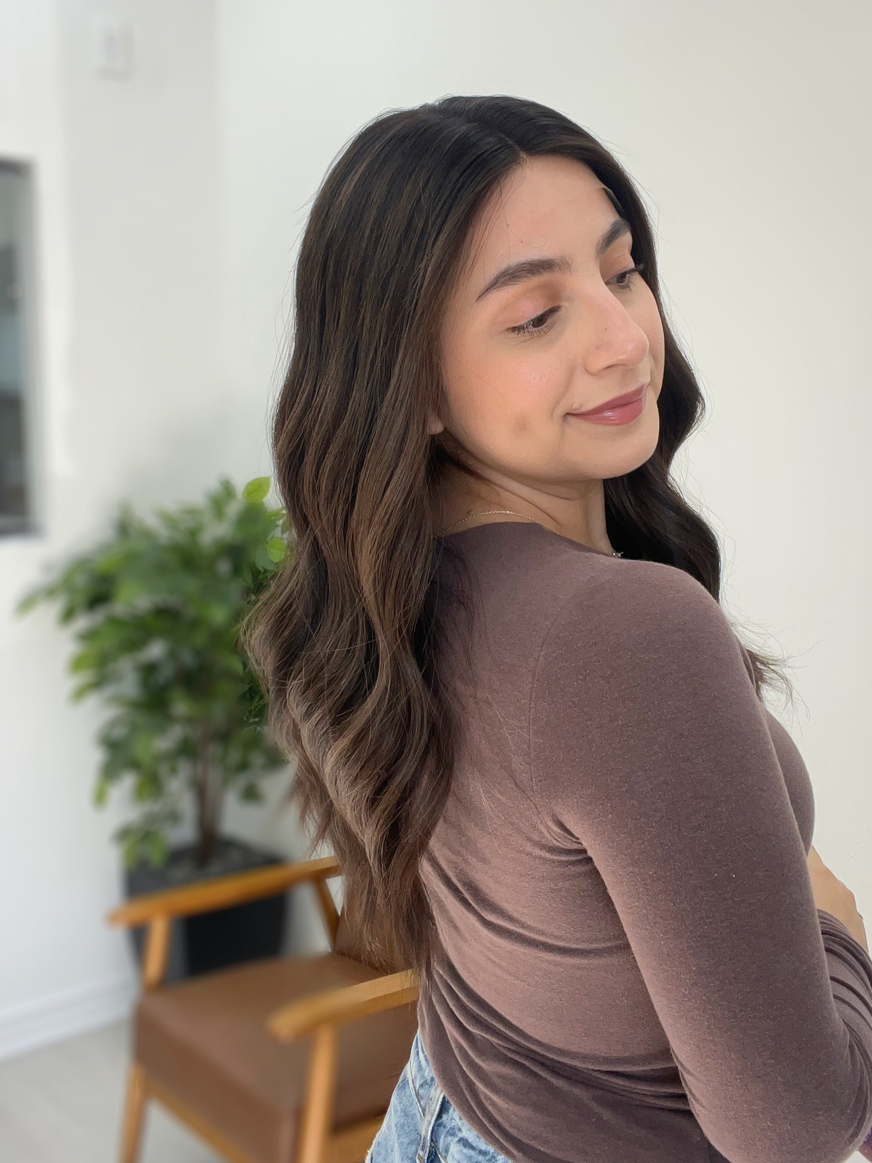 Color: Short dark root into a neutral dark brown with lighter ashy to neutral mushroom brown balayage and face framing