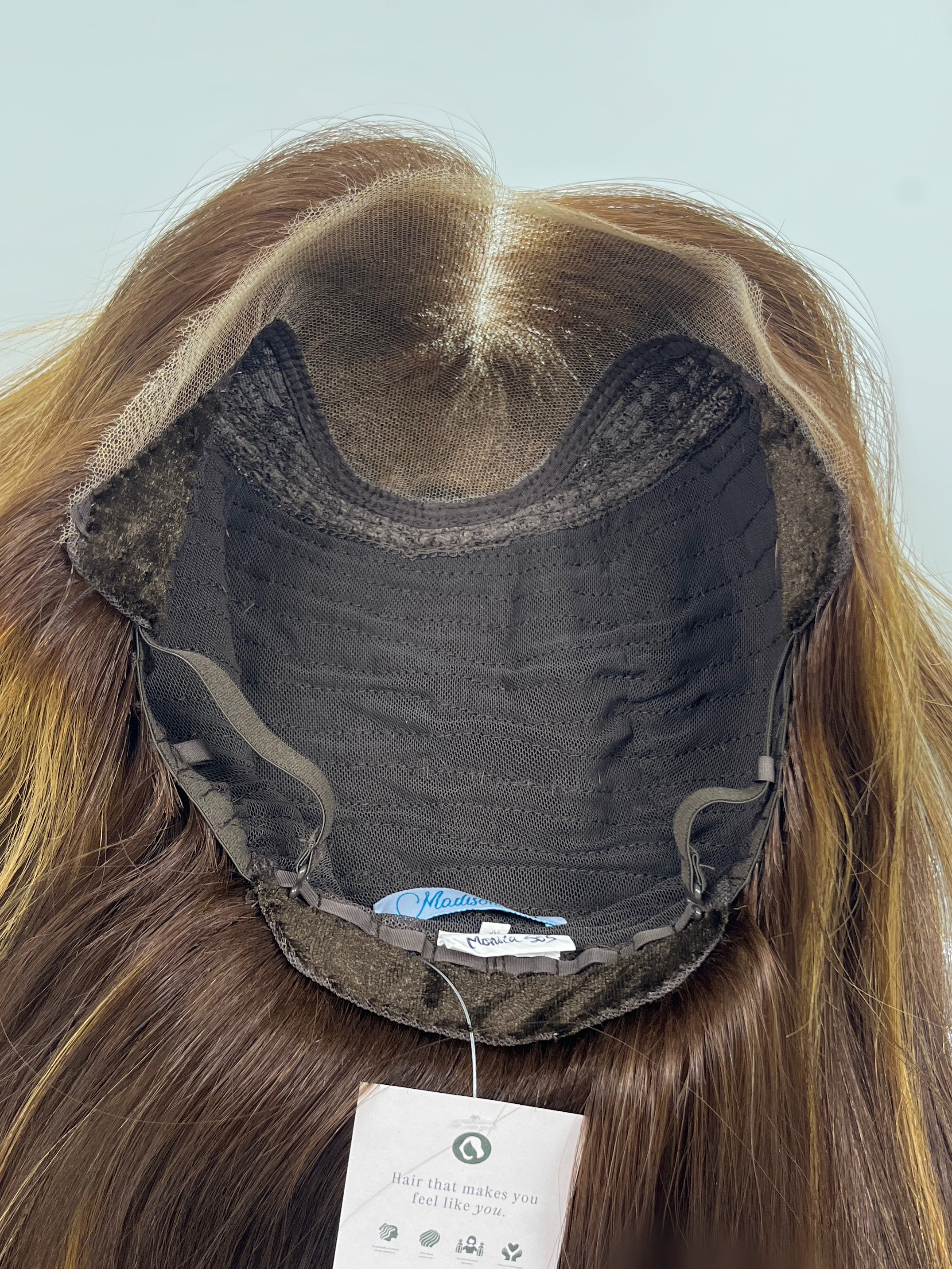 This is a super dimensional warm toned lace top wig from Madison Hair Collection. The cap features velvet lining for an extra layer of comfort and security that makes it feel a bit more snug - a great option for those wanting to wear without any clips, combs or adhesive. The light layers provide movement throughout that makes this piece feel more natural and lightweight overall.