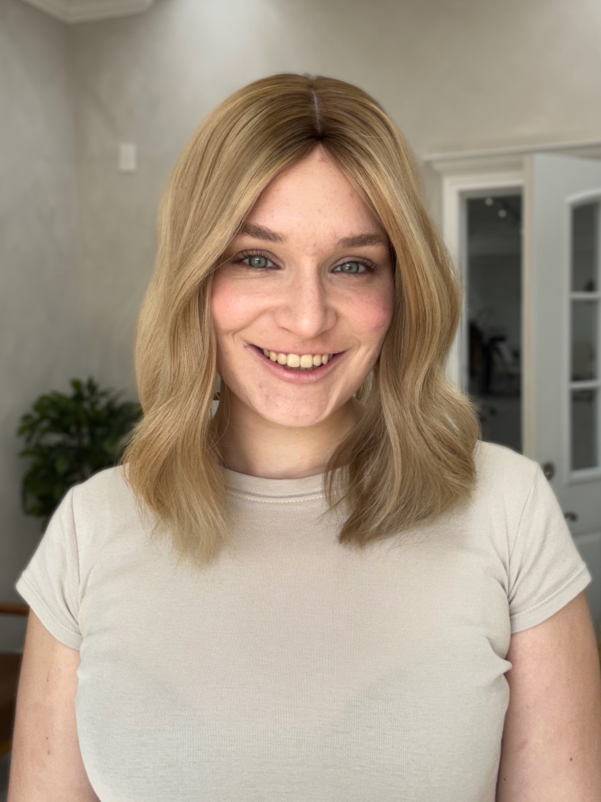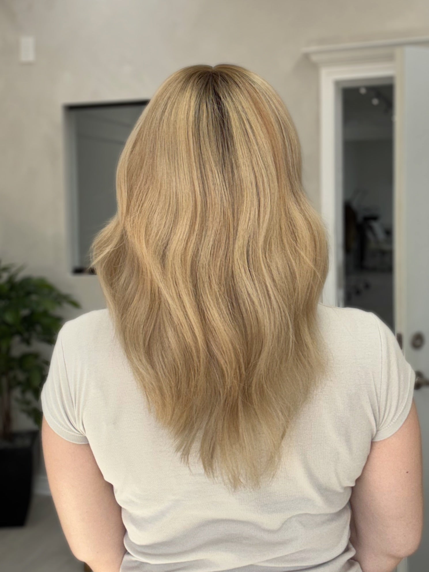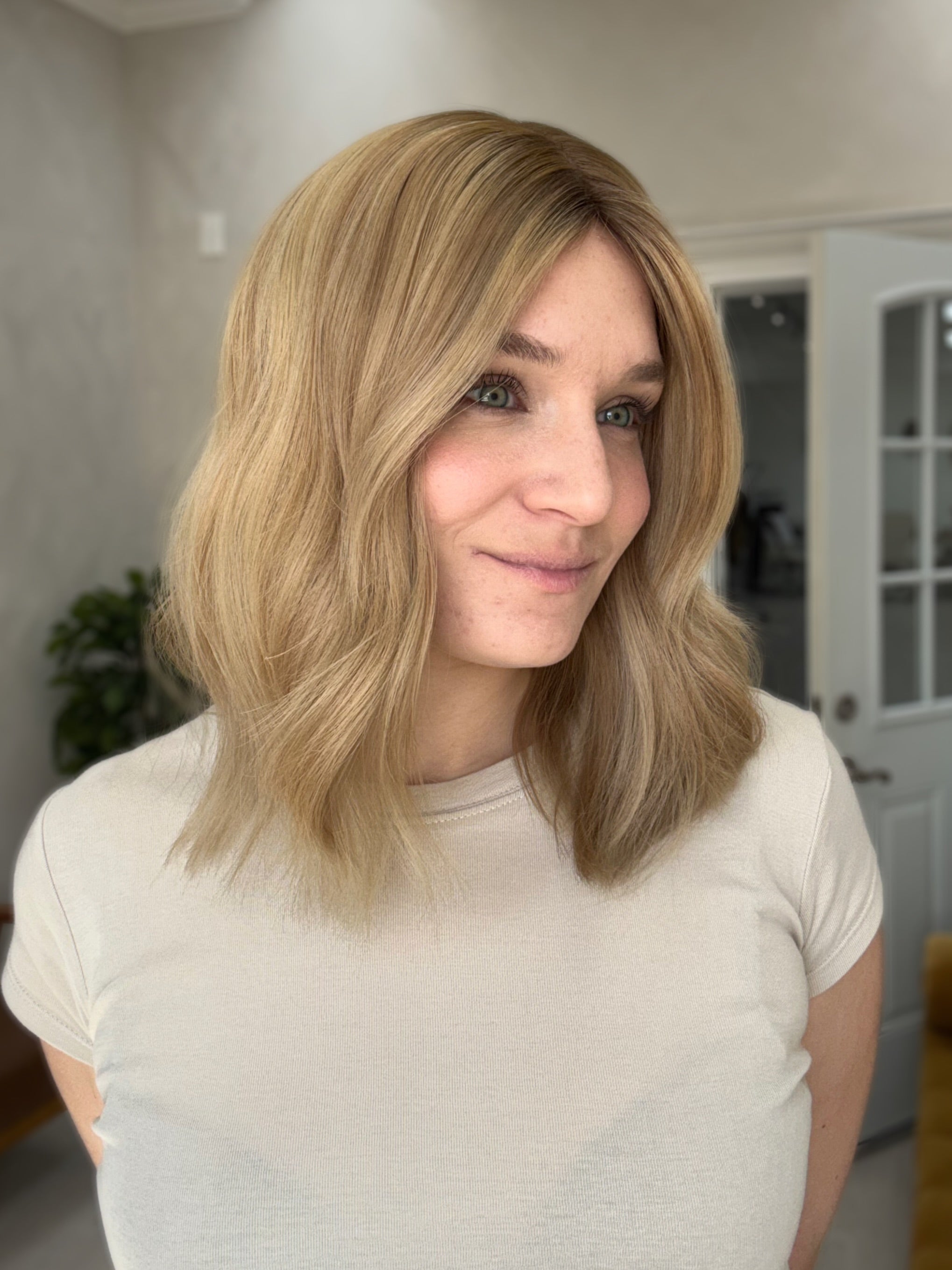 Color: Dimensional light buttery blonde blend with medium blonde and darker neutral blonde tones with a slightly darker brown shadow root