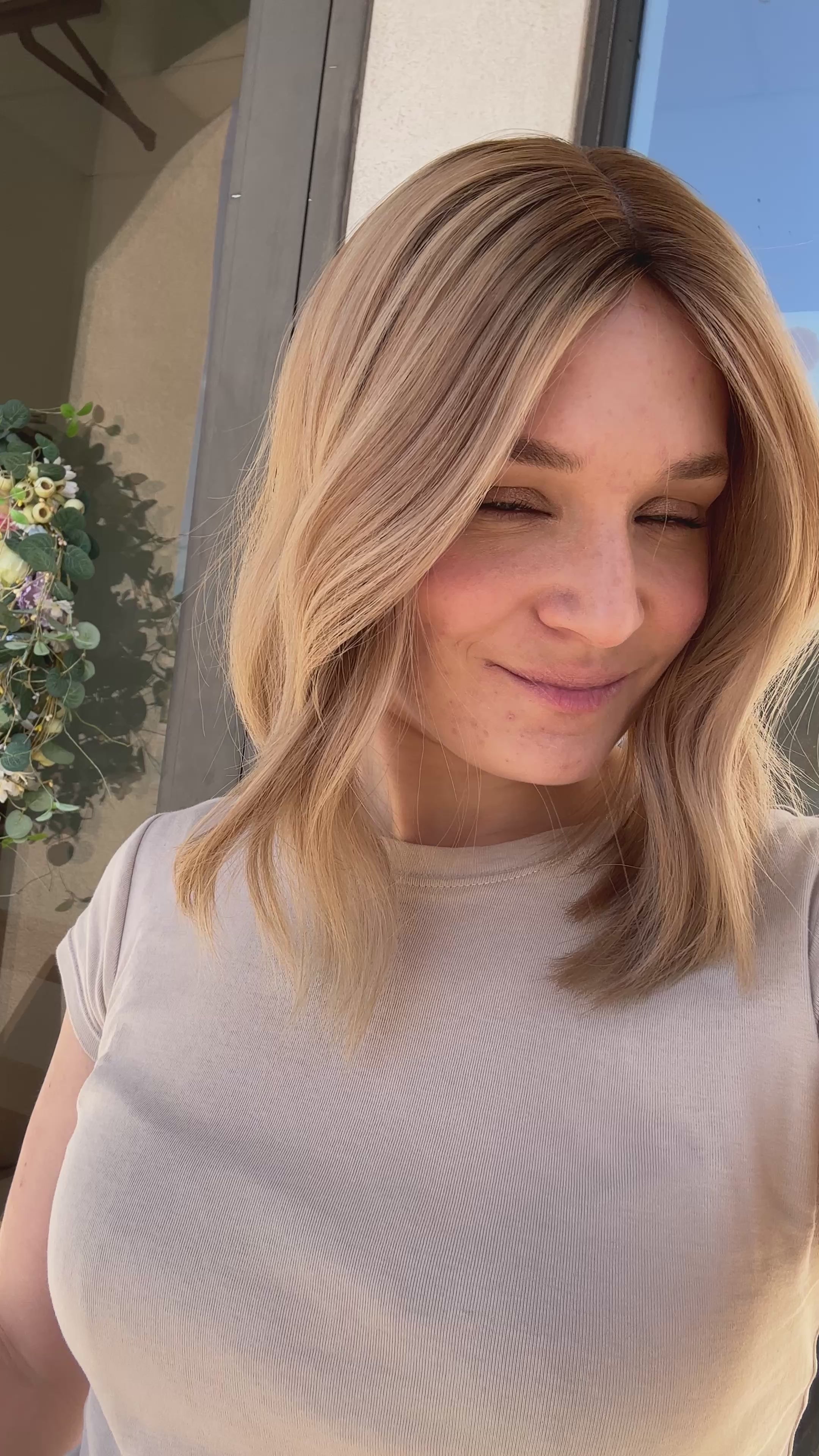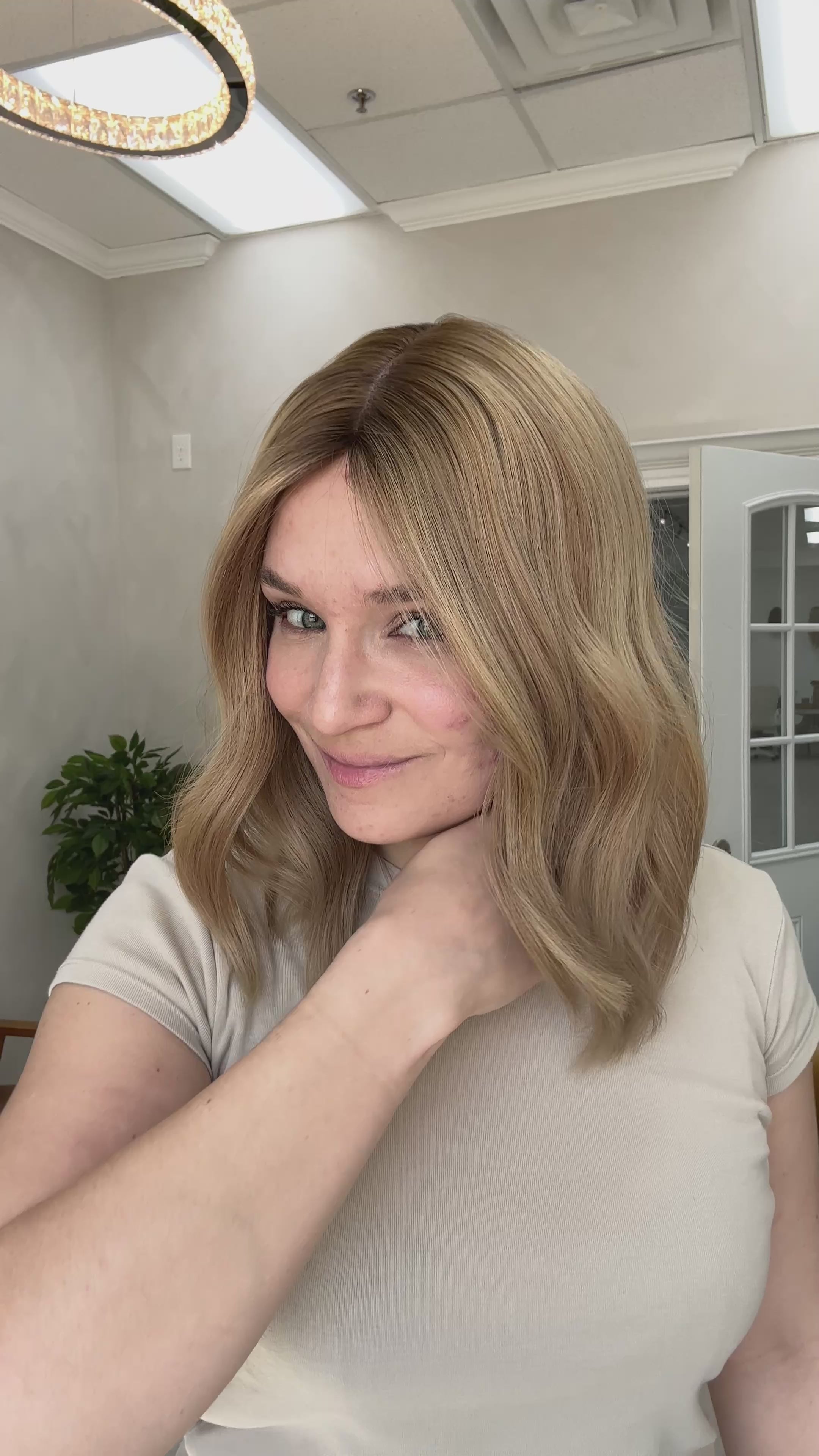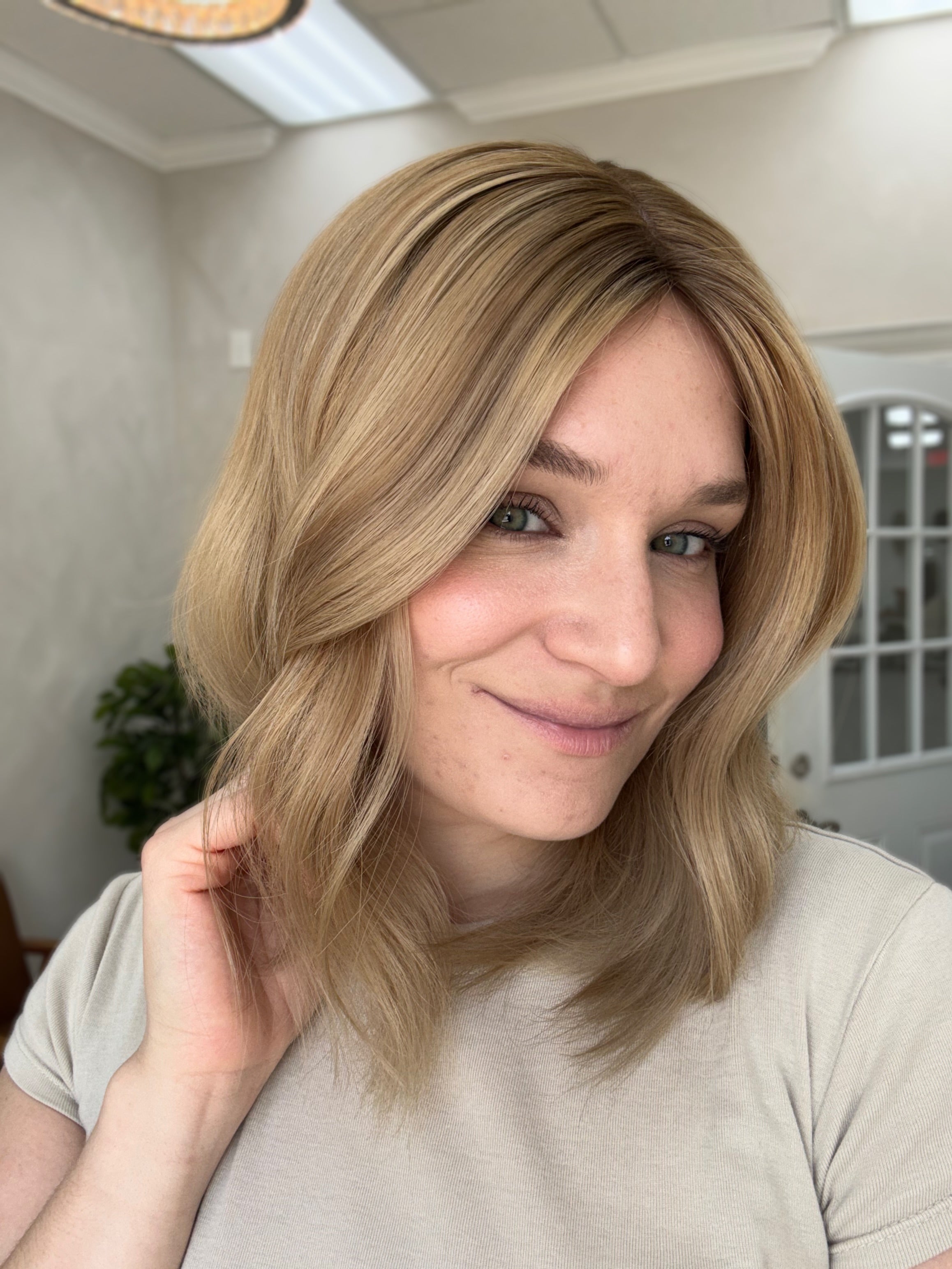 Color: Dimensional light buttery blonde blend with medium blonde and darker neutral blonde tones with a slightly darker brown shadow root