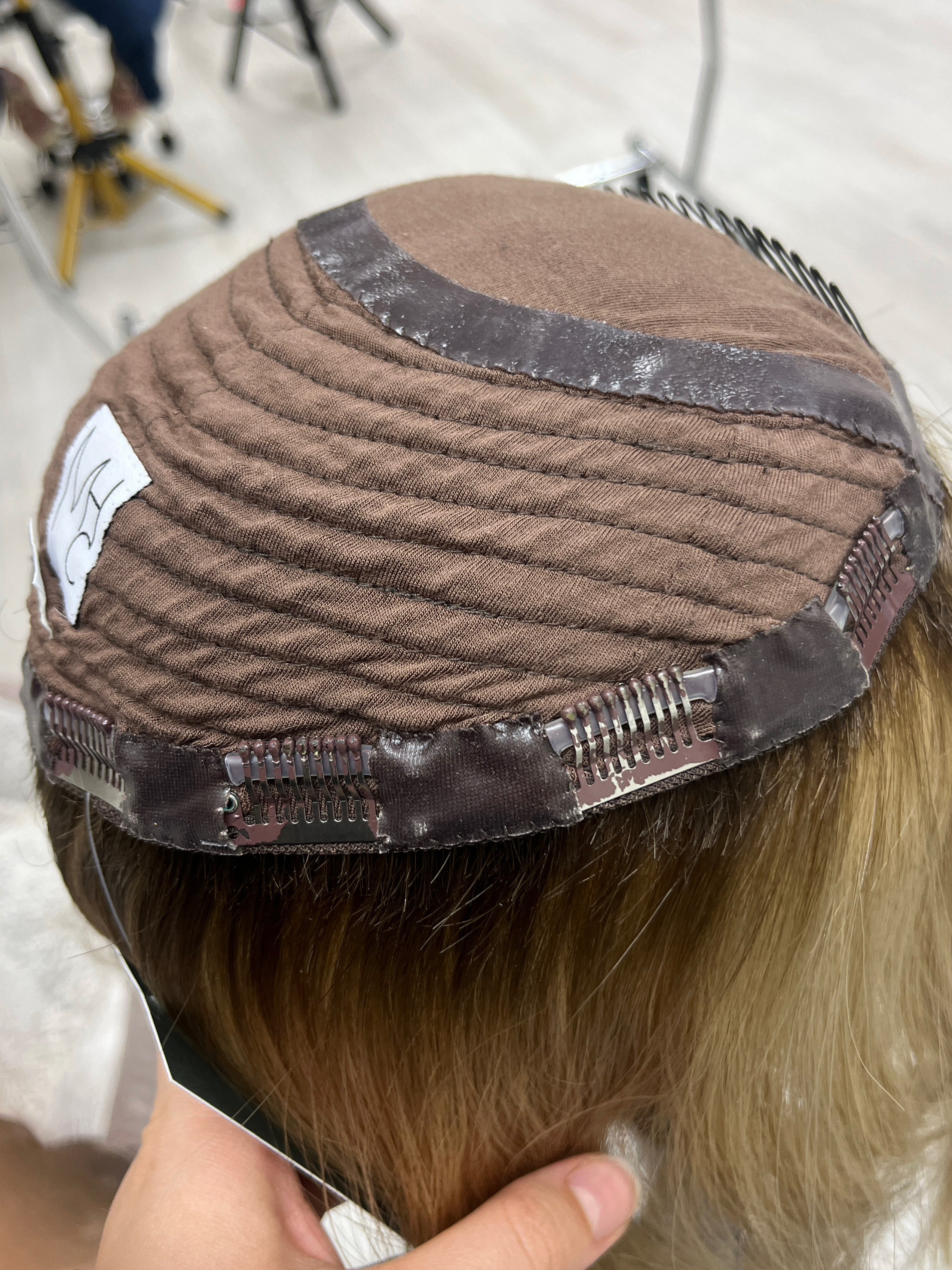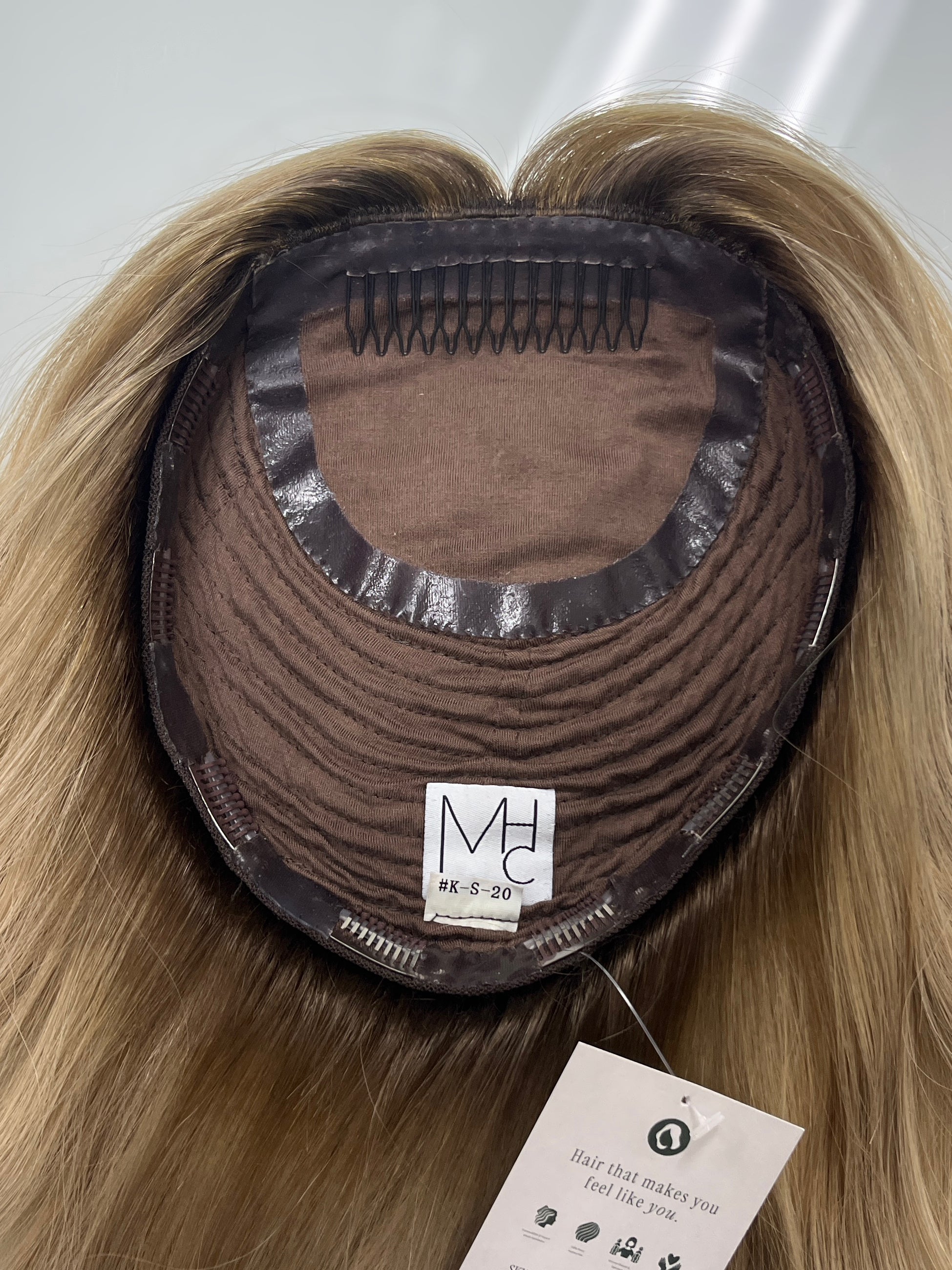 This is a beautiful buttery blonde dimensional silk top topper from Madison Wigs! The silicone lining and t-shirt like fabric makes this piece have a super comfortable fit with extra security. A very lightweight density that is a great option for someone wanting a hair thinning or hair loss solution that provides coverage and volume.