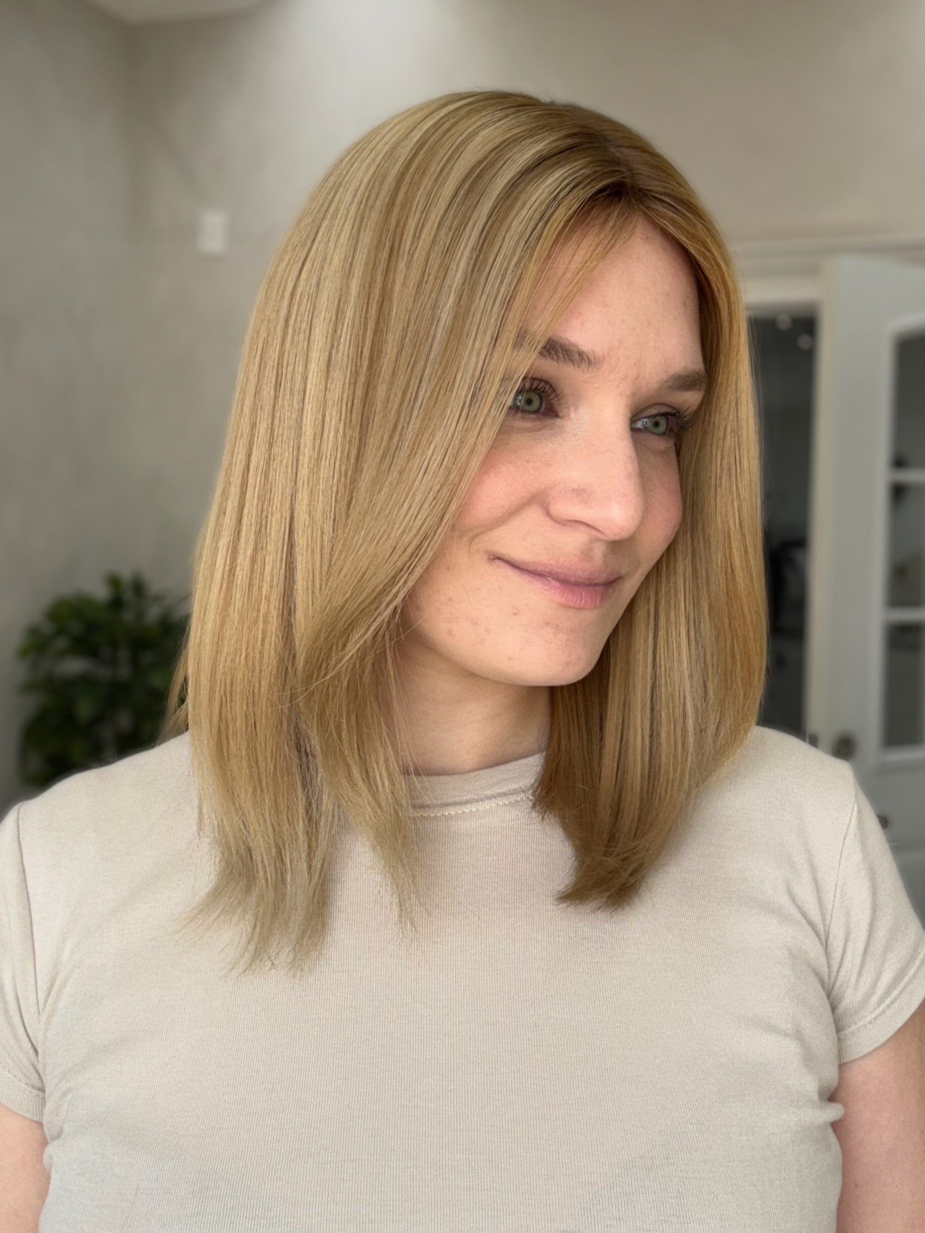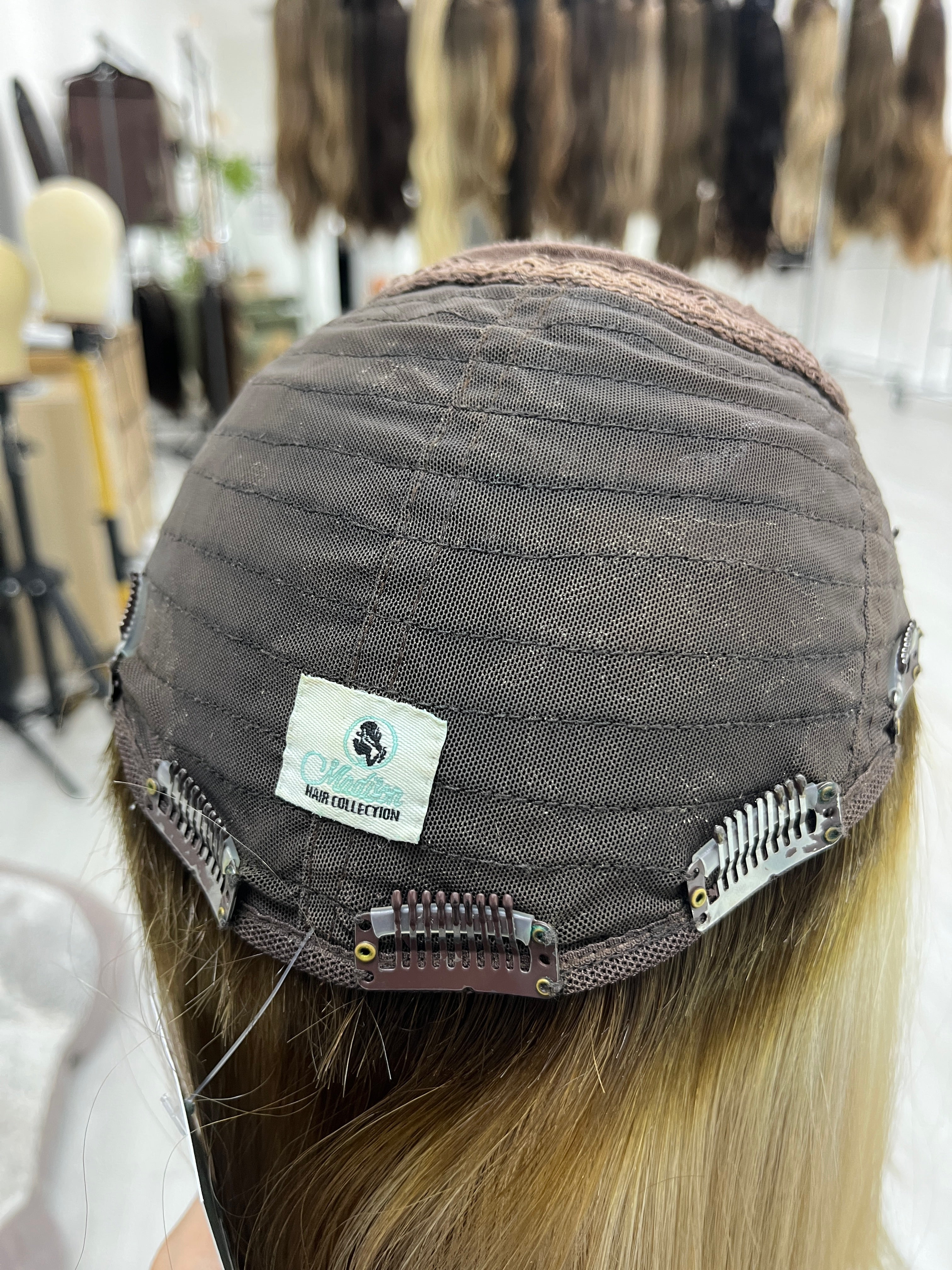 This golden blonde silk top topper from Madison Wigs is a great option for someone looking for lots of dimension and a range of blonde tones. It also features a light density with Mongolian hair texture that is easy to style and manage. With a little extra love and customizations, this piece can be personalized to you and still have lots of life left.