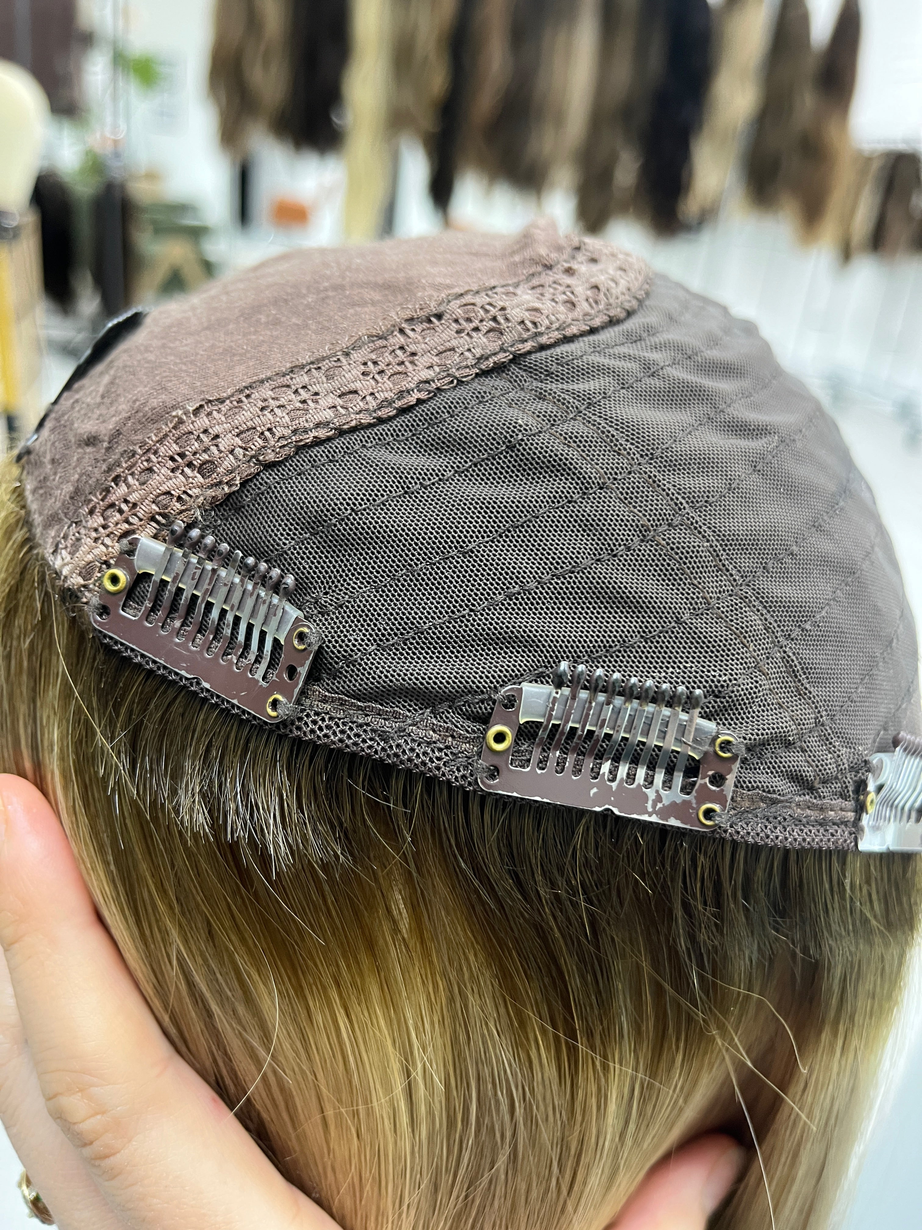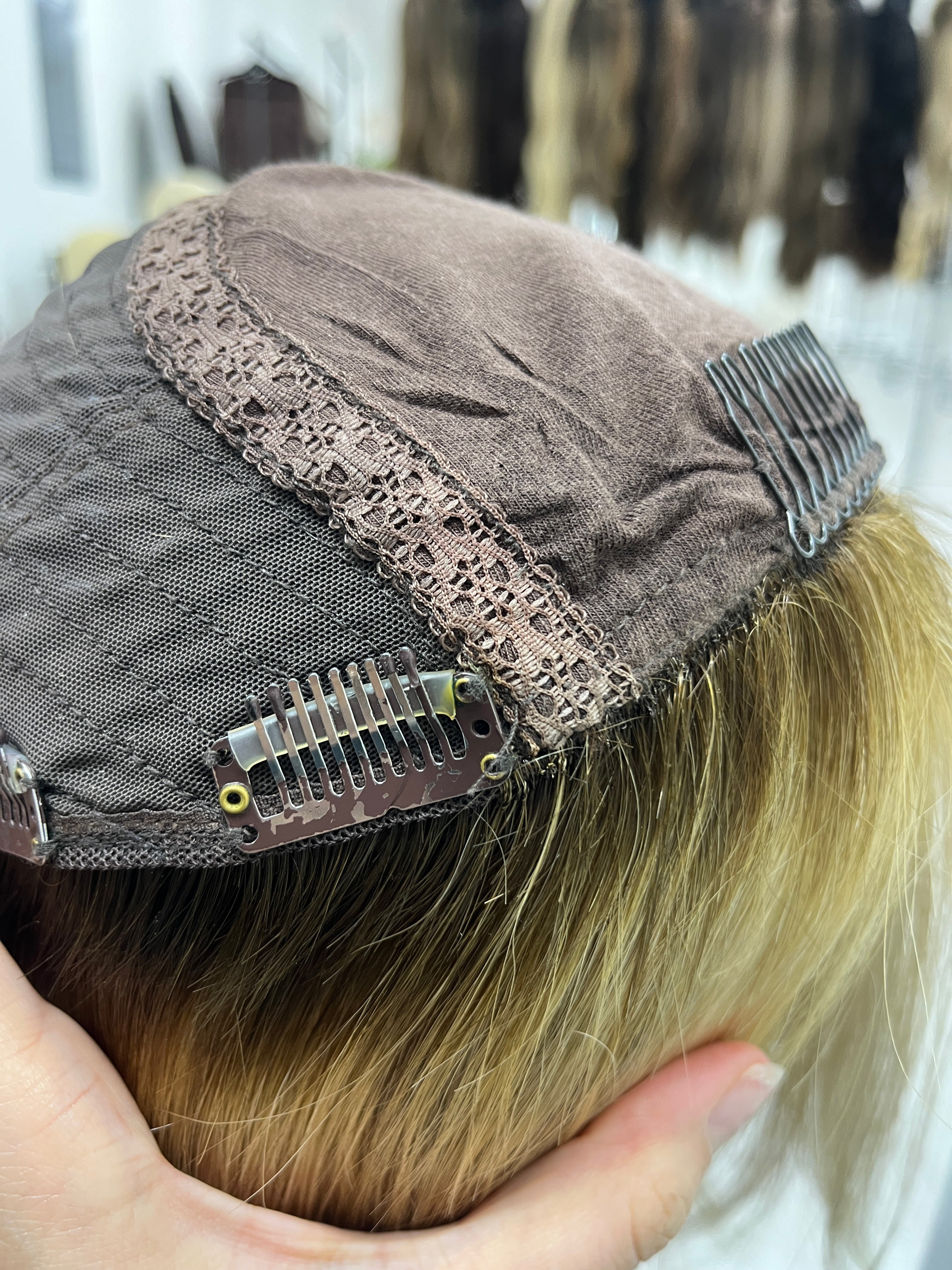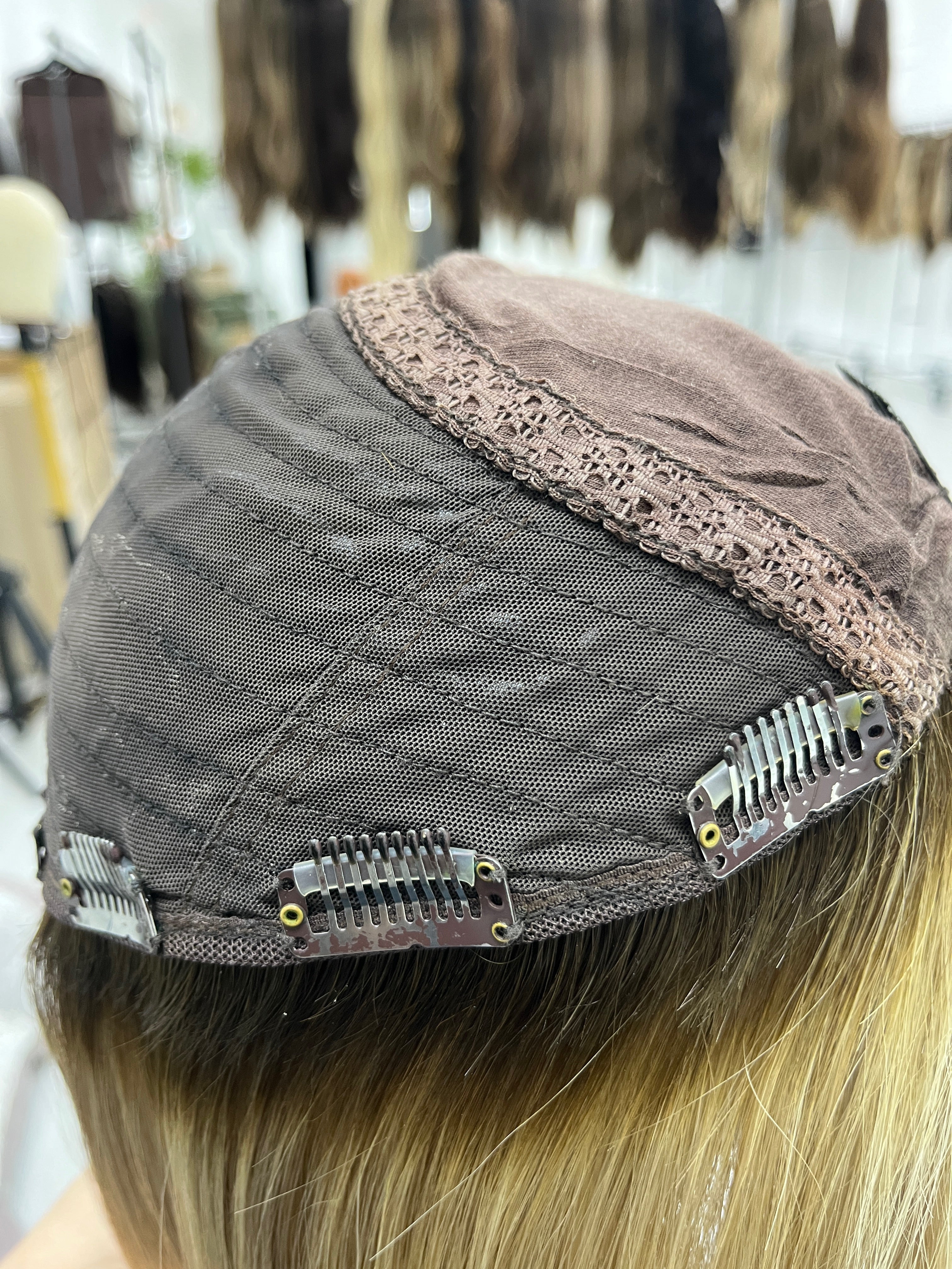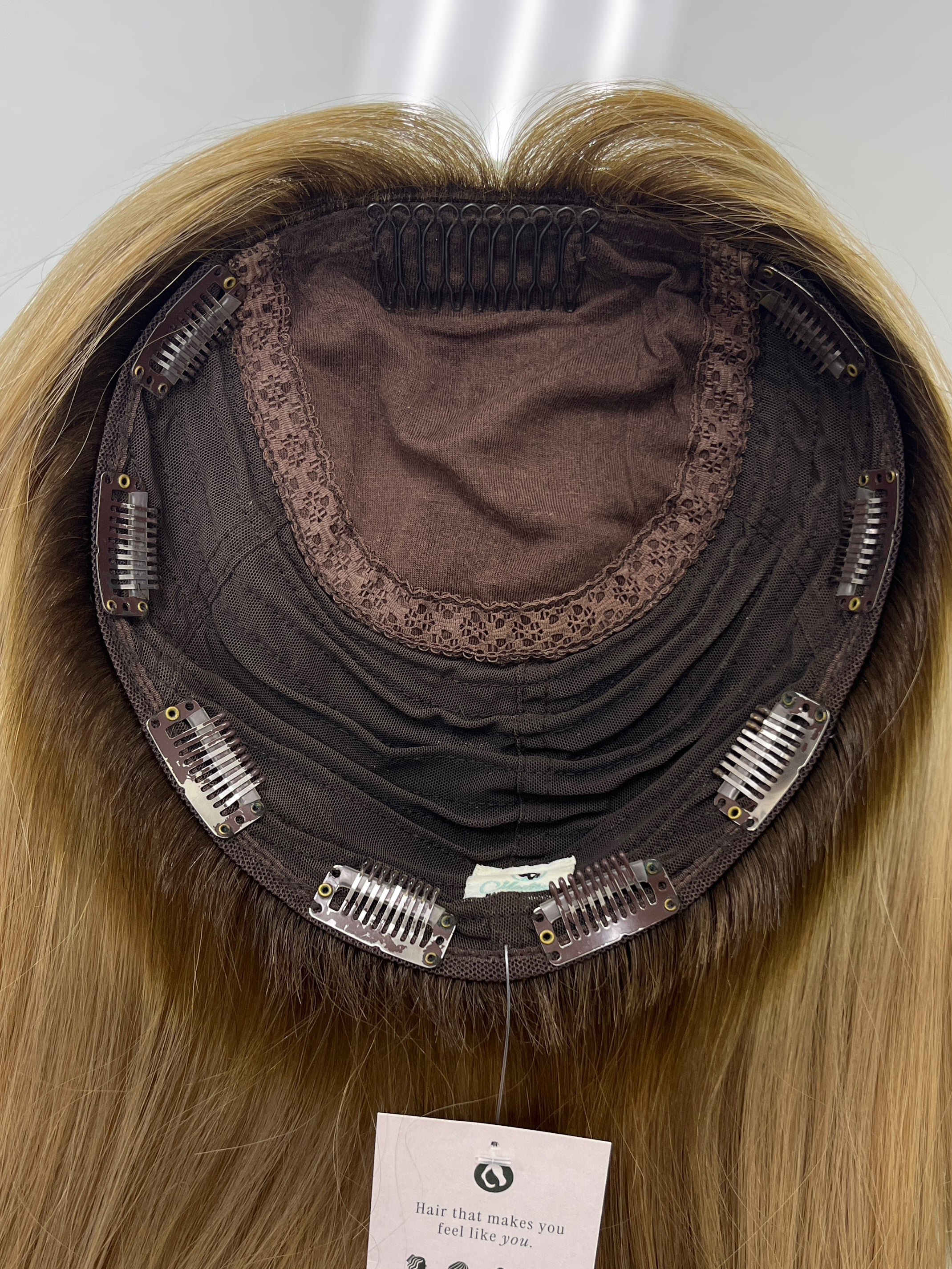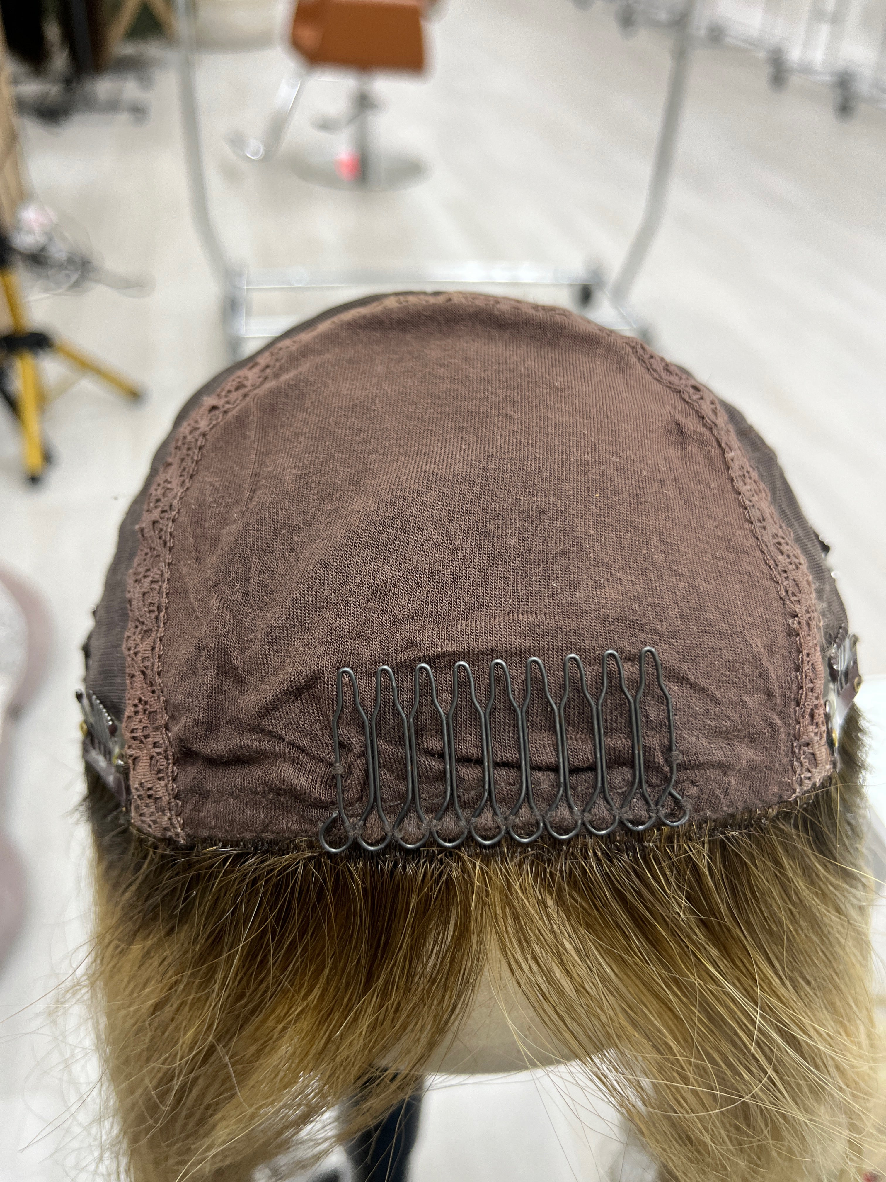 Other: Medium light density (about 120%). Wear and tear on the clips and front comb. One of the clips has teeth that is slightly lifted. Loose thread by one clip that does not affect the integrity of the piece. The fabric by the front comb has stretched. Light discoloration on the silk top that is not visible on the outside. There is staining inside the cap that is not visible on the outside. Originally a 9 x 9 cap size - the cap has stretched over time so it feels and measures as a 9 x 10.