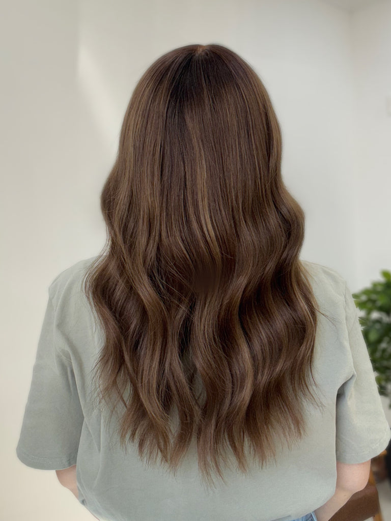 Color: Dimensional milky chestnut brown with a dark espresso level 2 root