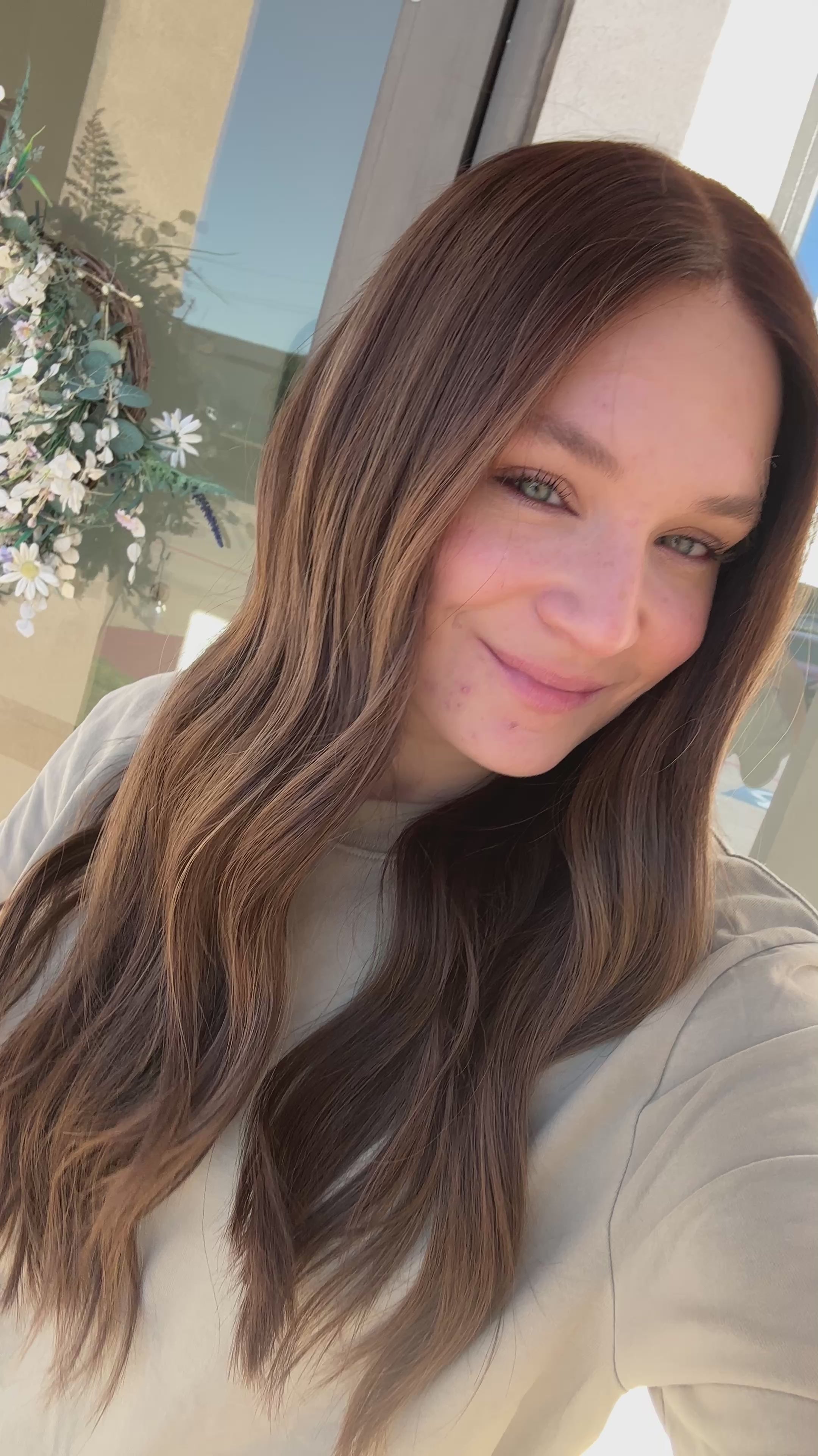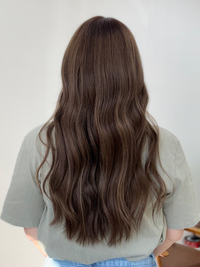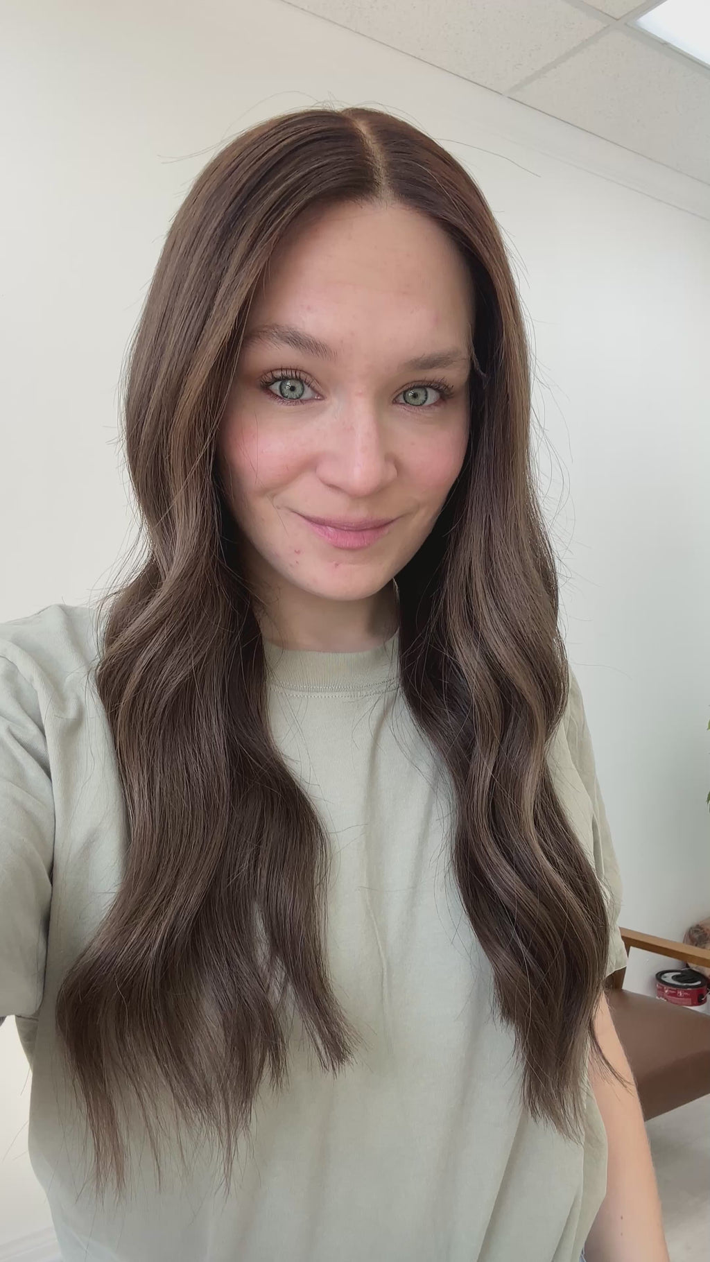 Color: Dimensional milky chestnut brown with a dark espresso level 2 root