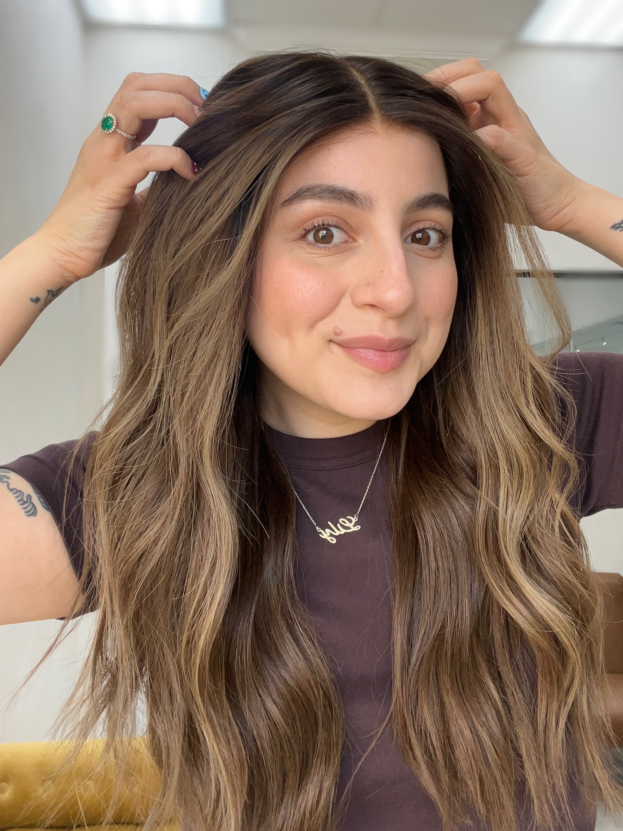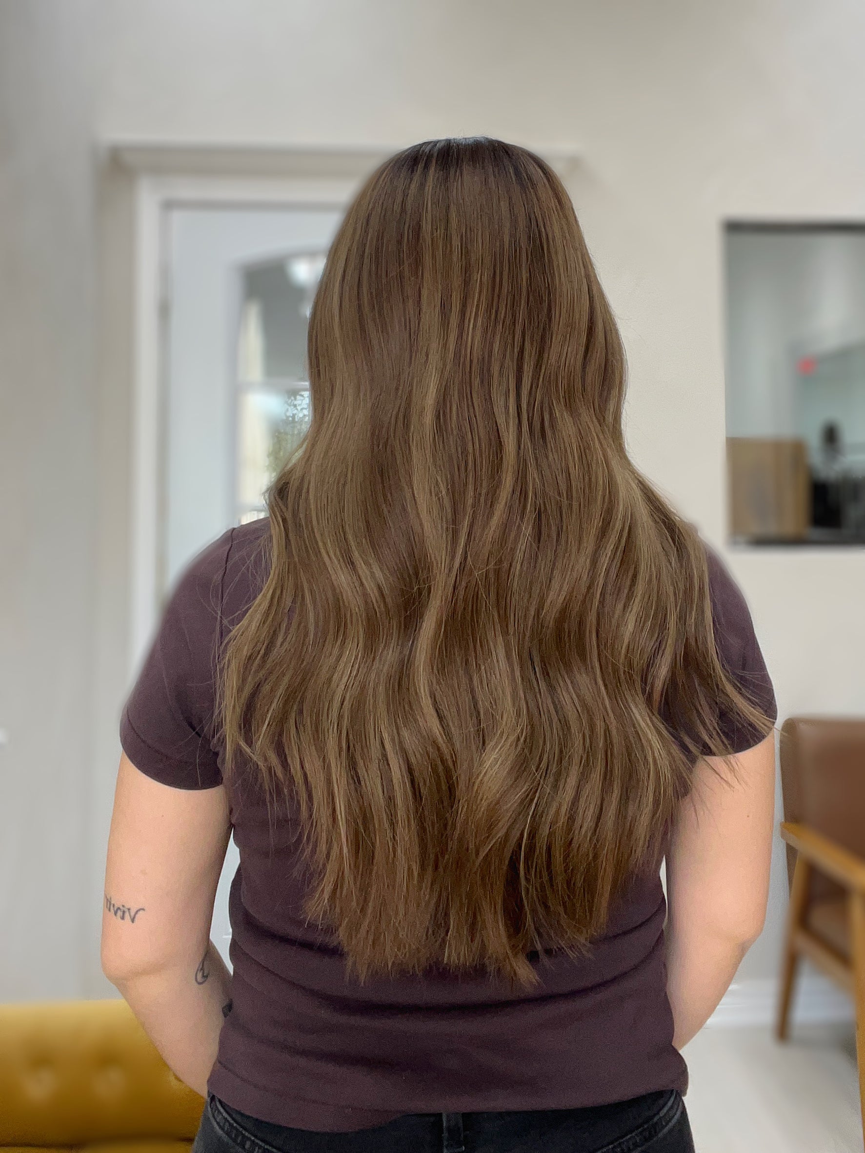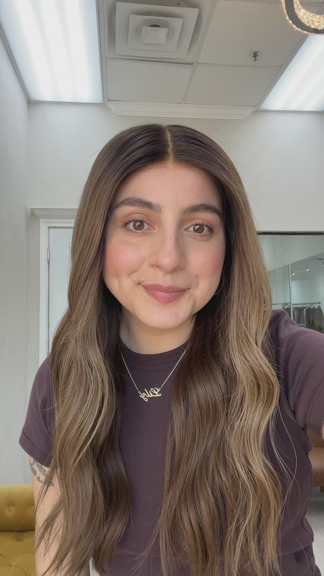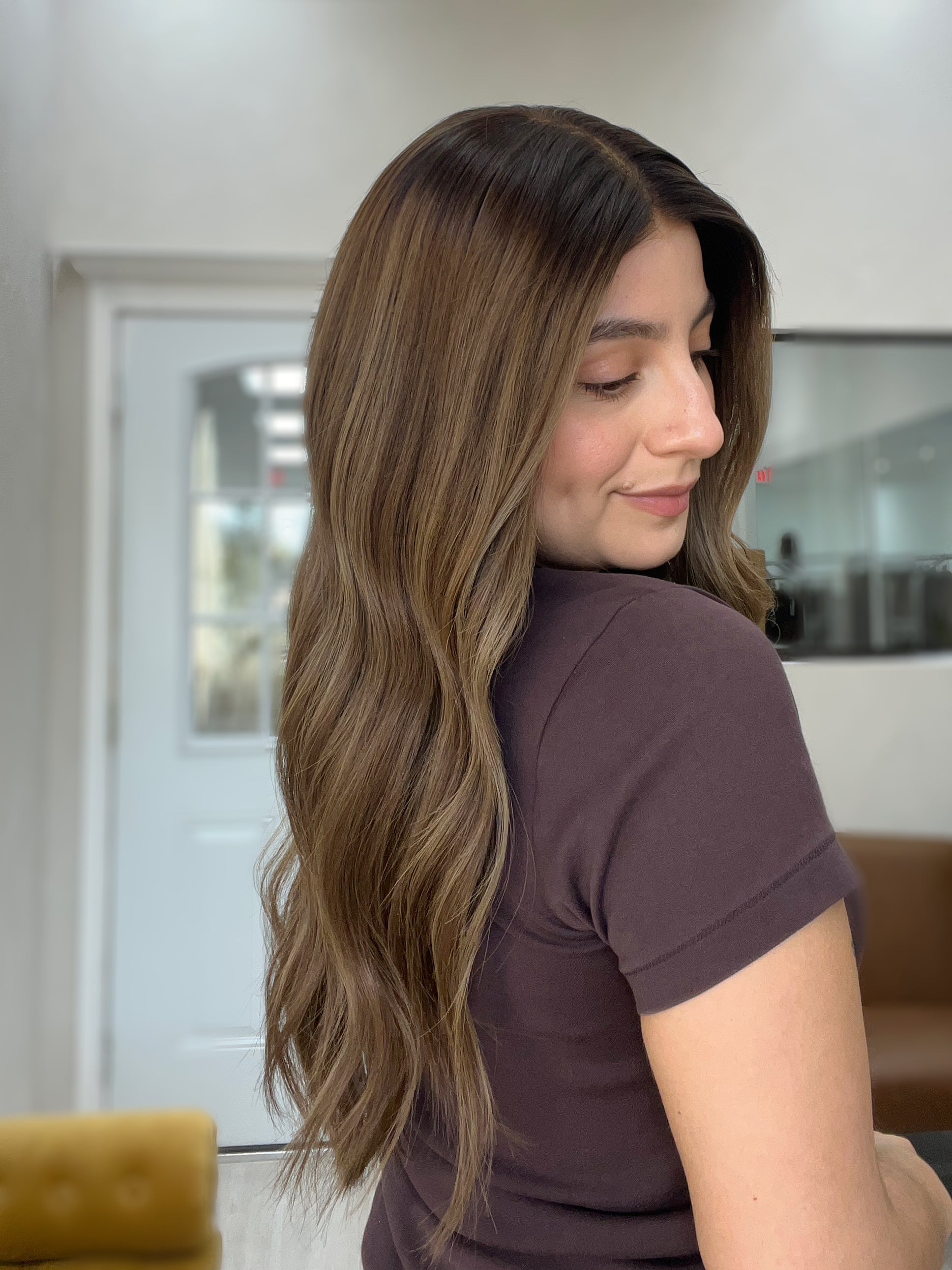 Color: Dimensional milky chestnut brown with a dark espresso level 2 root