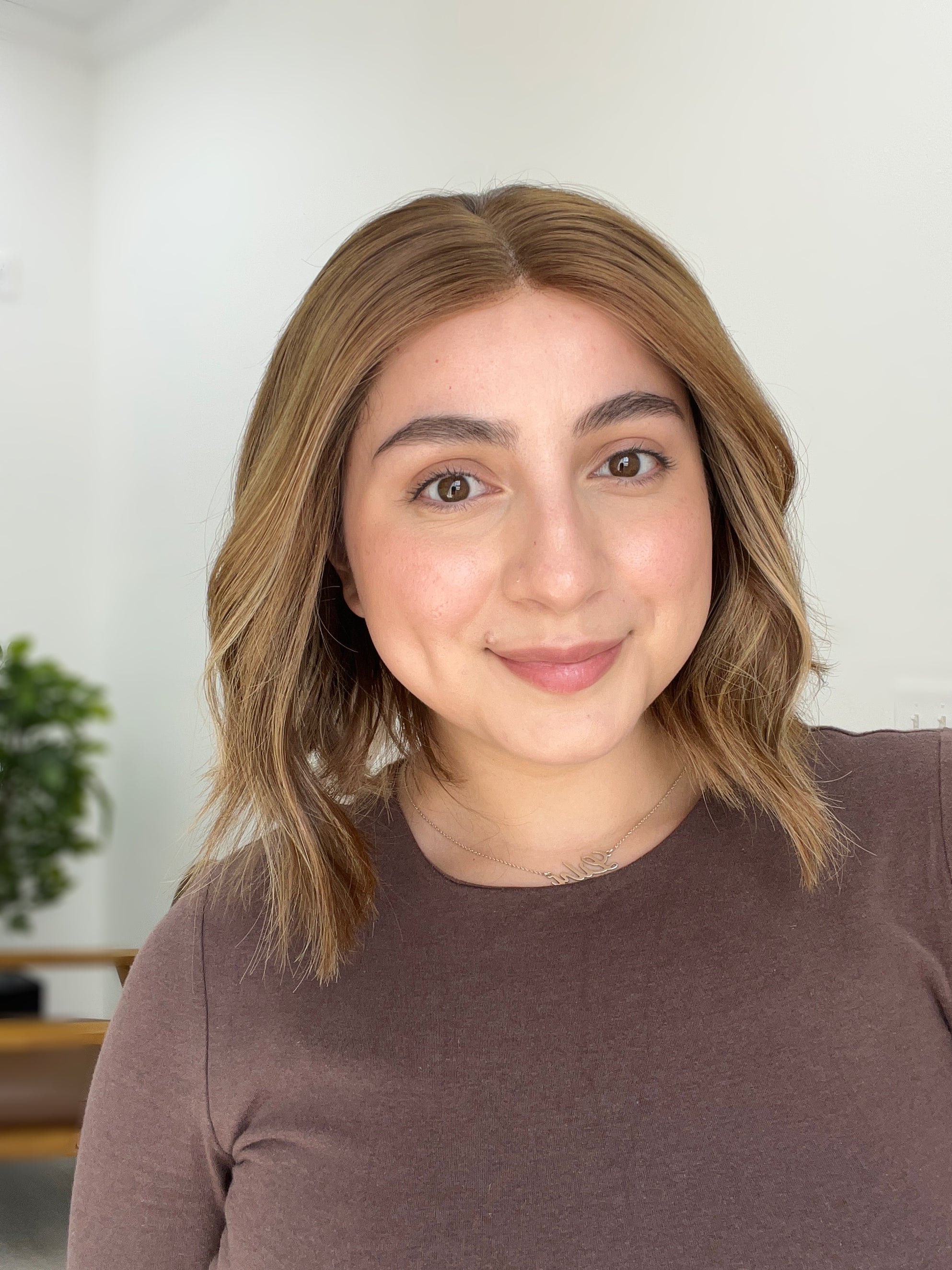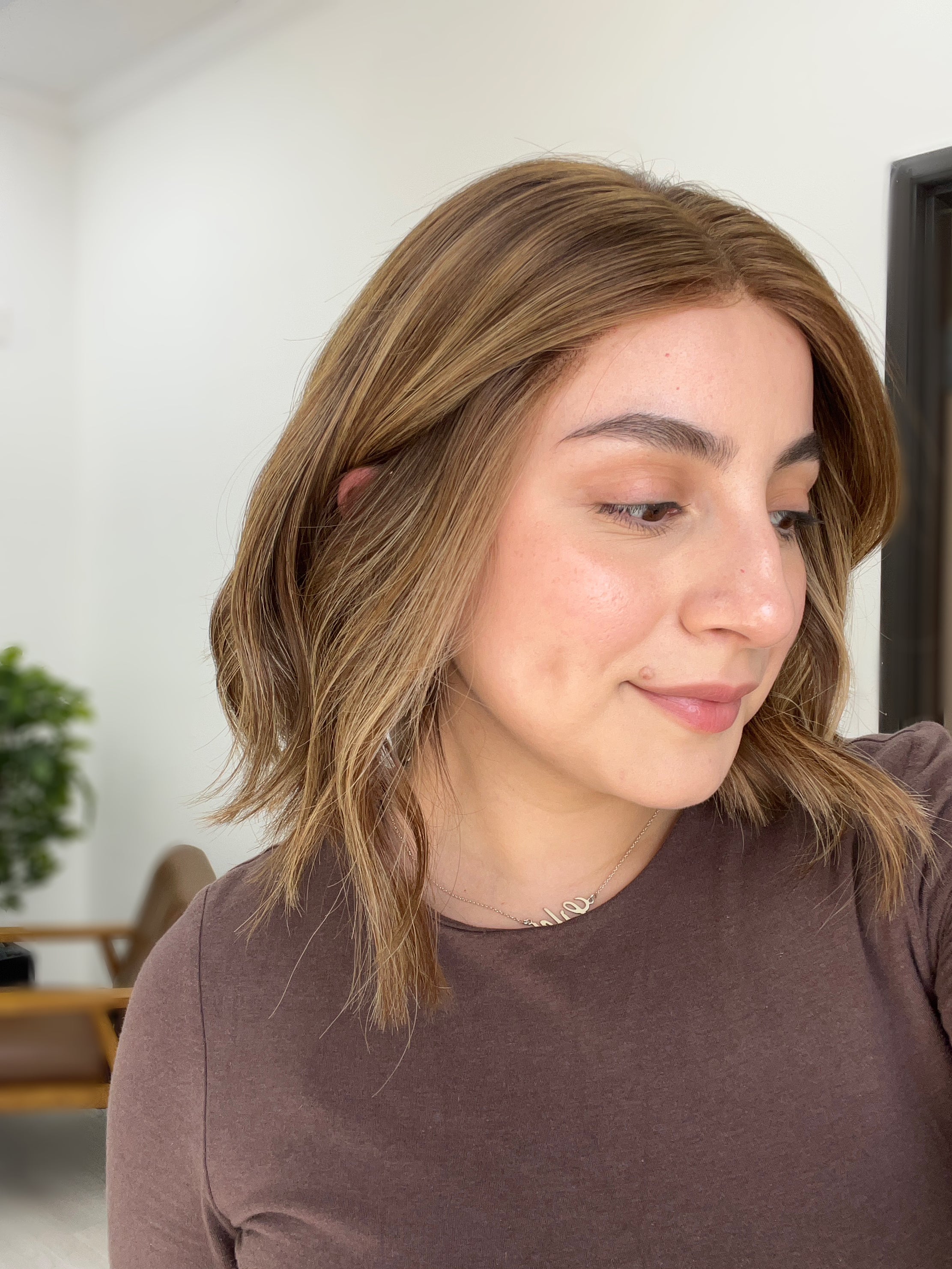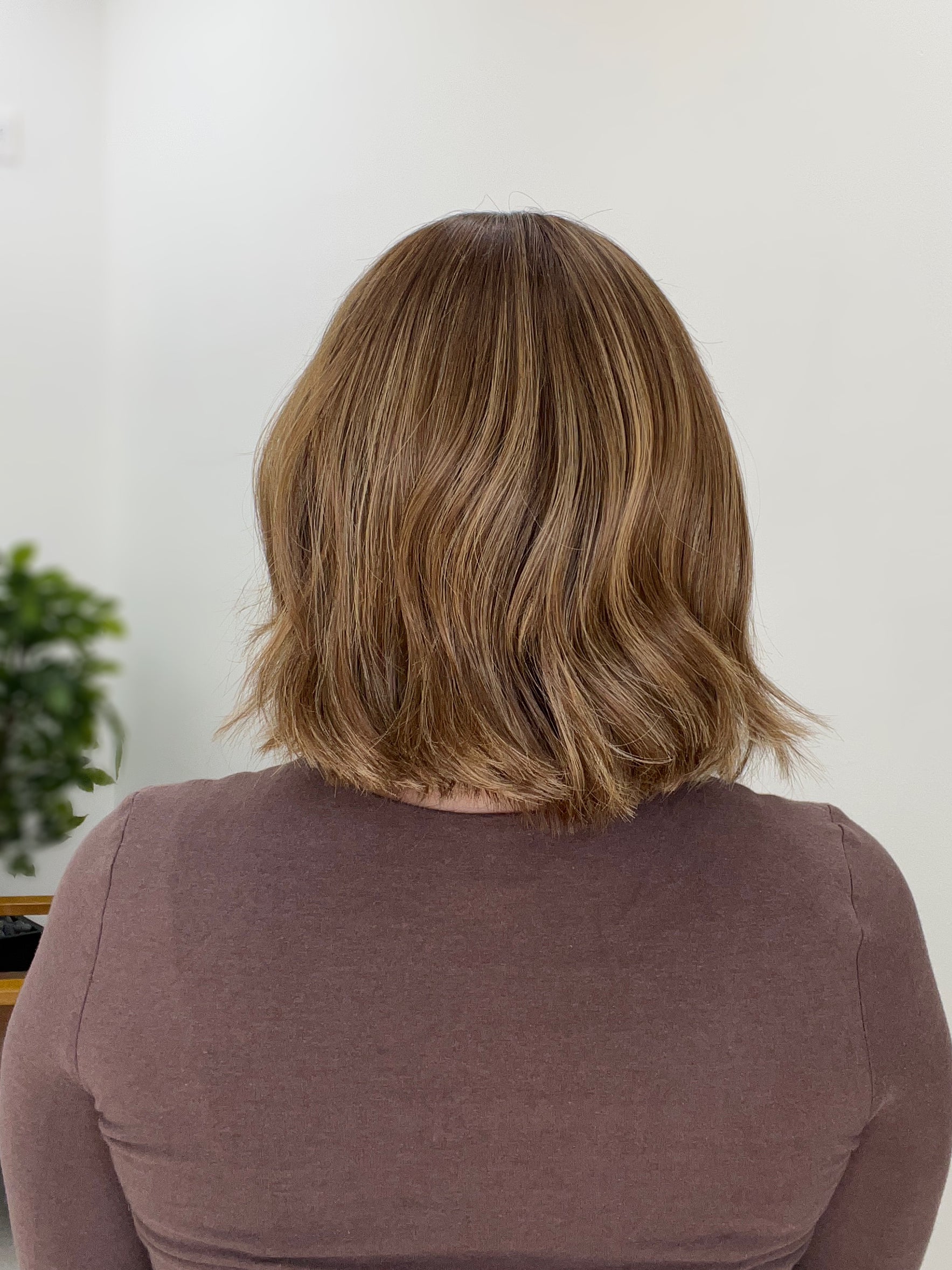 Color: Warm medium brown root and base into a sun kissed chestnut golden blonde balayage